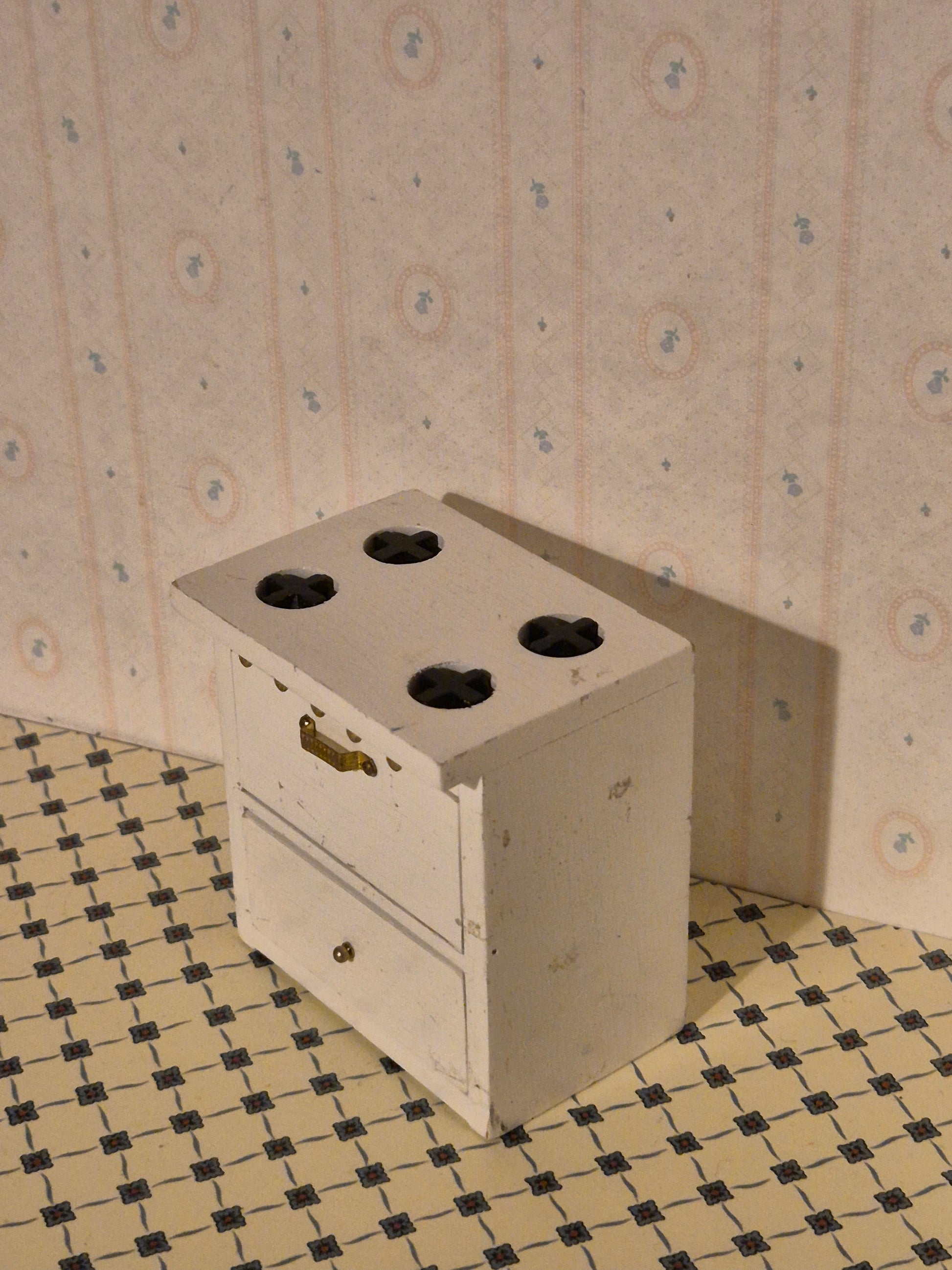 1:12 komfur, hvidt med pletter, skrammer og patina. Ovnlågen er lidt løs. Lidt lavt.