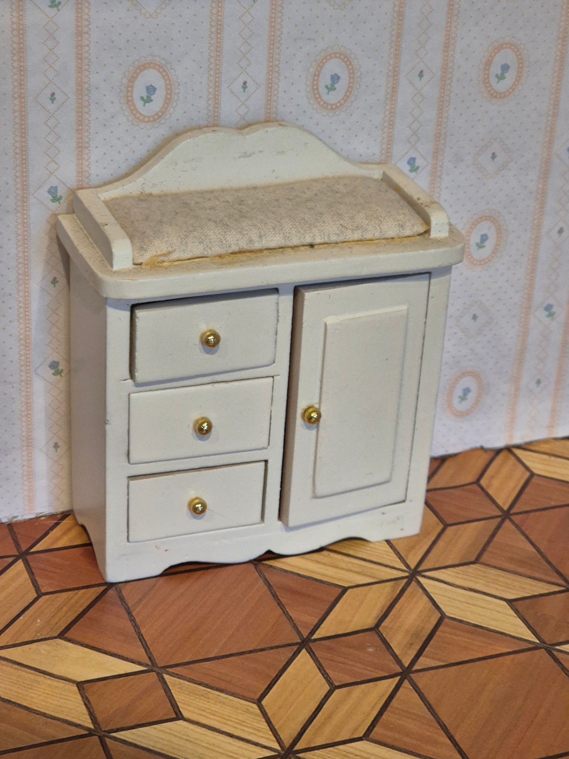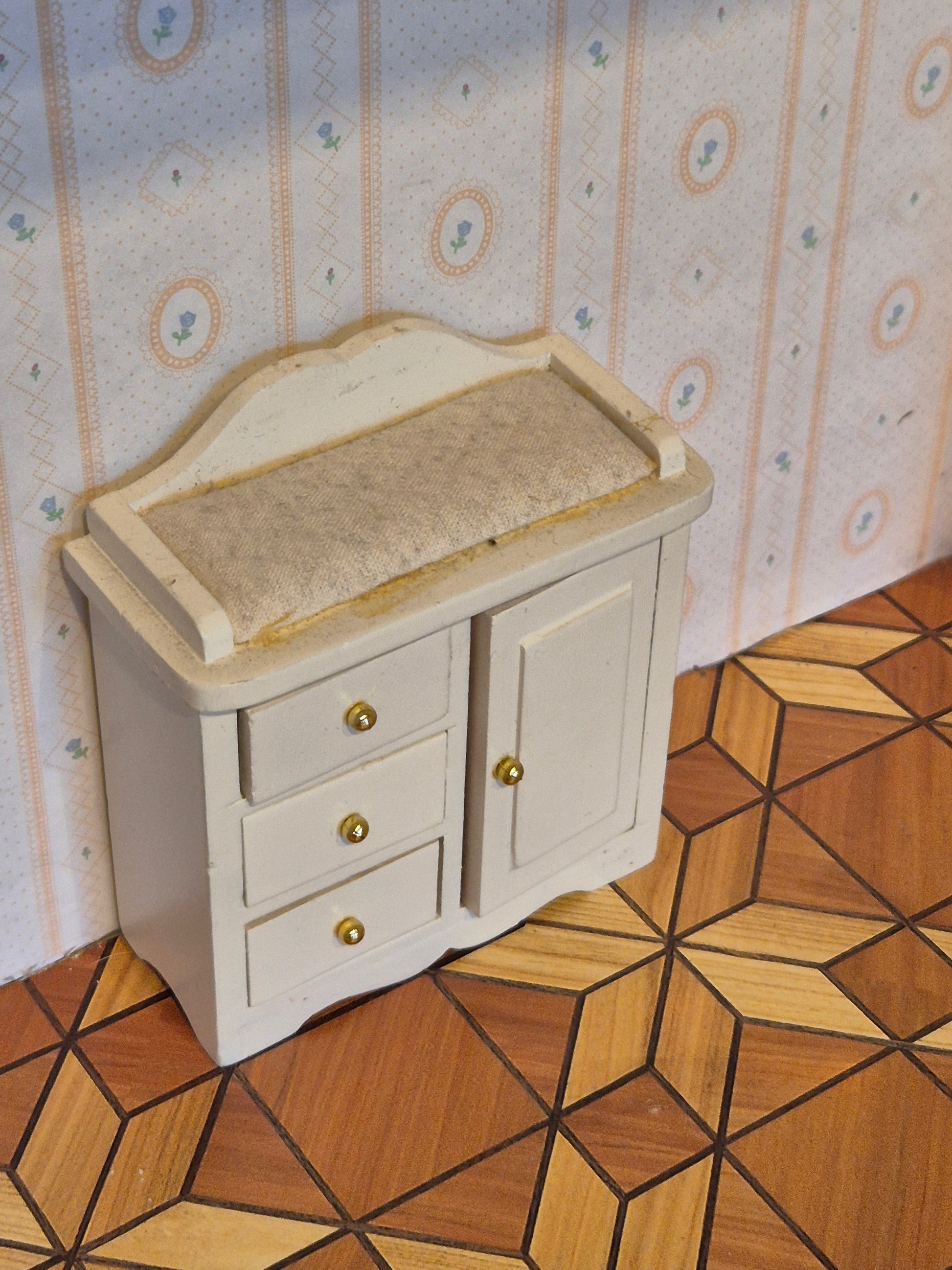 1:12 hvidt puslebord eller skab med puslehynde. Der er lidt gullig limrest i kanten.