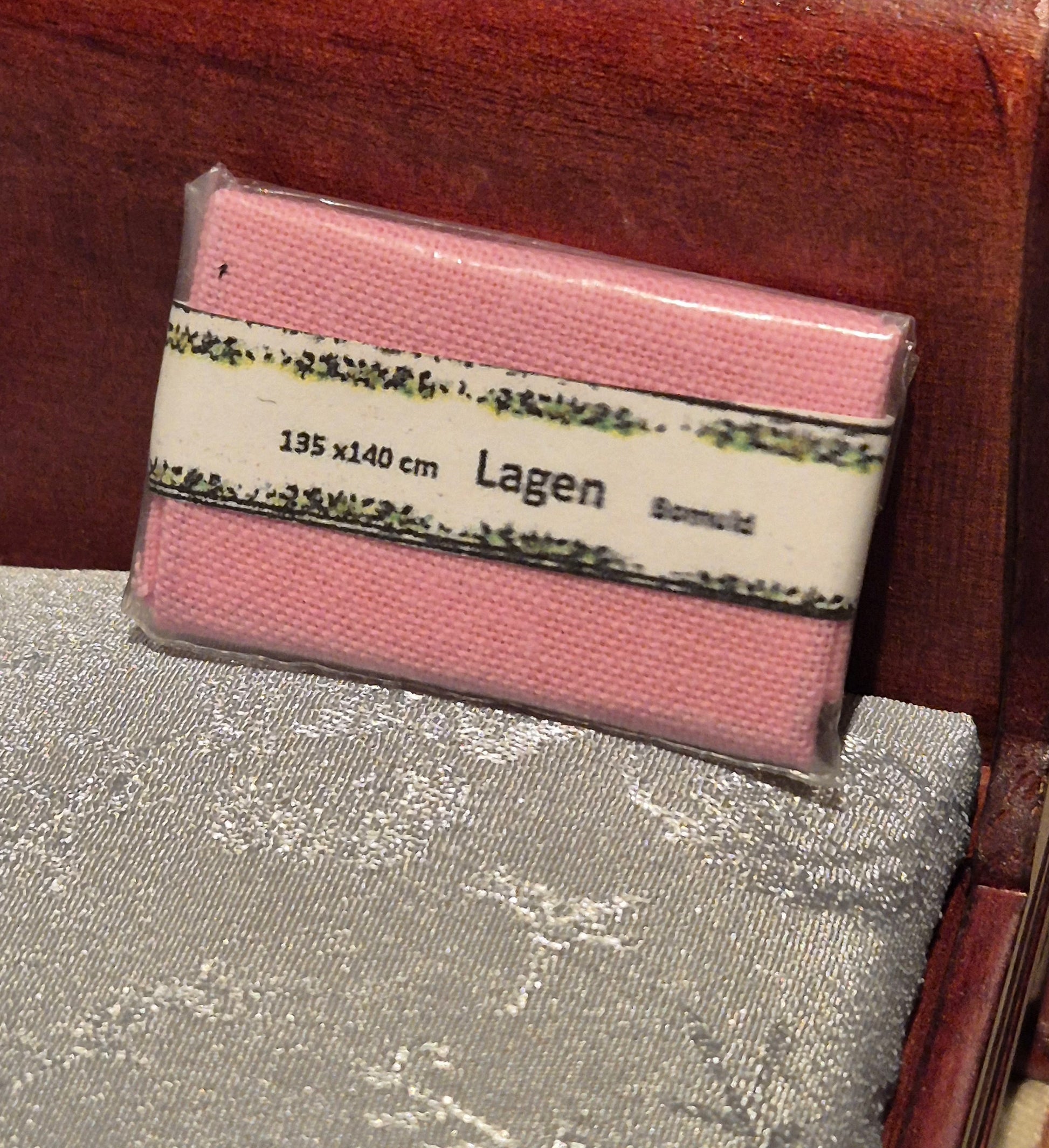 Fin pakke med mørkerosa lagen, linned til sengen.