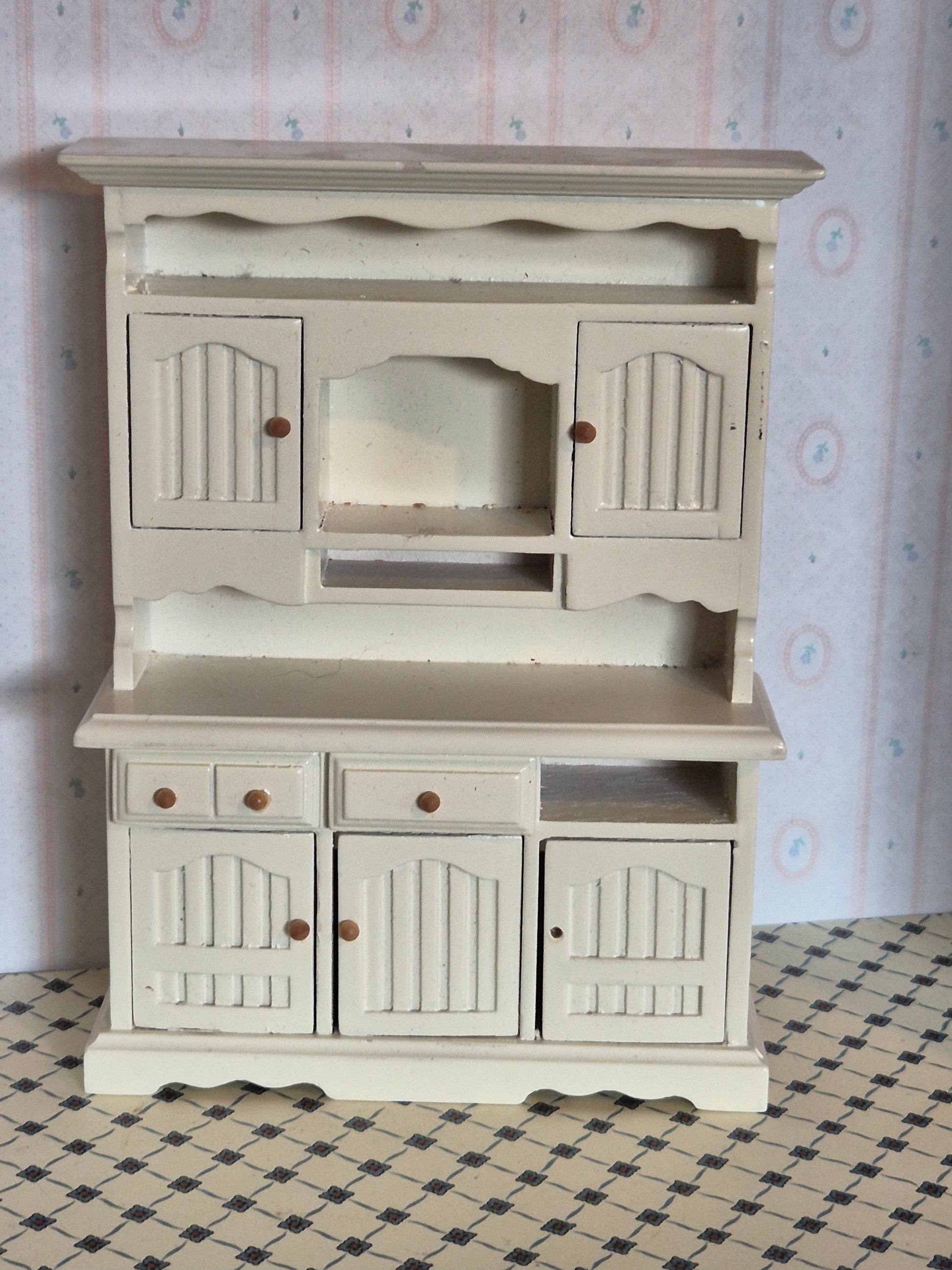Pænt stort 1:12 skab / køkkenskab I hvid træ. Udmærket stand dog mangler en skuffe. Der er nogle brugsspor.