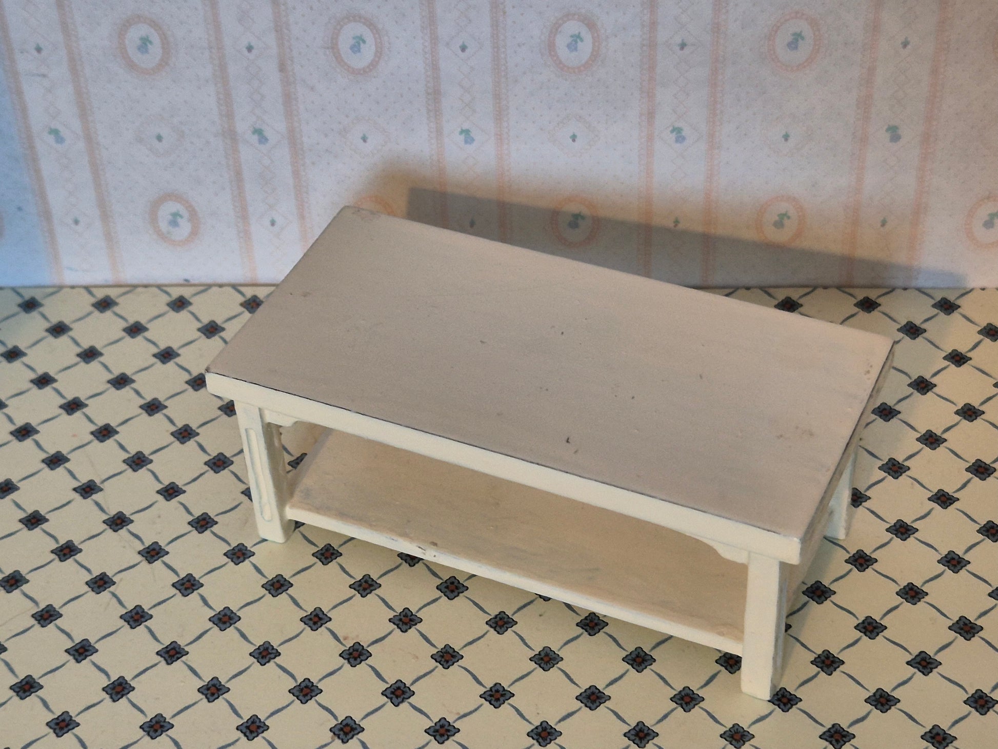Hvidt 1:12 sofabord, rektangulært. Det er af træ og i udmærket stand. Der er lidt patina og spor efter brug.