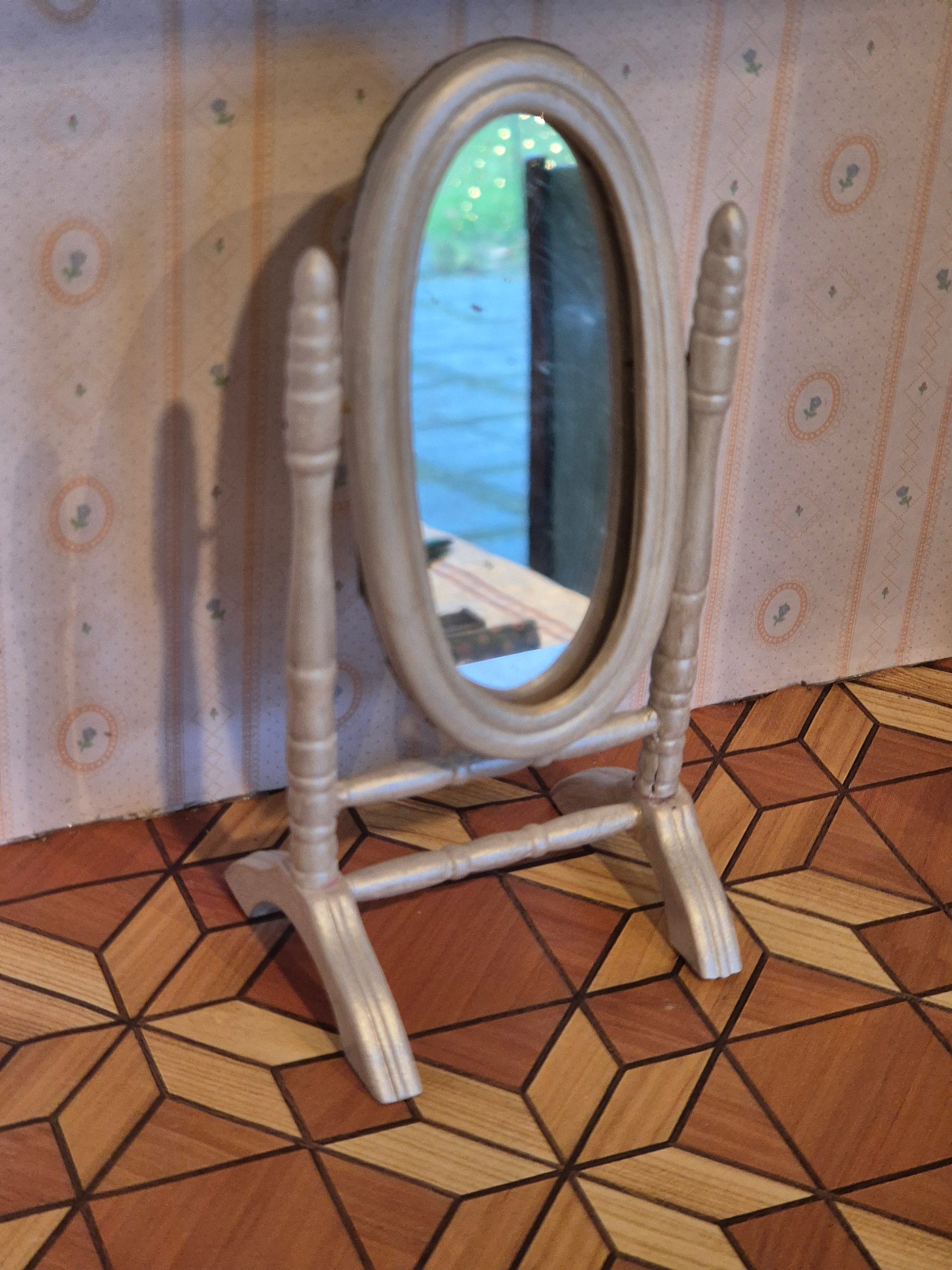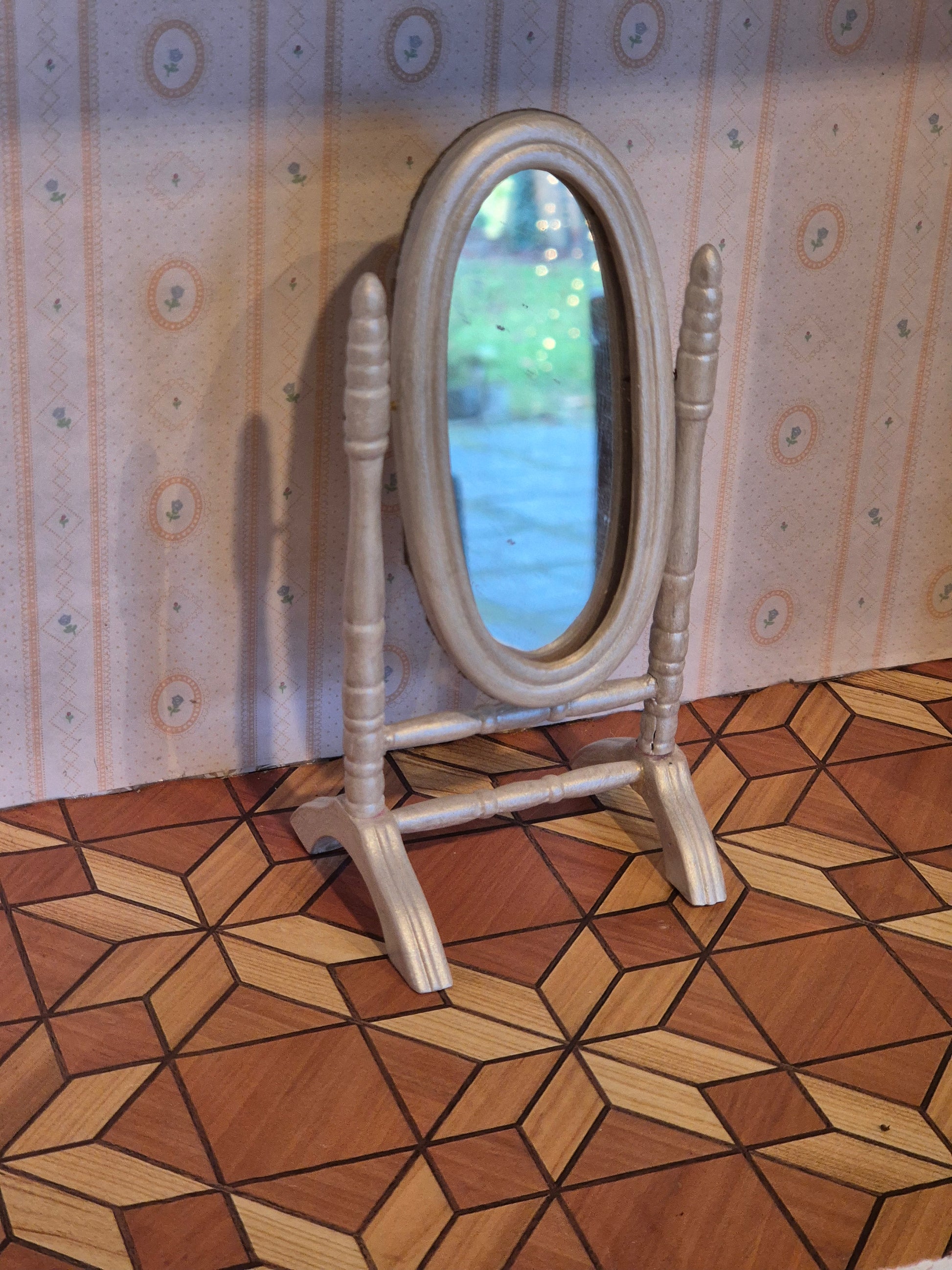Spejl 1:12 med ramme malet i sølv / hvidligt maling, renoveret.