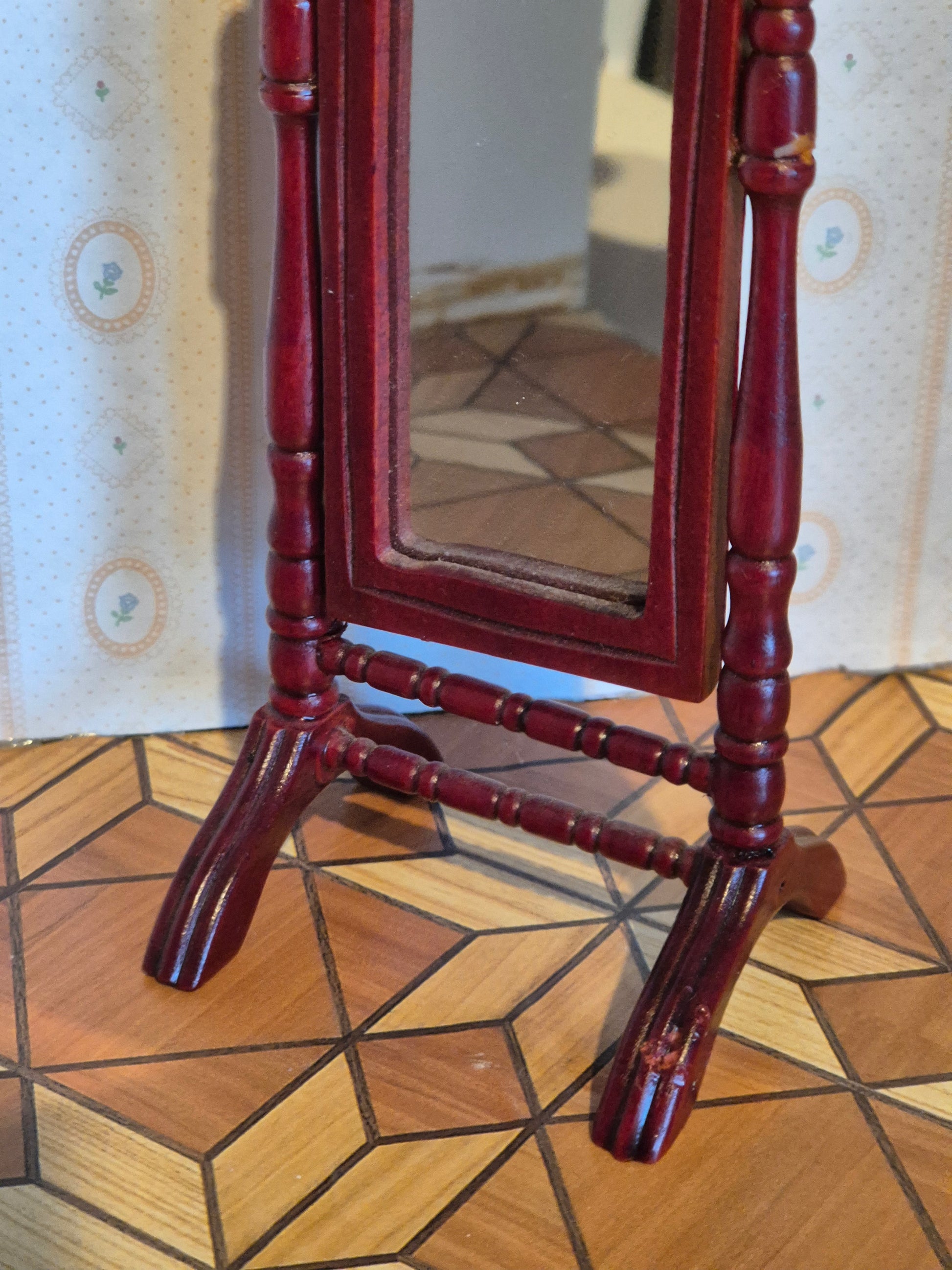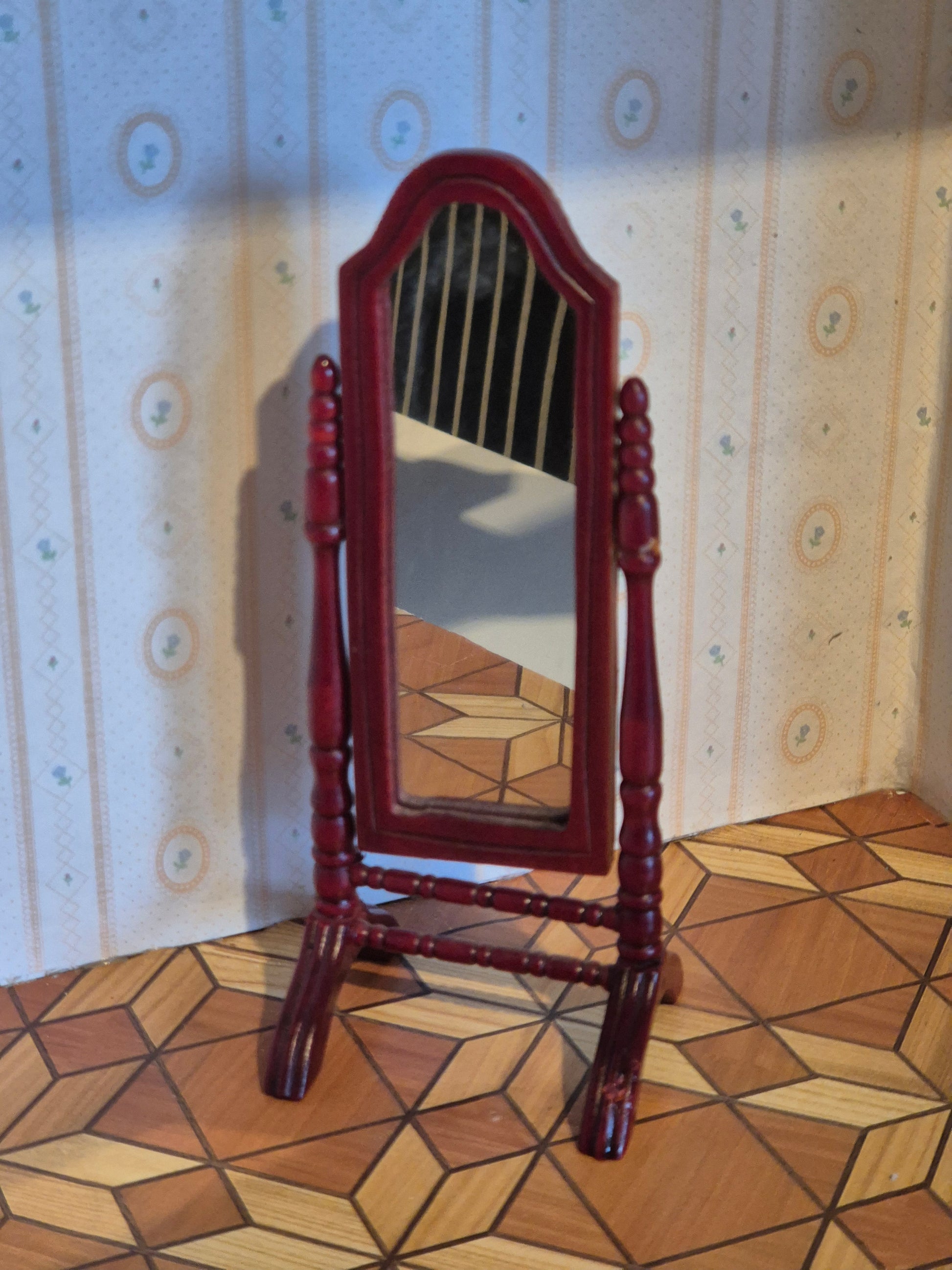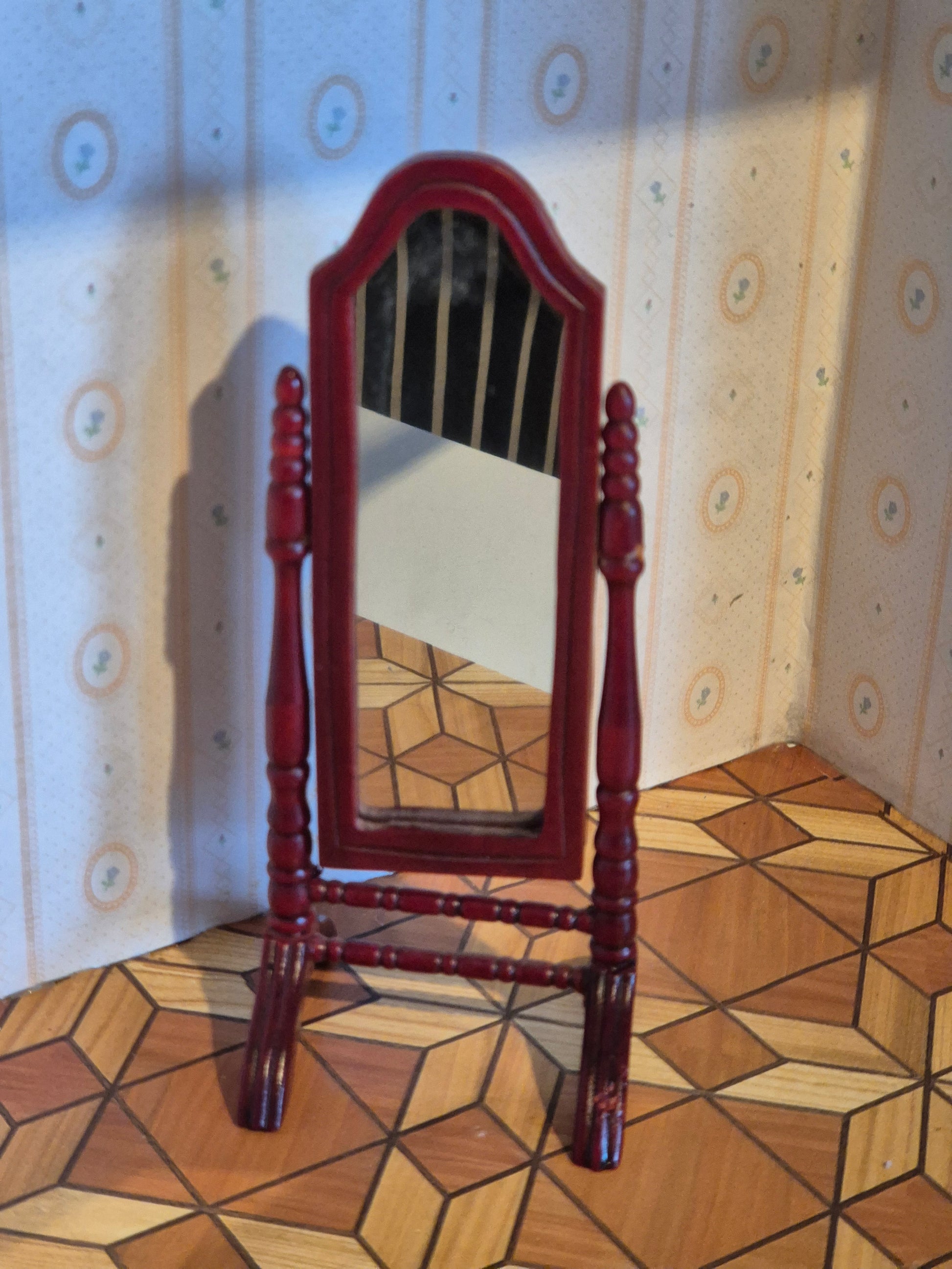 Stående spejl med brun ramme og fod, den vipper lidt. Pæn.