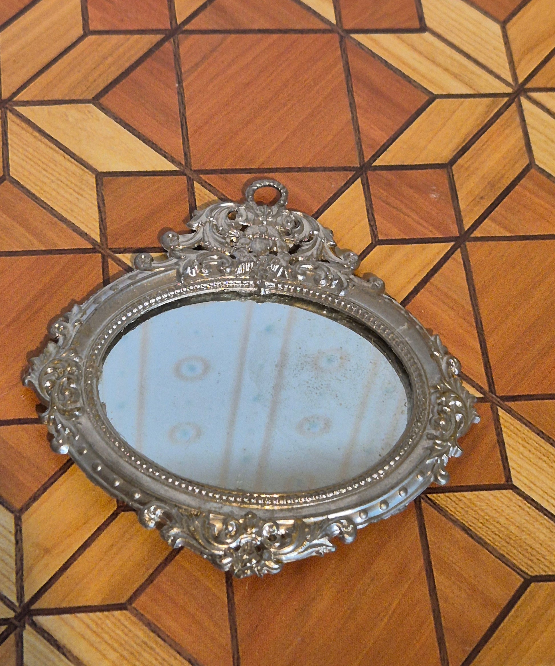 1:12 Stort spejl i metal ramme med ophæng. Det er ældre, men pænt. Der er lidt patina.