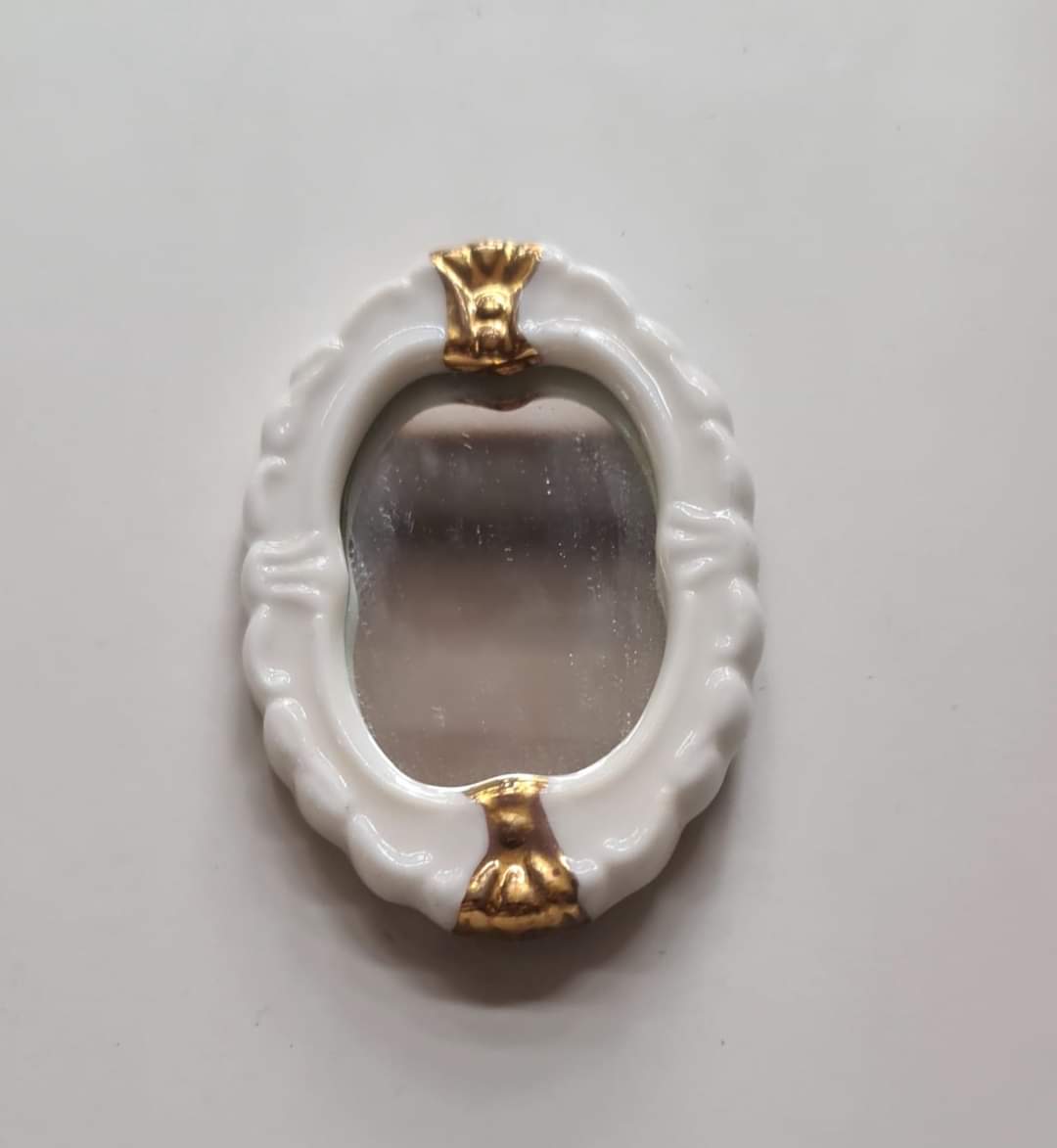 Fint ovalt spejl i str 1:12 med kraftig porcelænskant med gyldne detaljer. Spejlet har noget rokoko stil over sig.