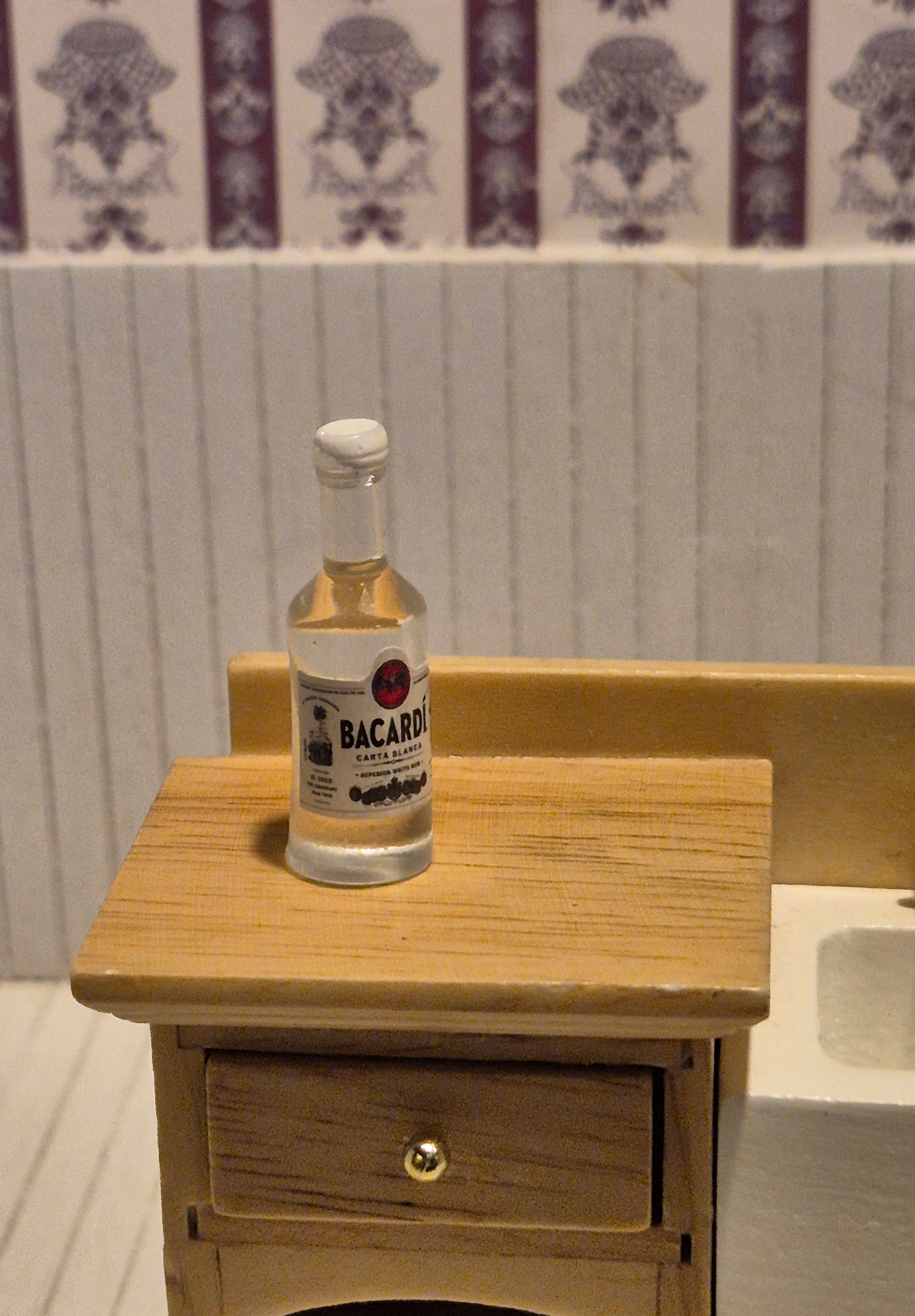 Pæn flaske hvid Barcardi spiritus til dukkehuset. Den er 2,8 cm høj. Pæn god størrelse. Kan fint bruges til 1:12 og egner sig fint til jul fx nissehus.