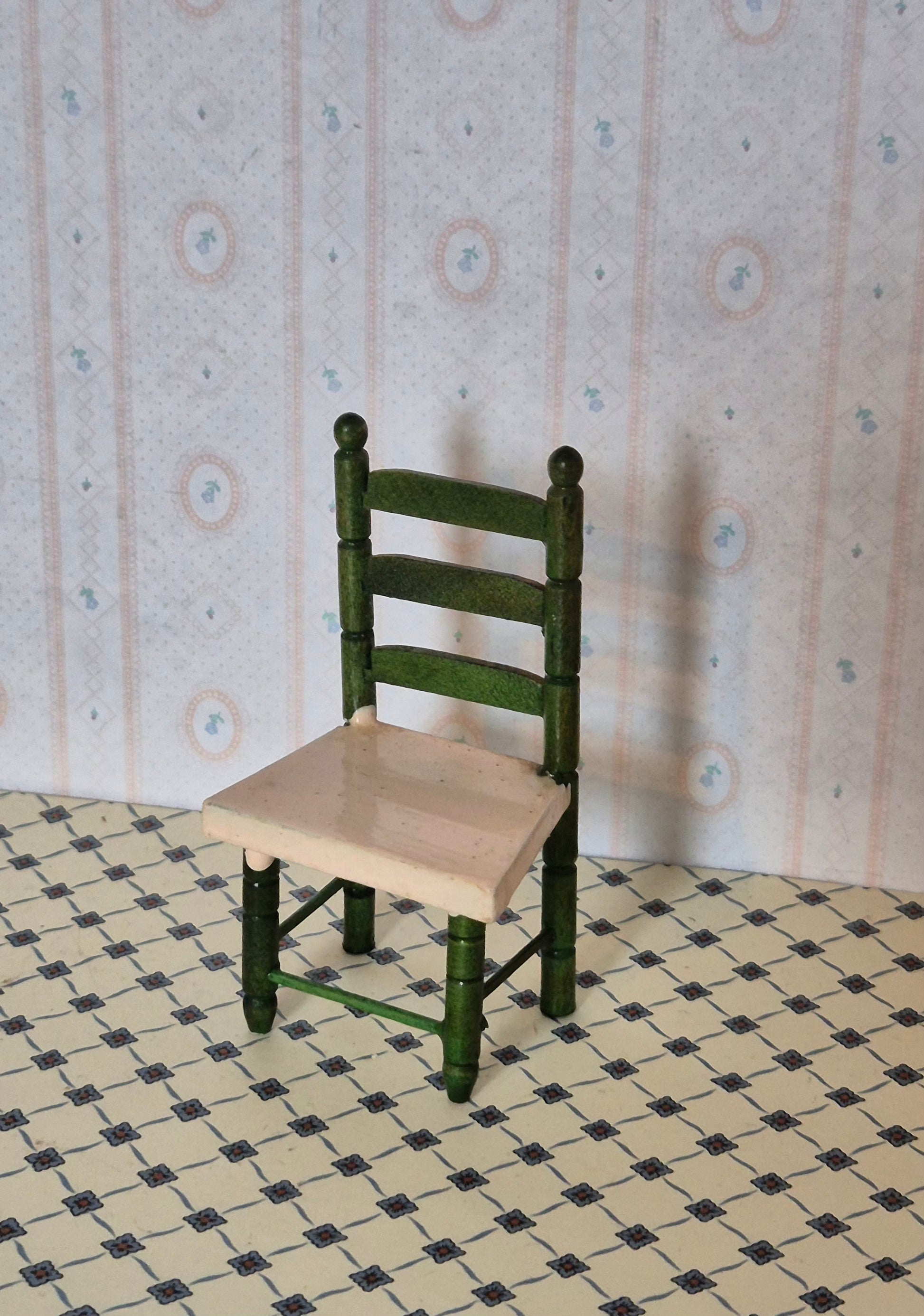 Udmærket stol af træ i grøn og hvid. Der er patina og brugsspor.