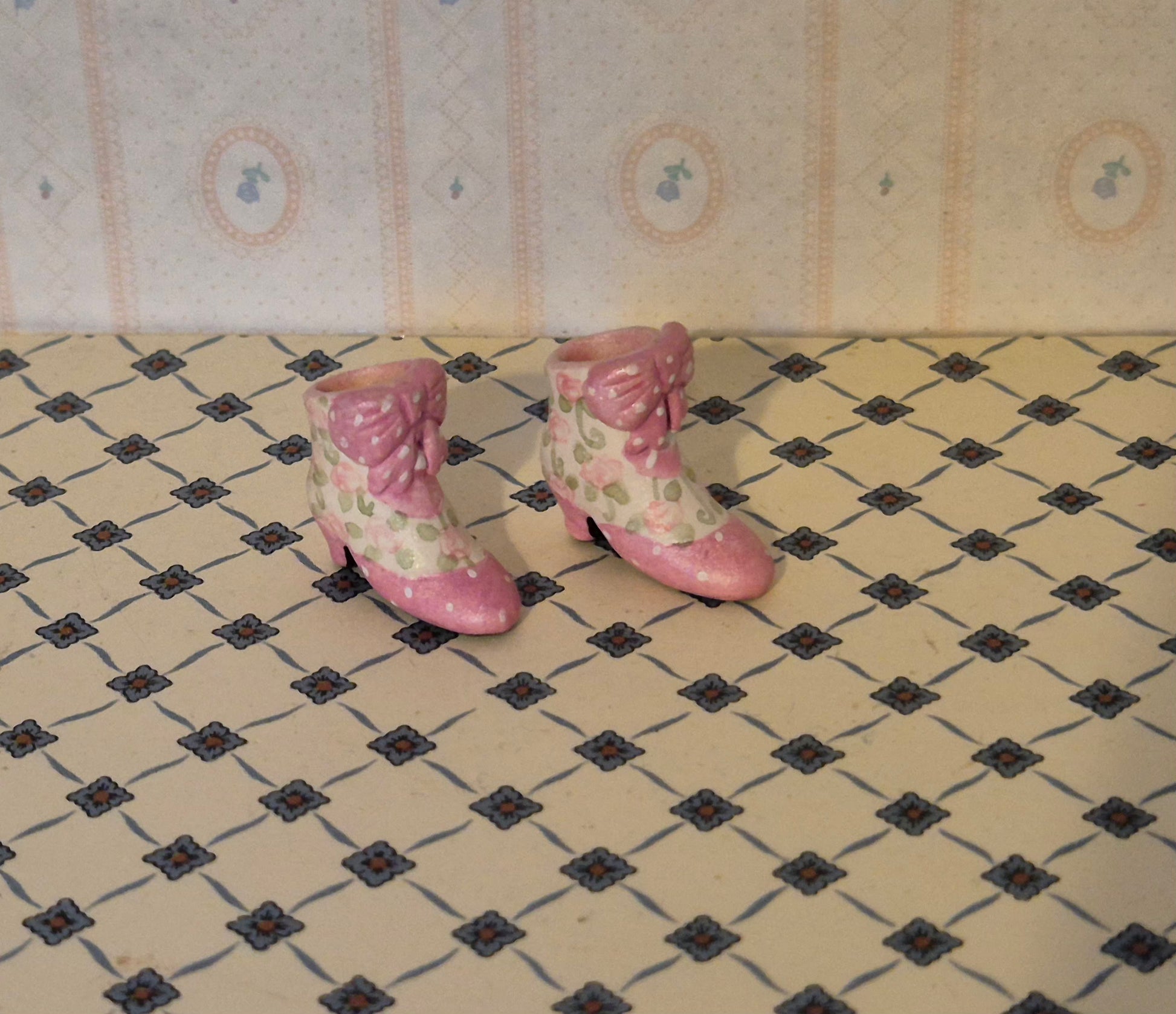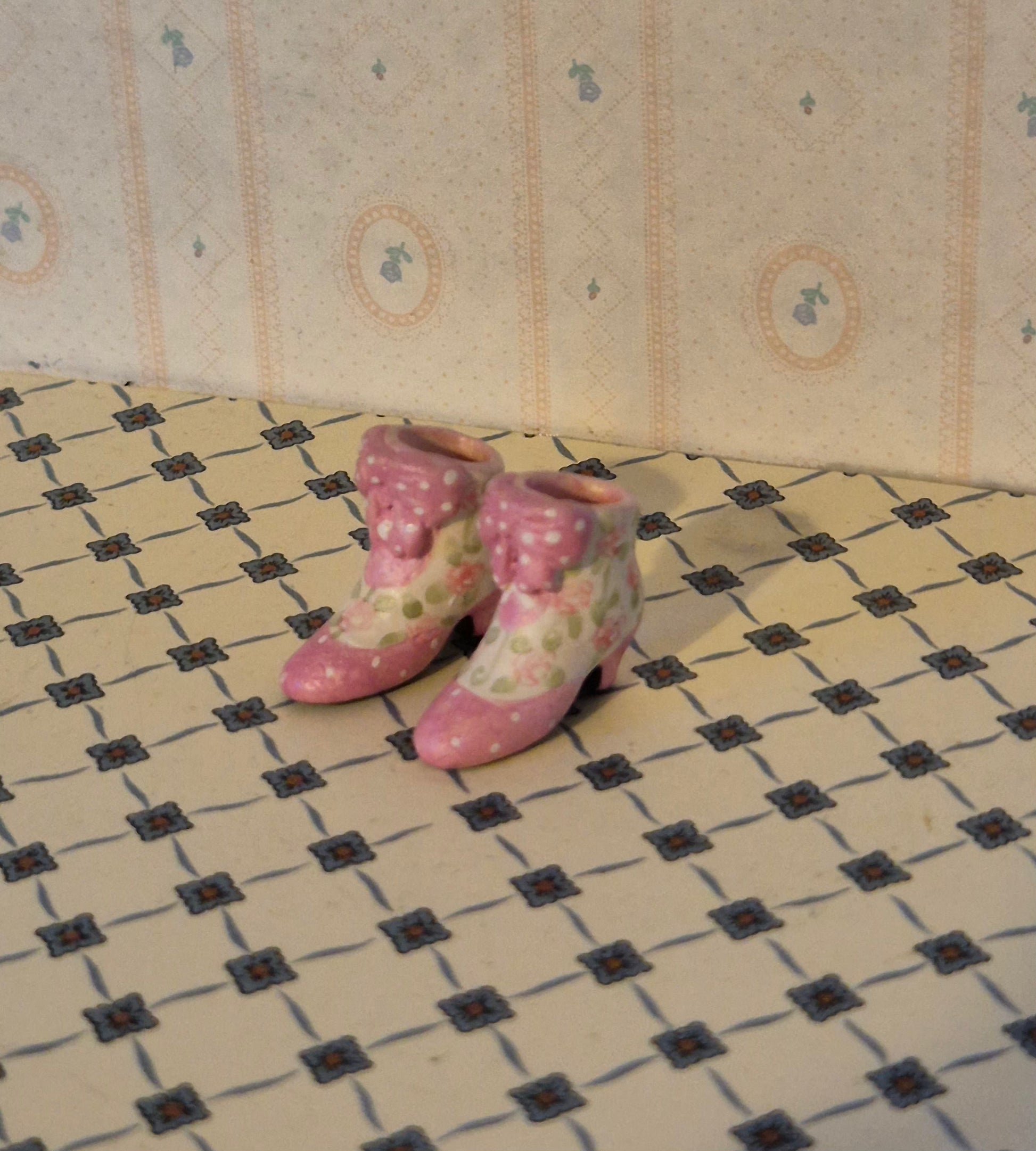 Pæne 1:12 støvler, lyserød med mønster. Det er resin. God fin stand. Pænt par sko.