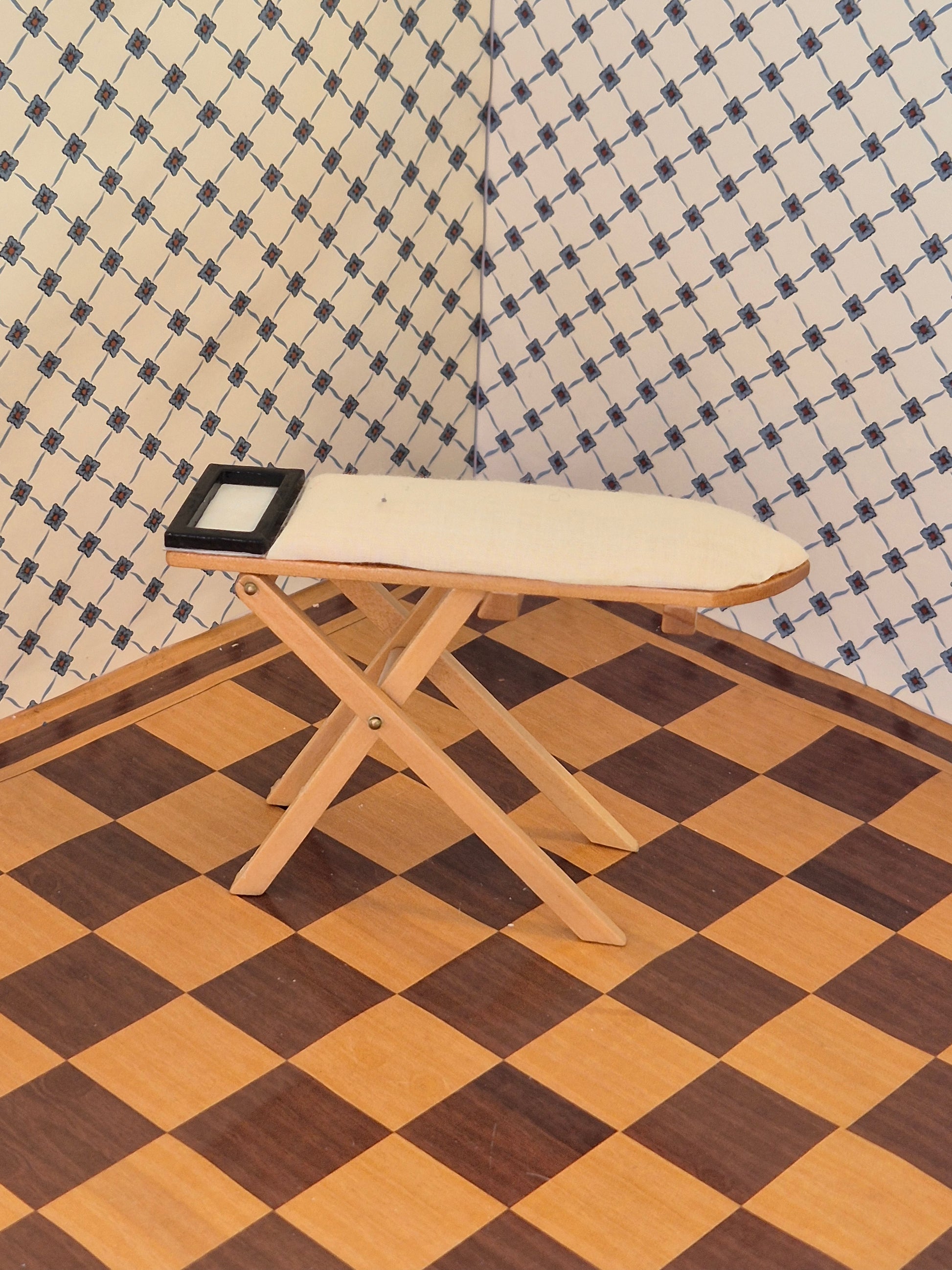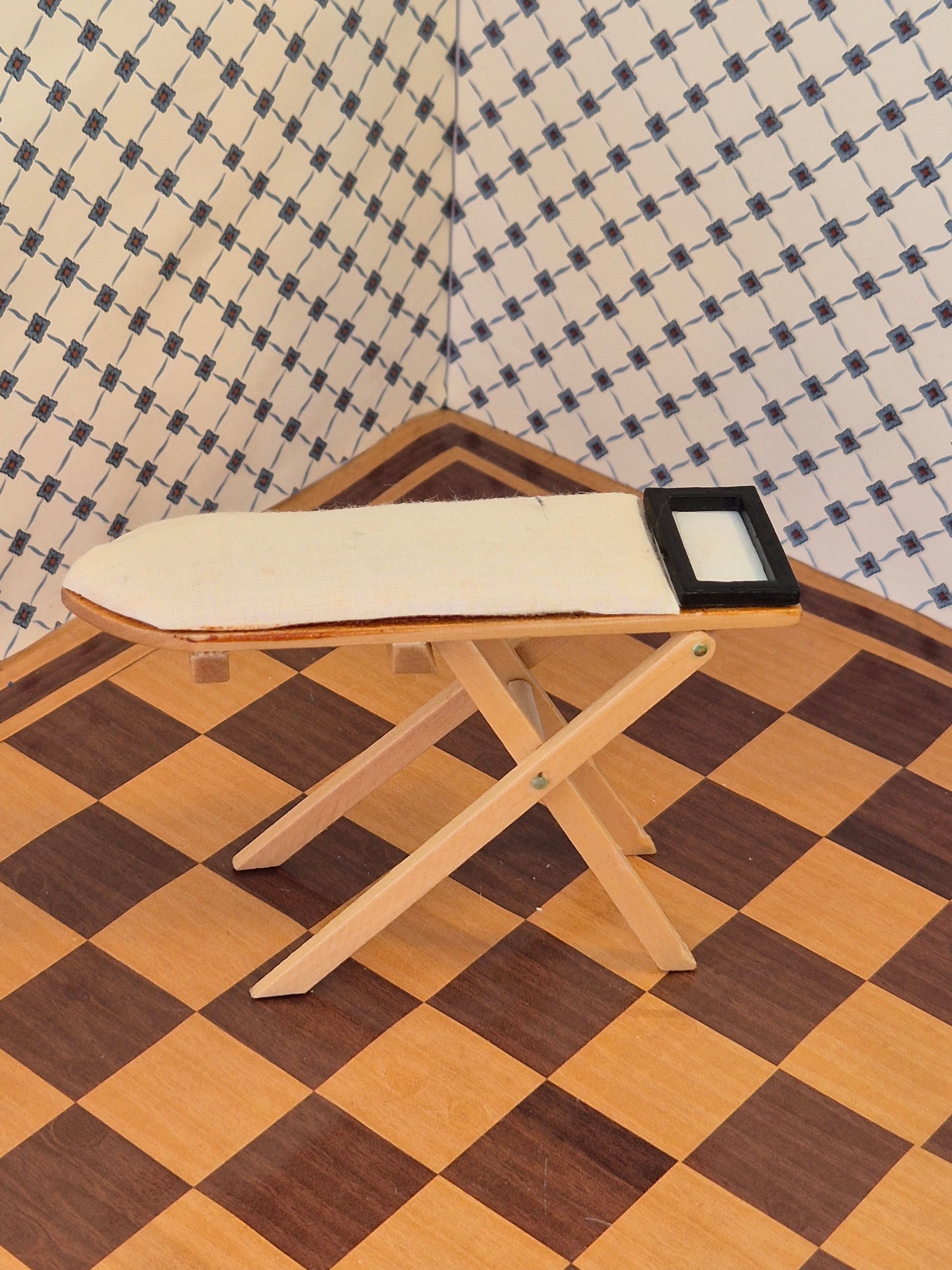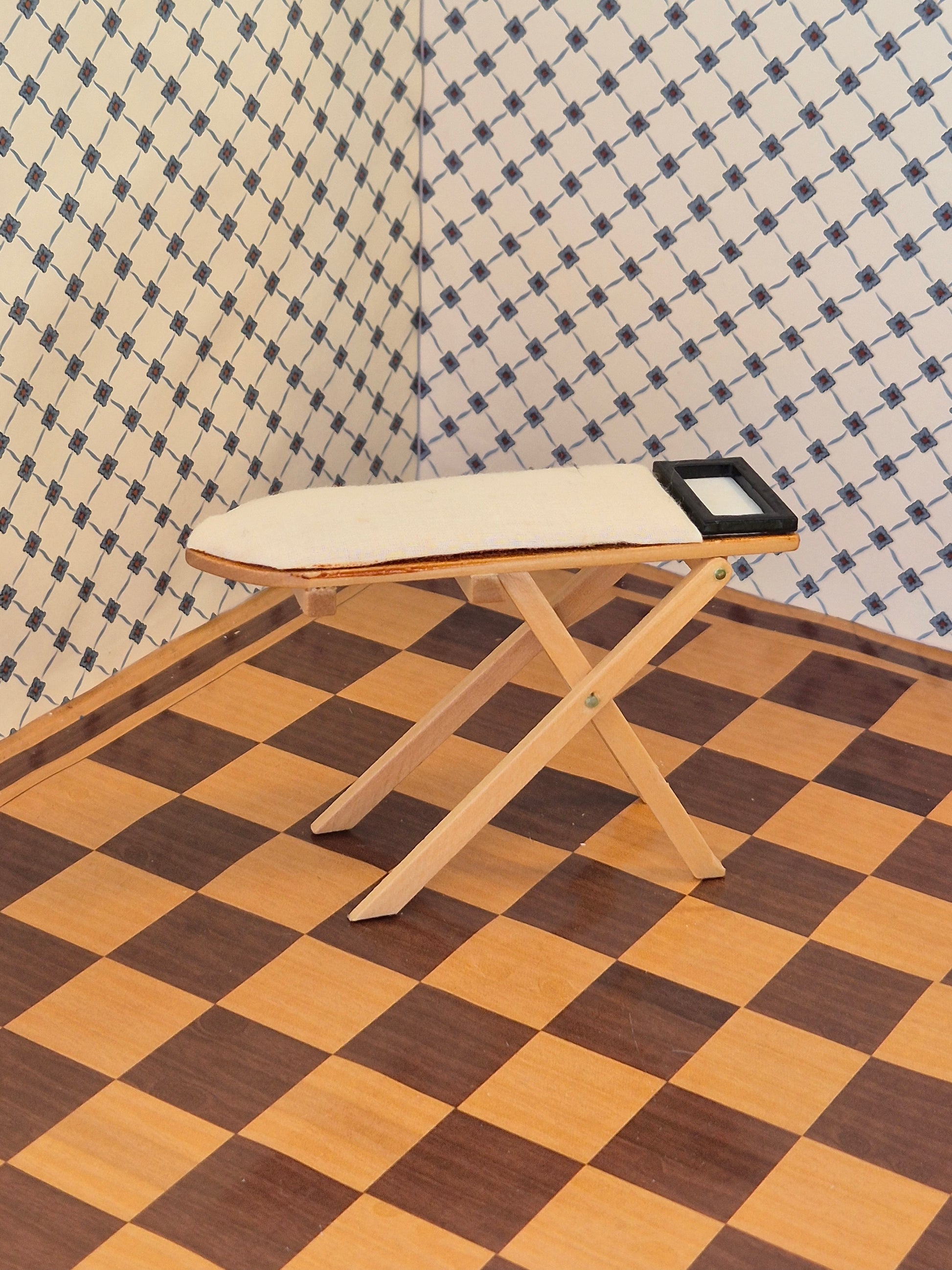 Udmærket 1:12 strygebræt af træ og stof, der er limet i stellet, så det ikke kan foldes. Ellers god stand.