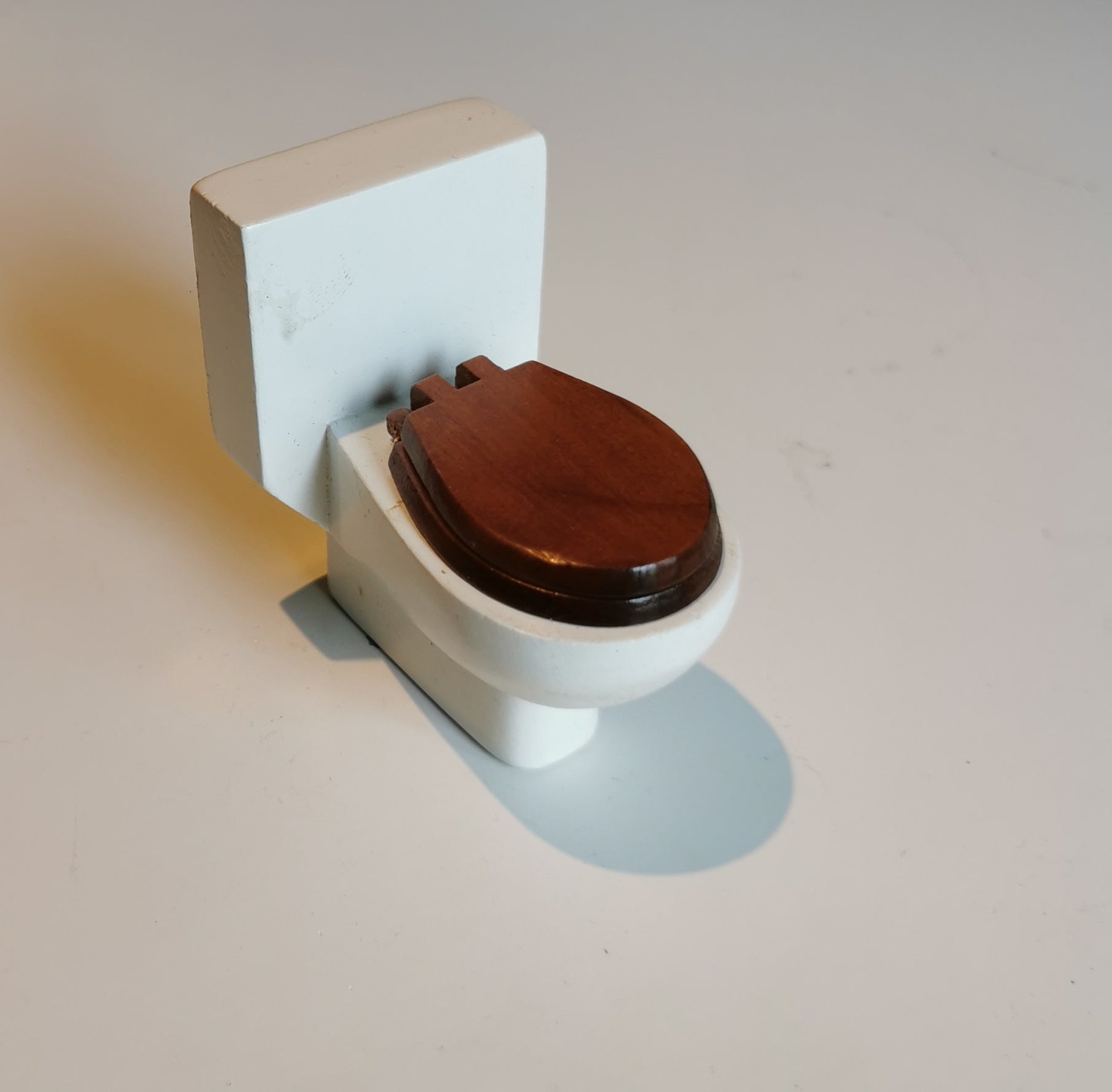 Pænt toilet str 1:12. Det er hvidt træ med mørkt bræt.