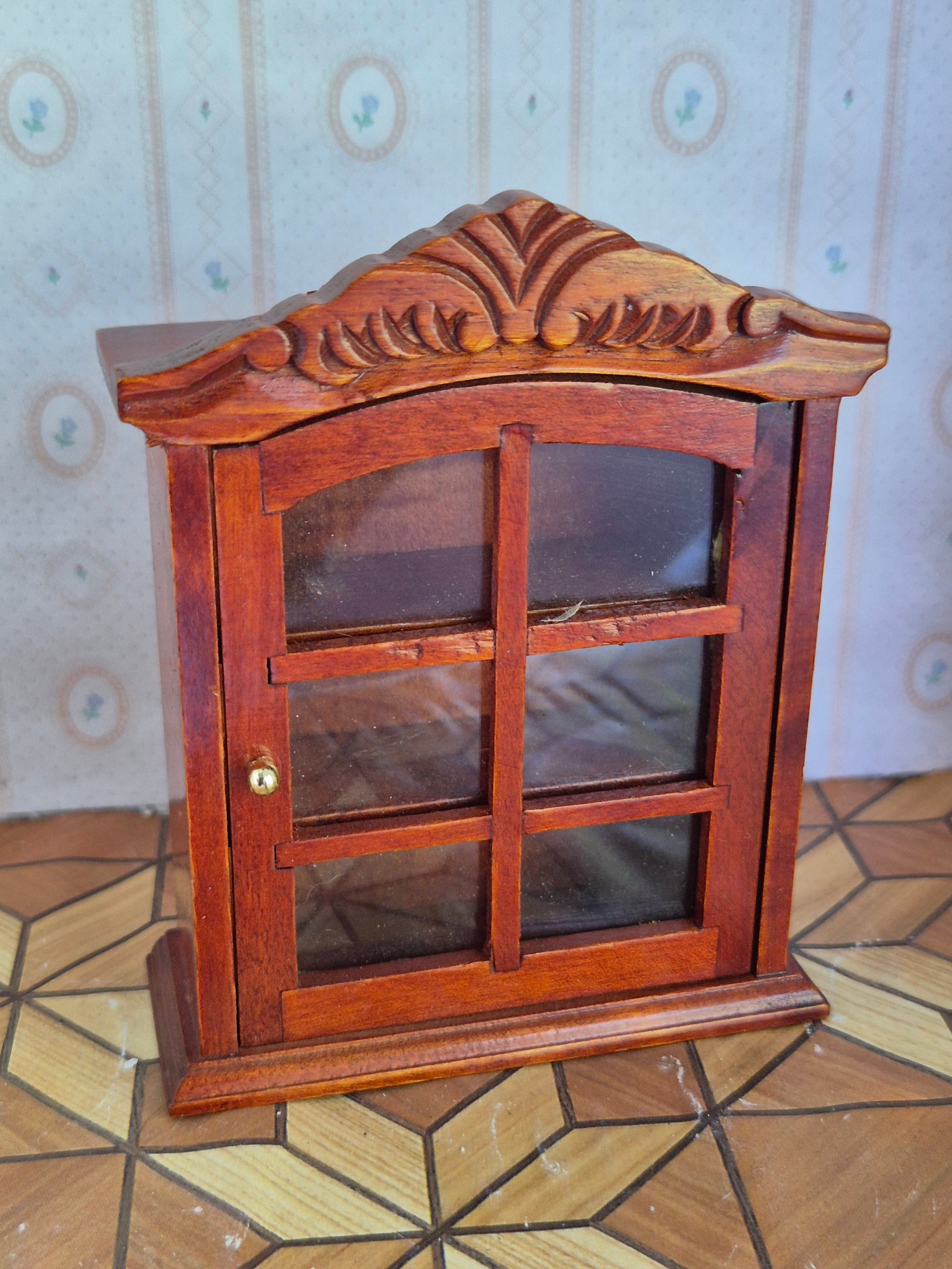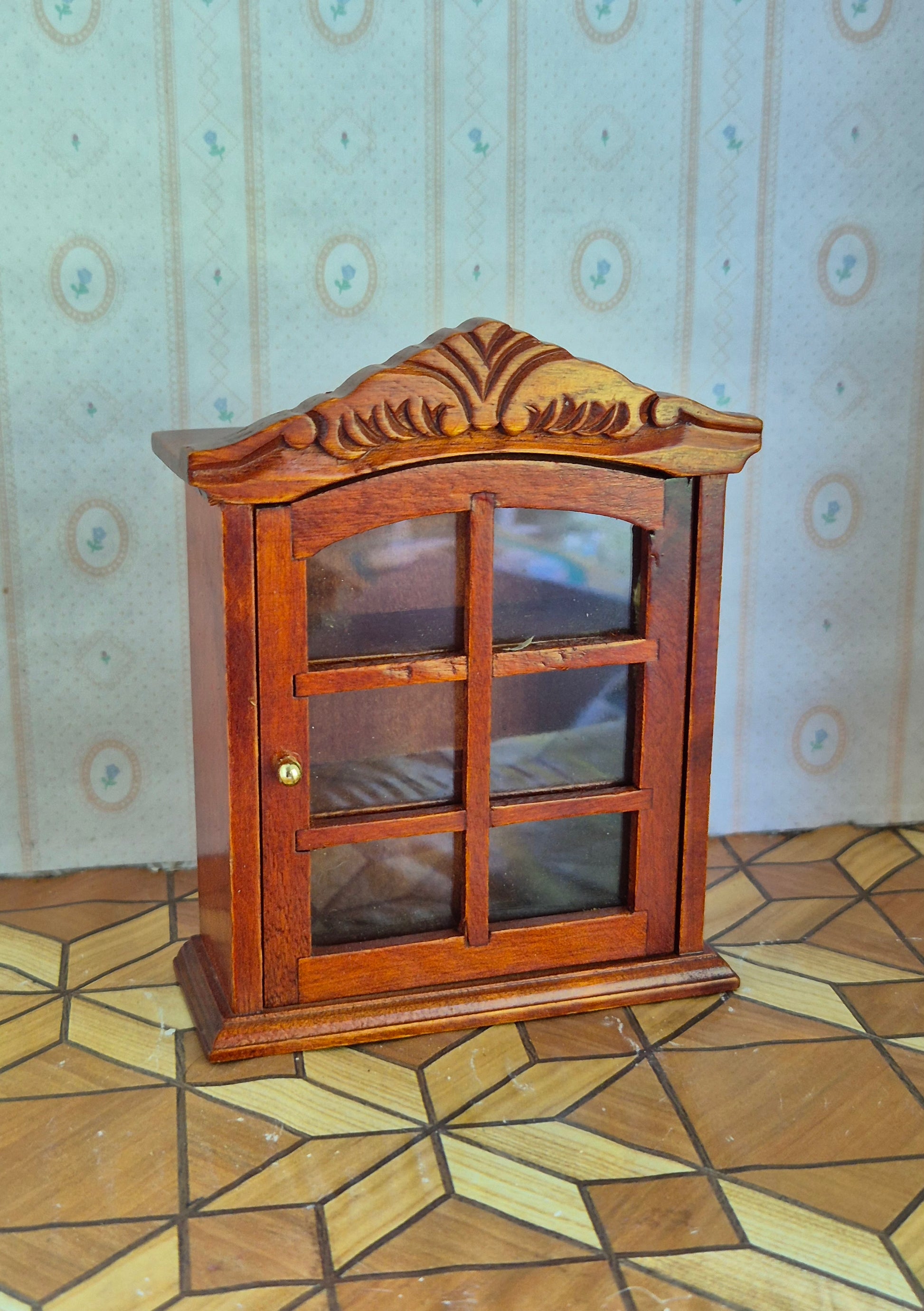 Rigtig fint og pænt 1:12 vægskab, der let kan åbnes. Pænt i valnød-nuance med fine udskæringer og detaljer.