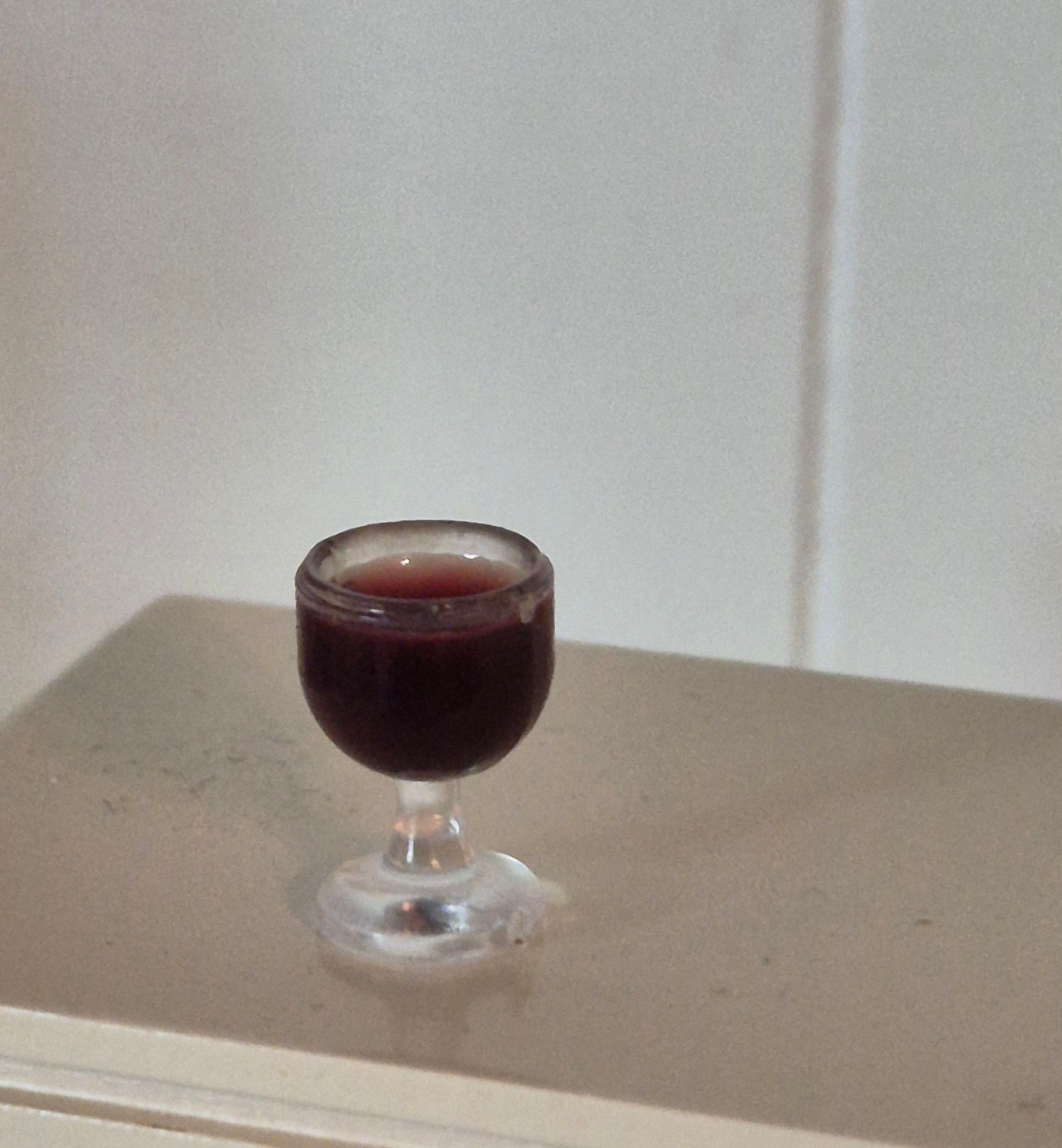 Vinglas med rødvin. Det er plast og væsken er flydende fimo.