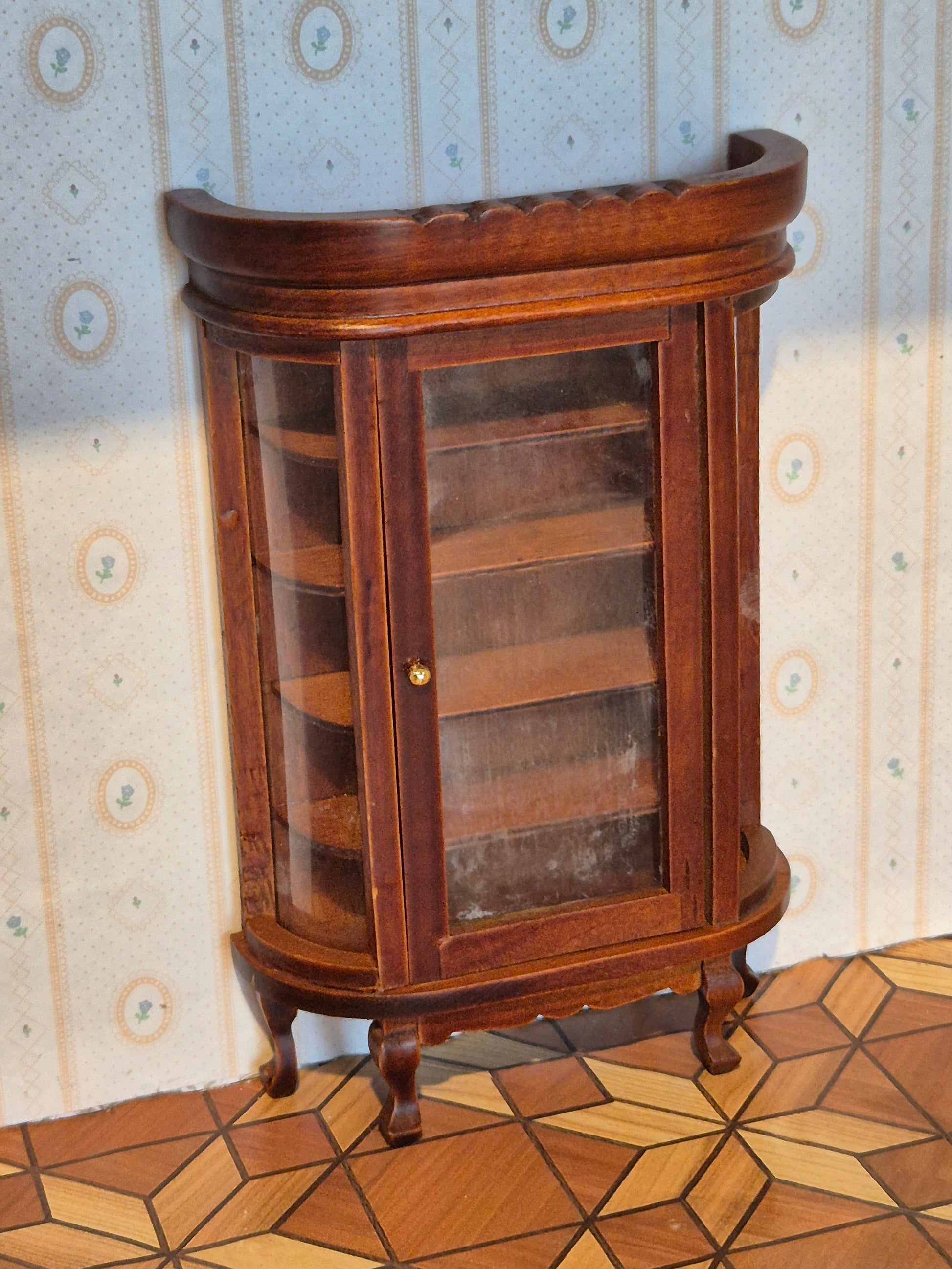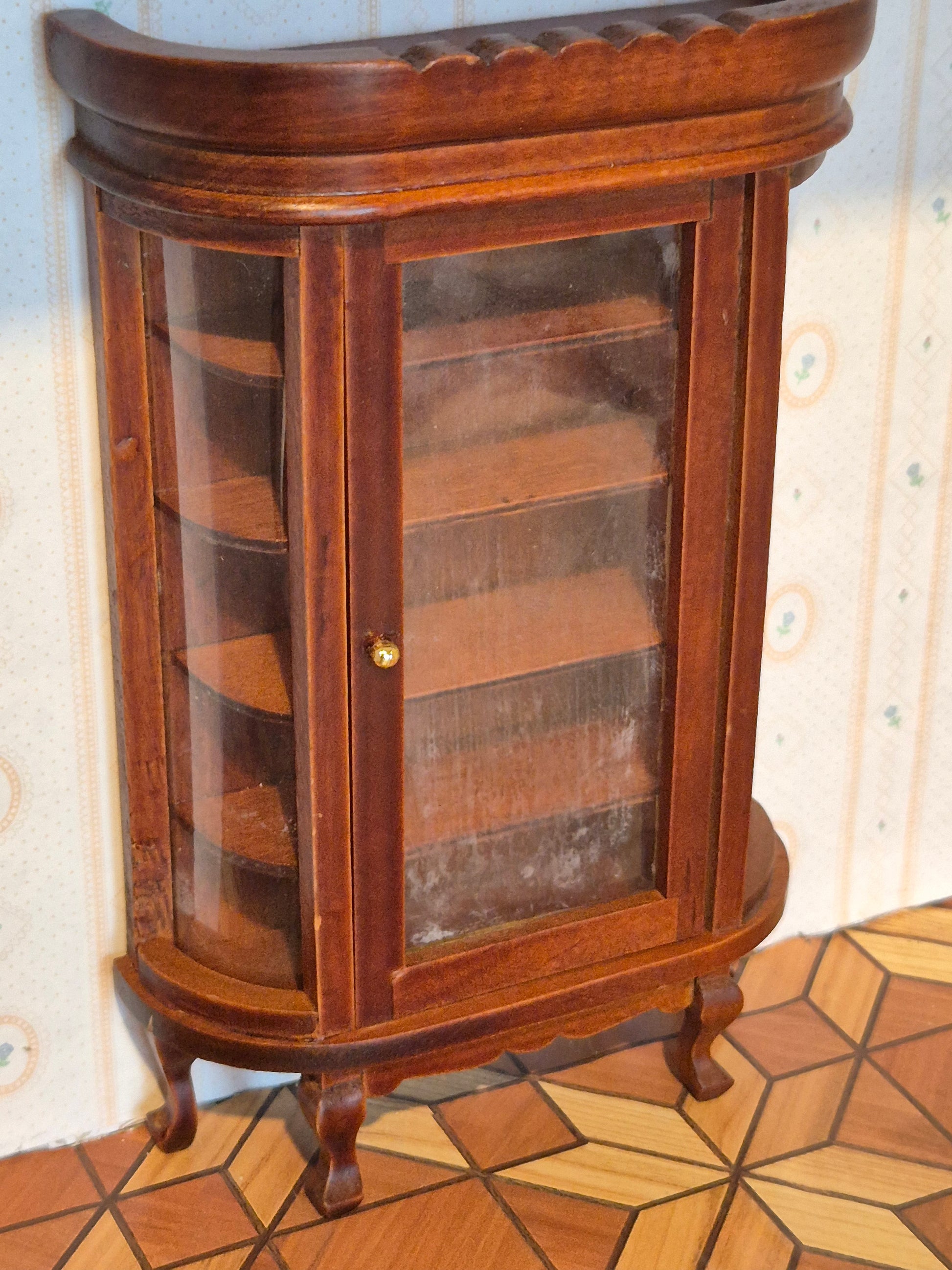 1:12 Vitrine skab af træ. Pæn med gennemsigtige ruder. Lågen kan åbnes. Trænger til rengøring.