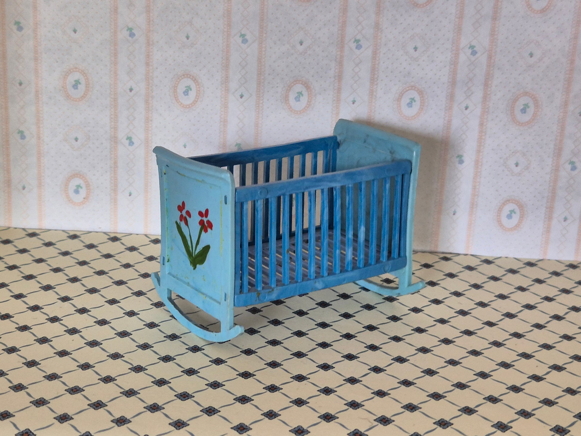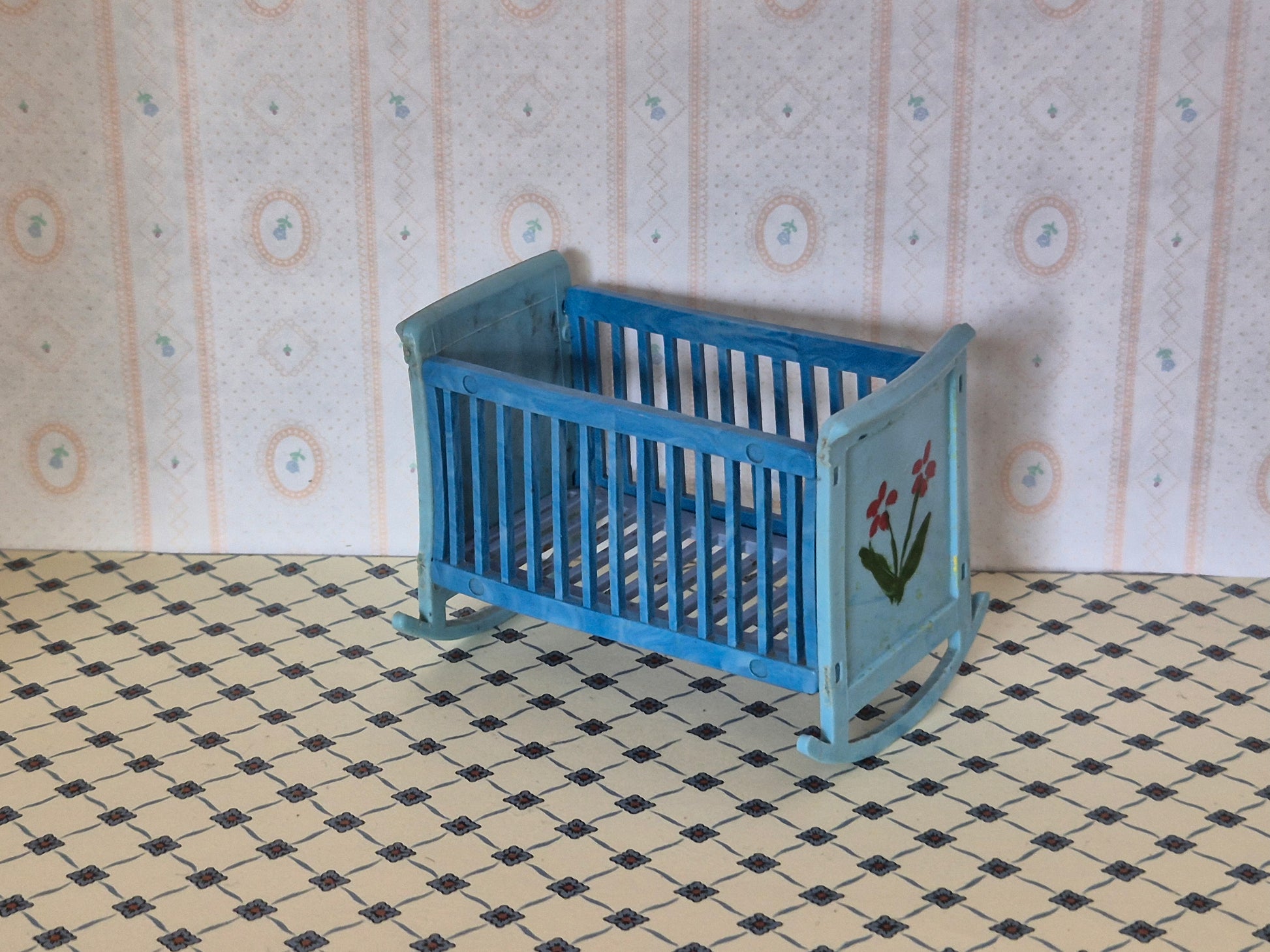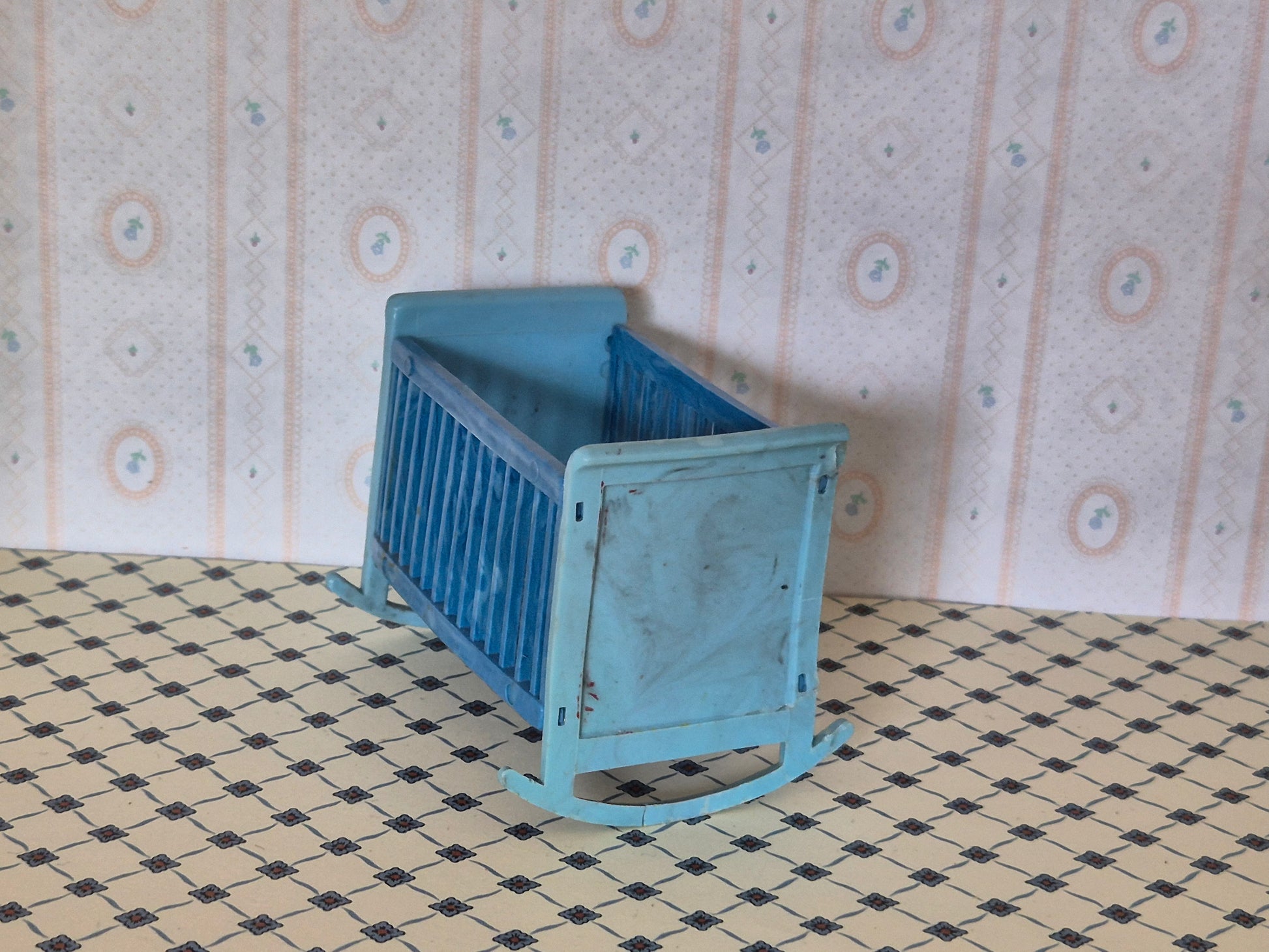 Vintage plastik vugge i blå 1:12 med en del patina, skrammer og brugsspor. Den er lidt skæv.