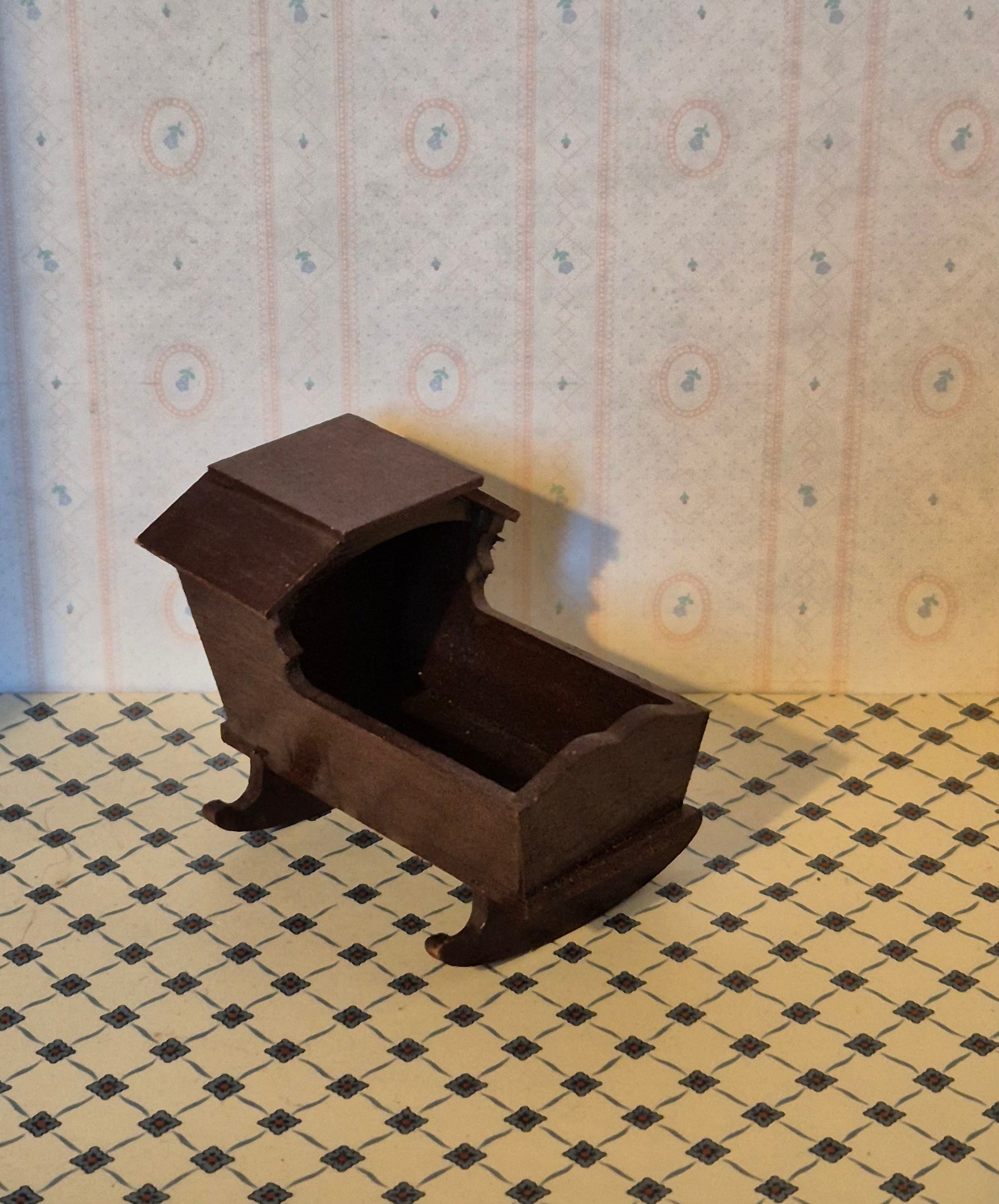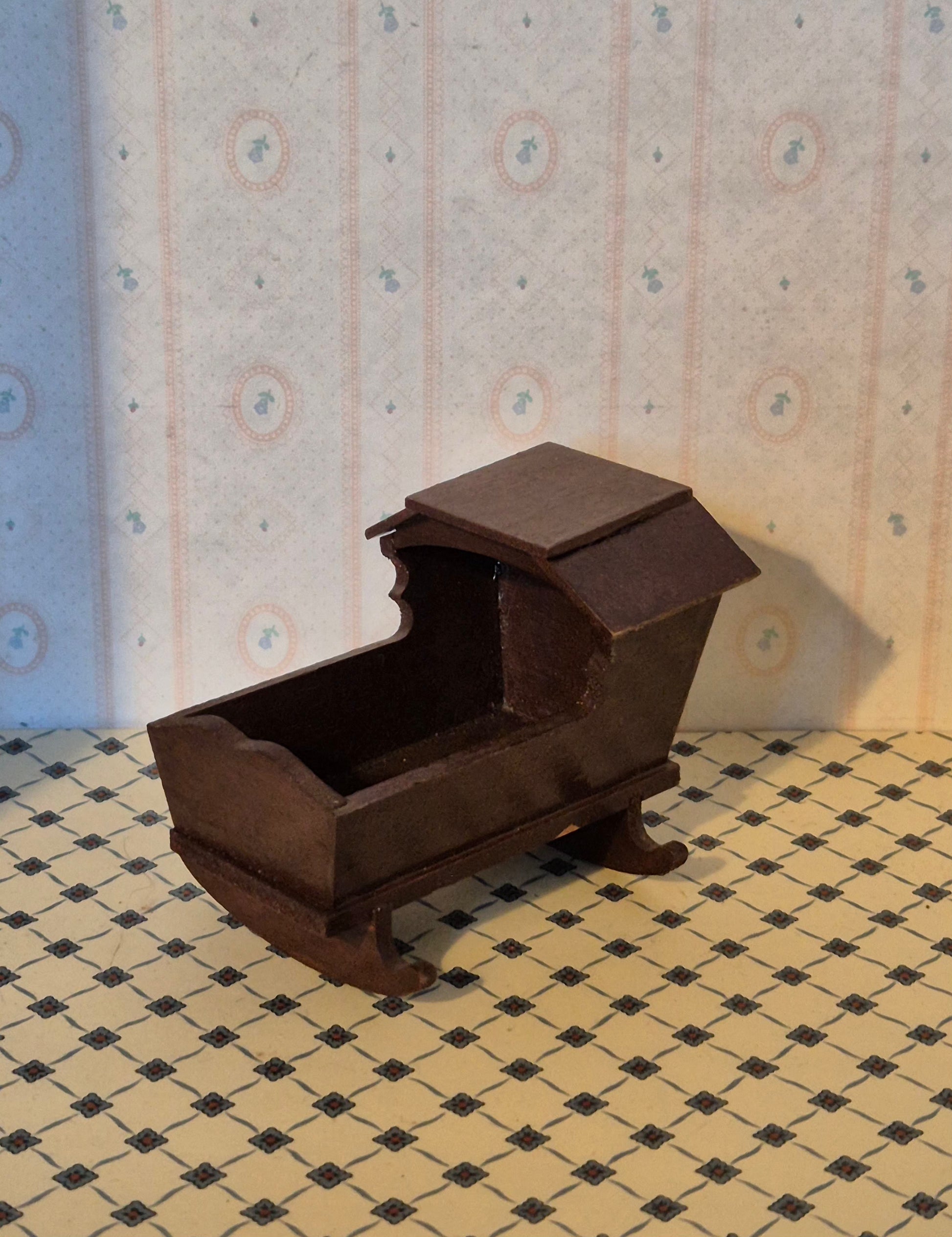 Pæn og fin vugge af træ i mørkebrun. Den er str 1:12 og kan også fint bruges til 1:14. Udmærket stand med patina.