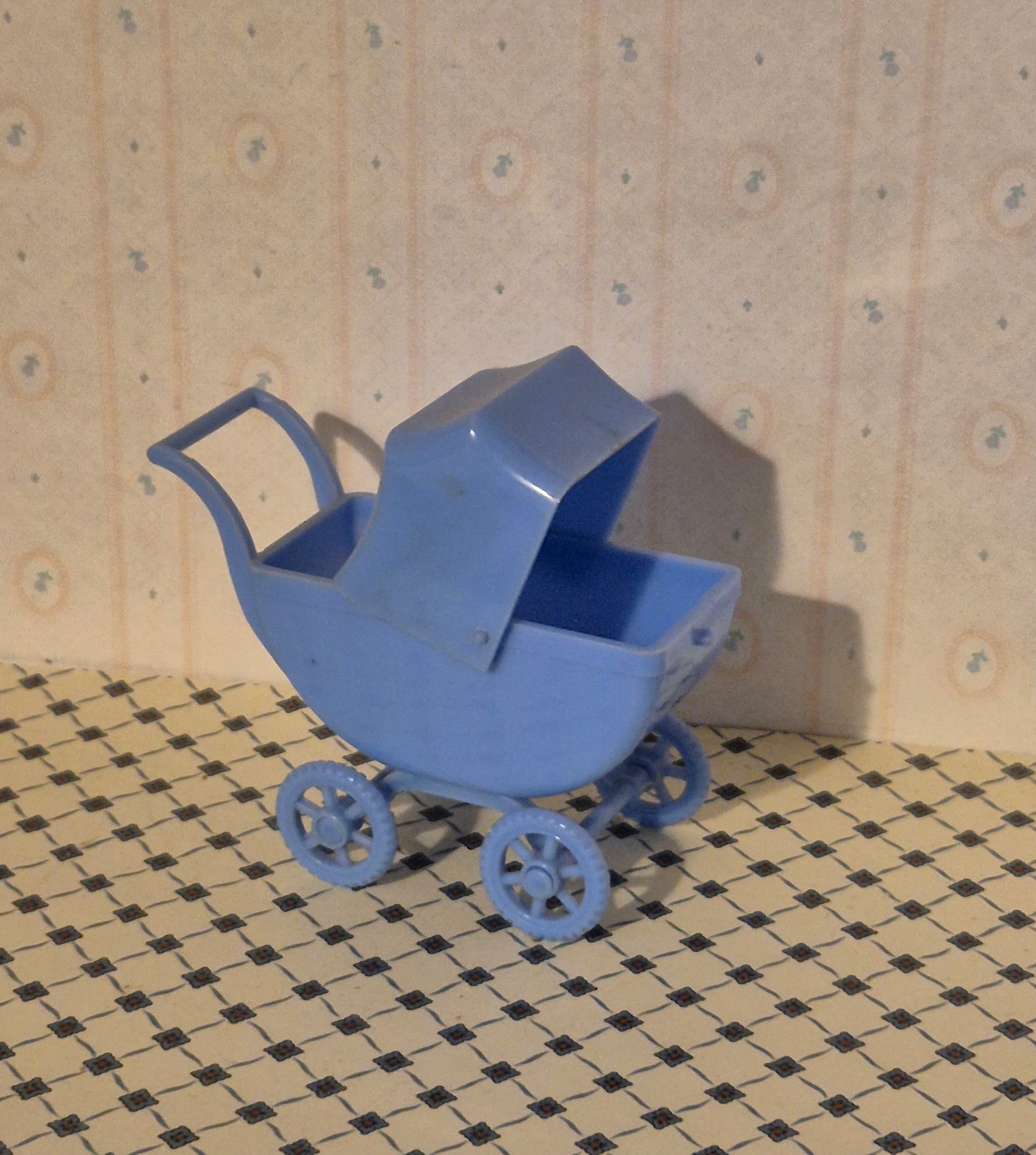 Pæn vintage barnevogn af lyseblå plastik. Udmærket stand med lidt patina. Ret pæn.