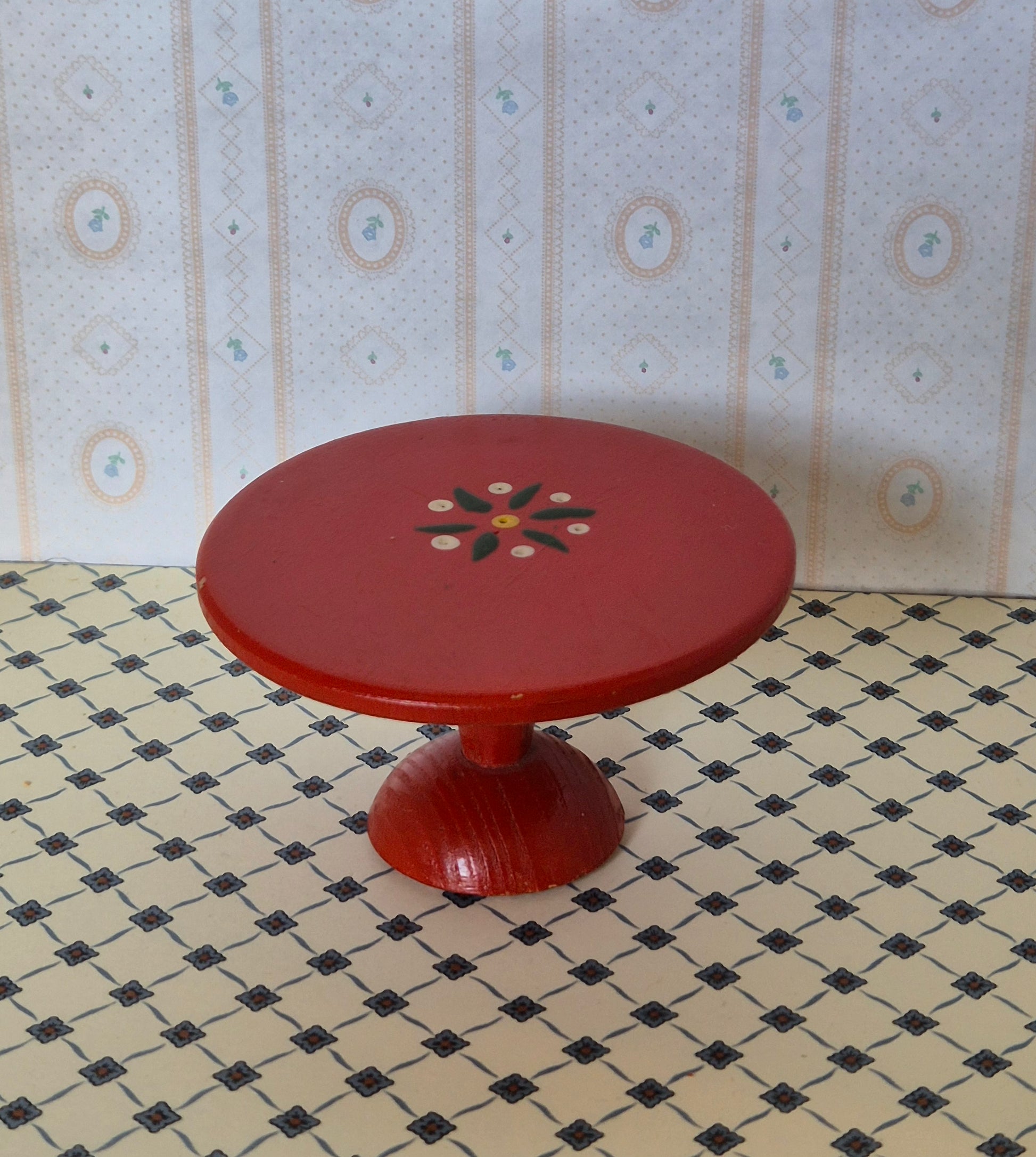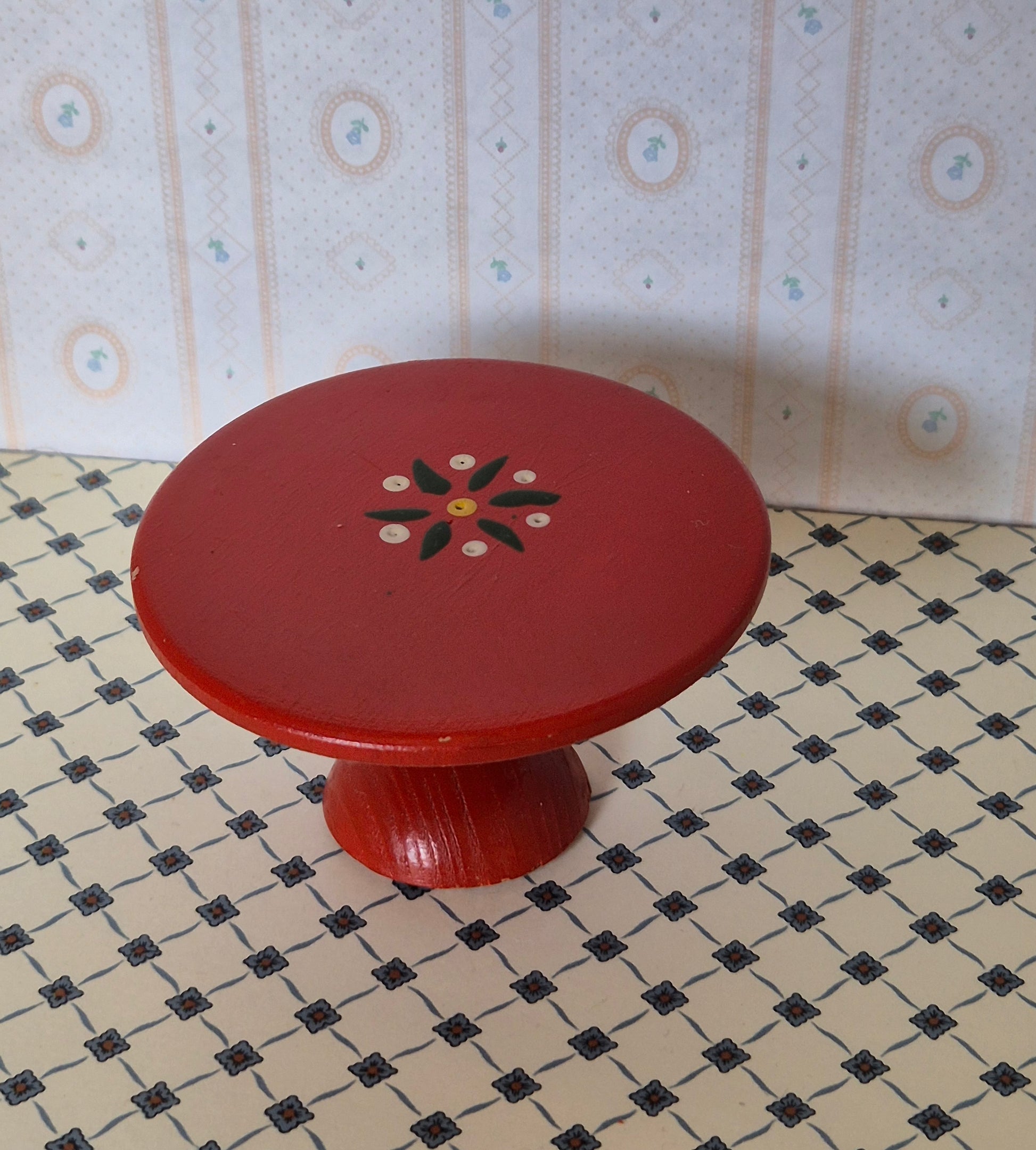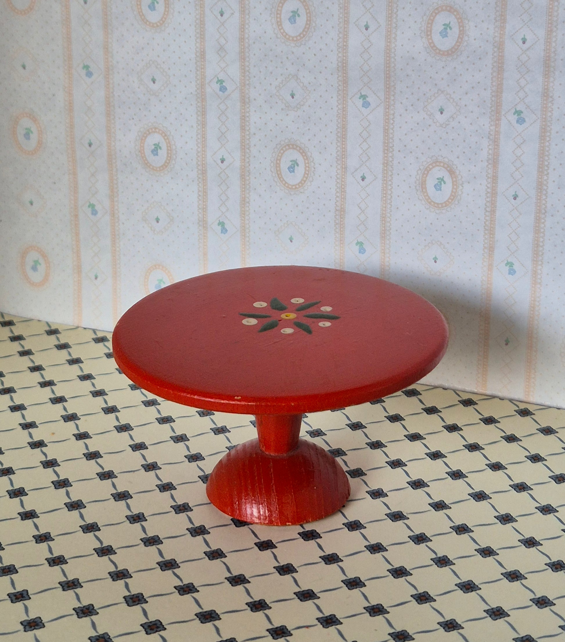 Pænt bord i rød træ med blomster motiv 1:16 i vintage stil. Udmærket stand.