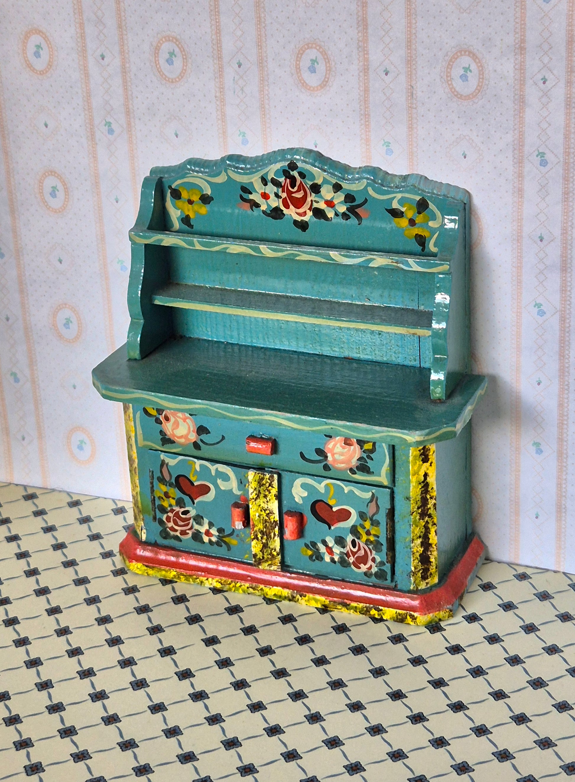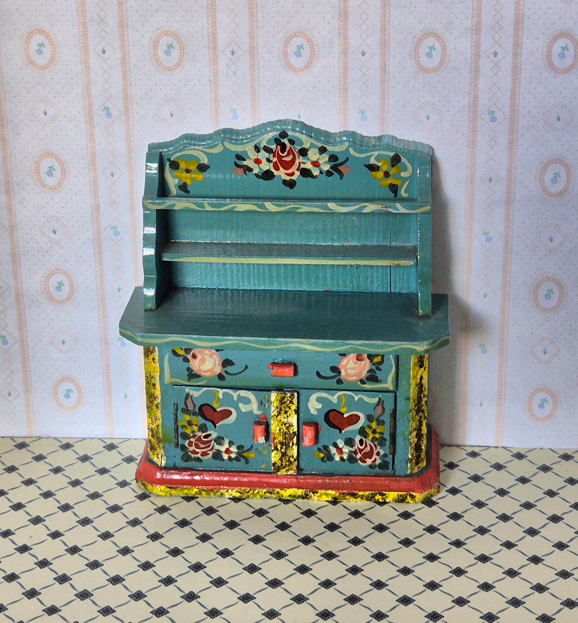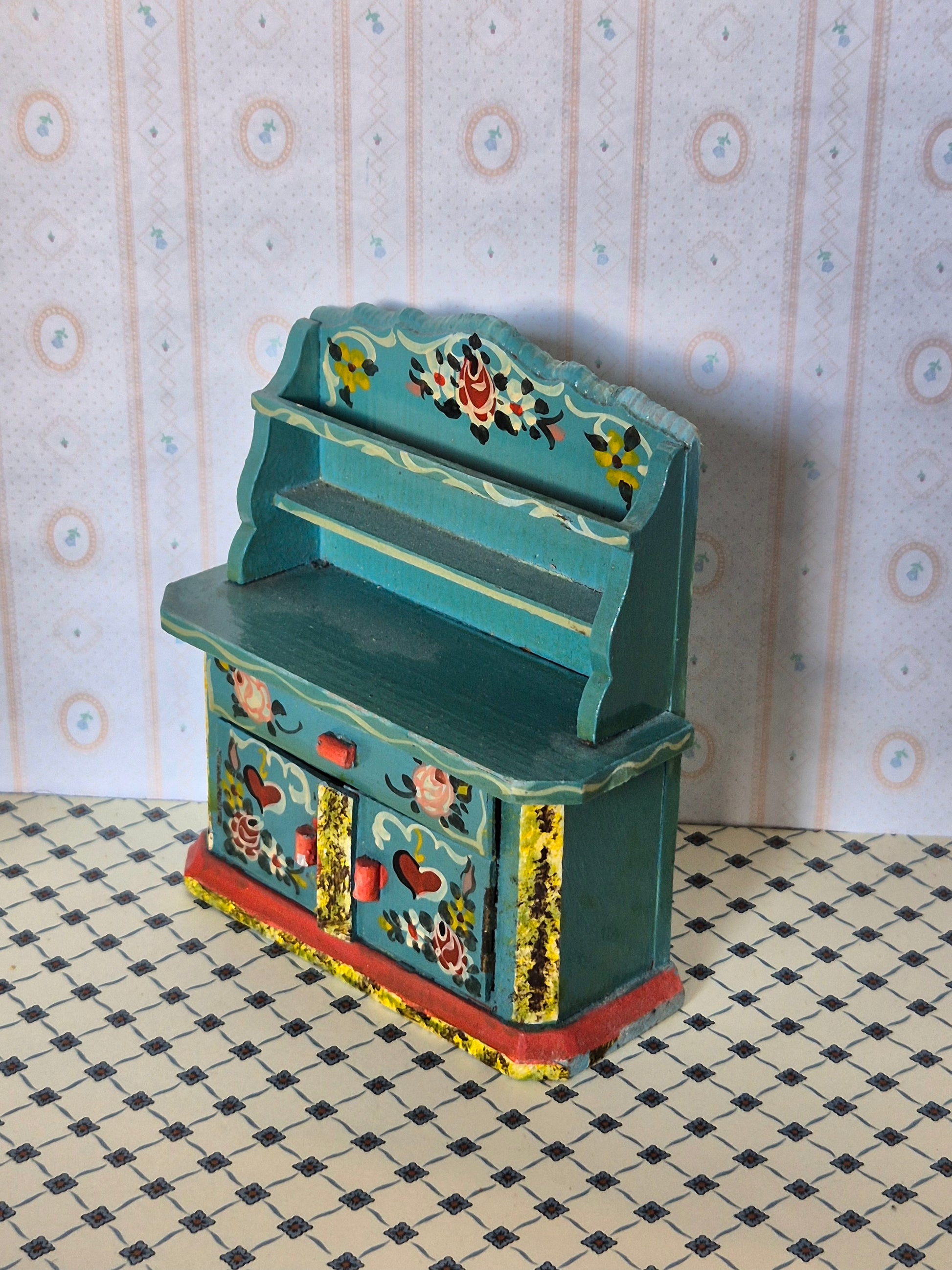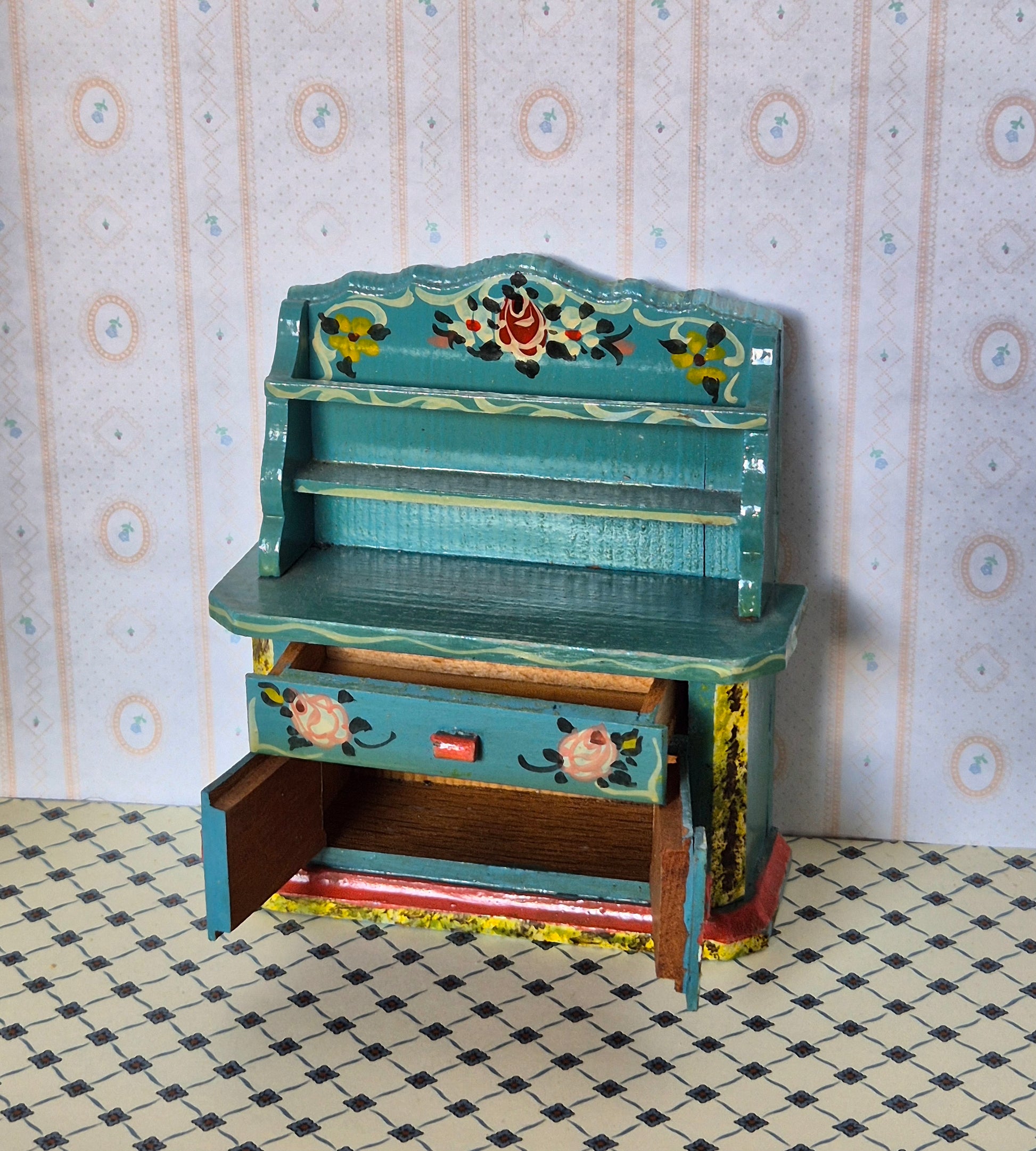 Dora Kuhn 1:16 - 1:14 reol i patineret turkis blå nuance med blomster motiv. Den er vintage.
