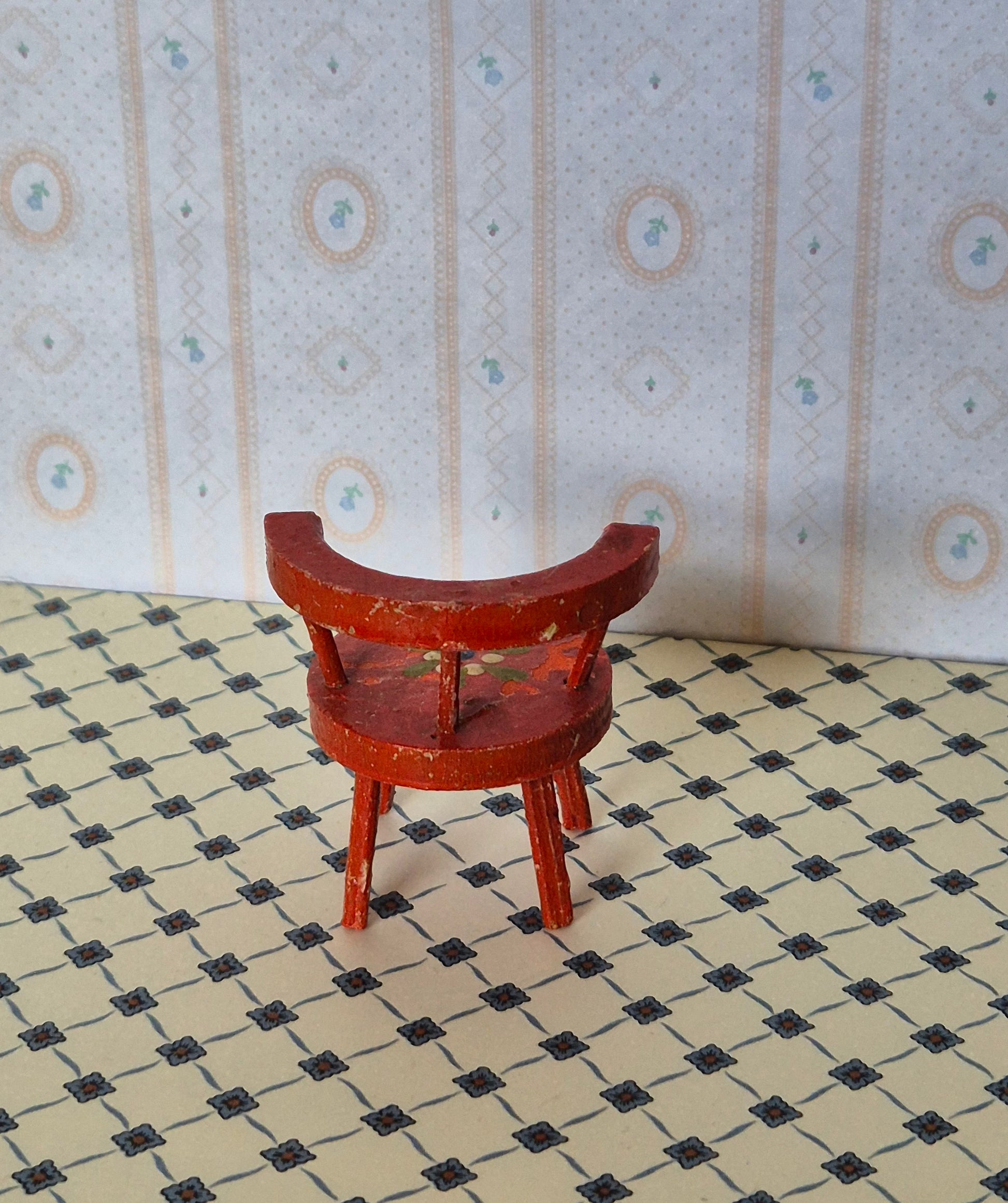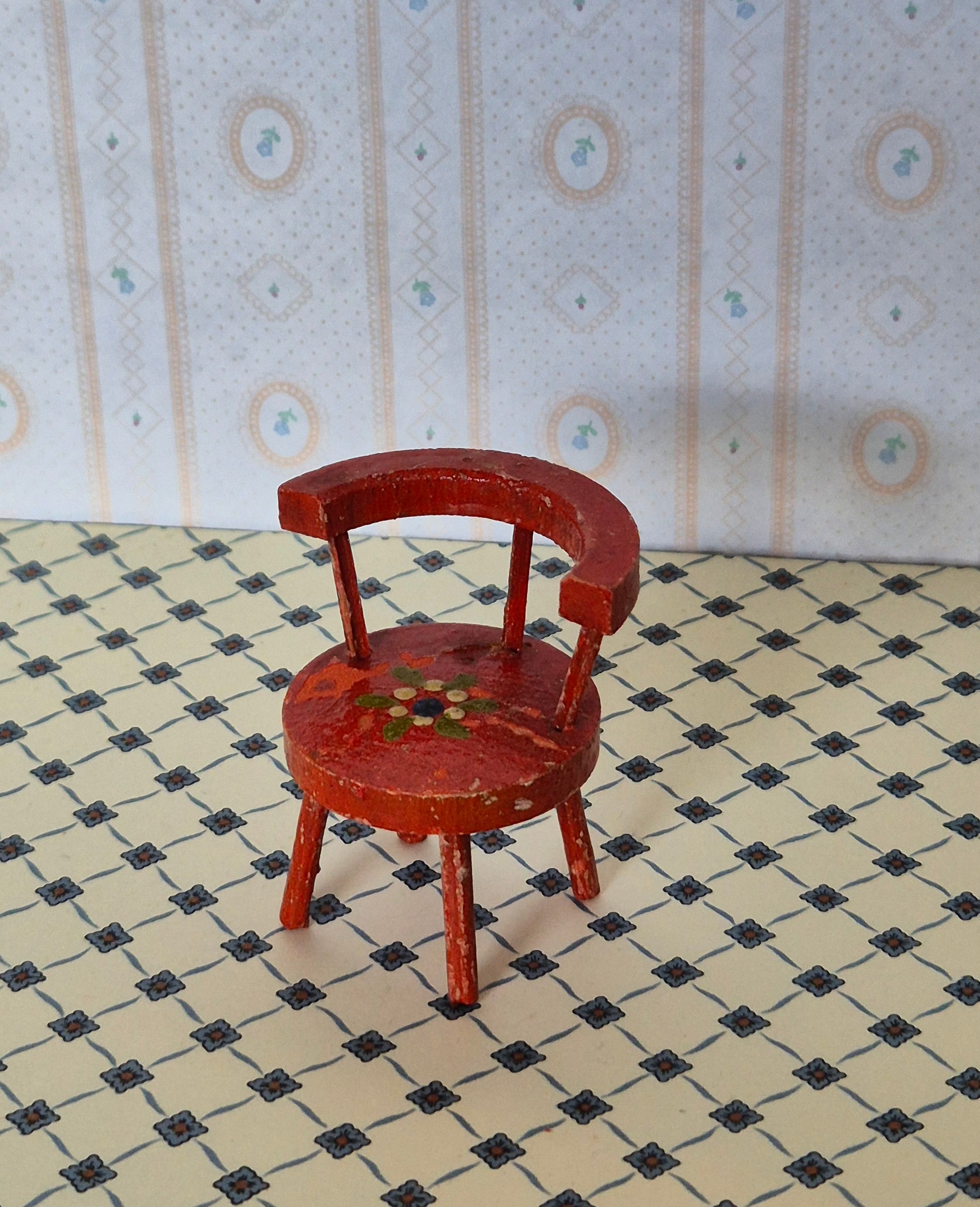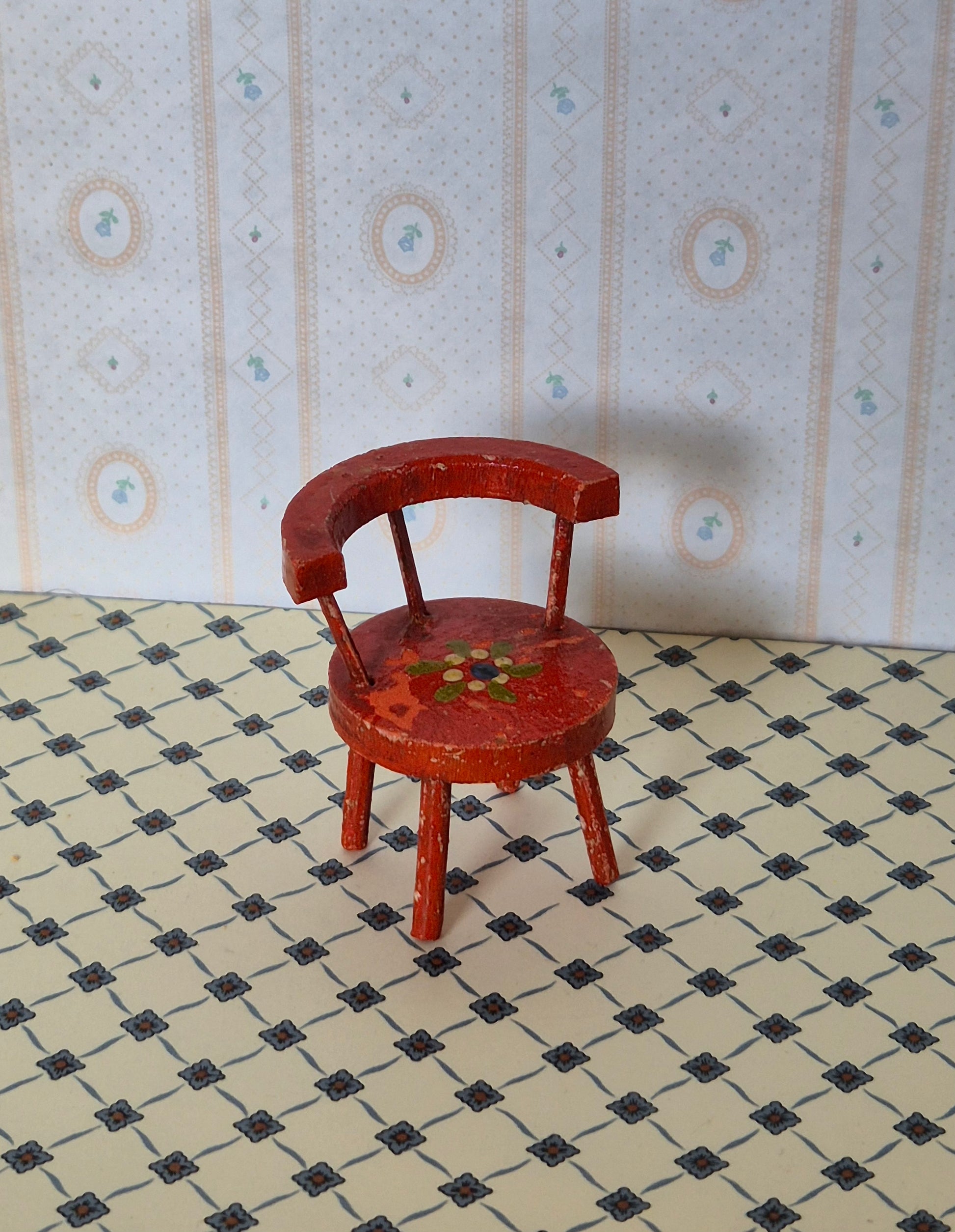 Pæn Dora Kuhn stol til dukkehuset med en del patina, slidmærker og brugsspor. Det er 1:16.