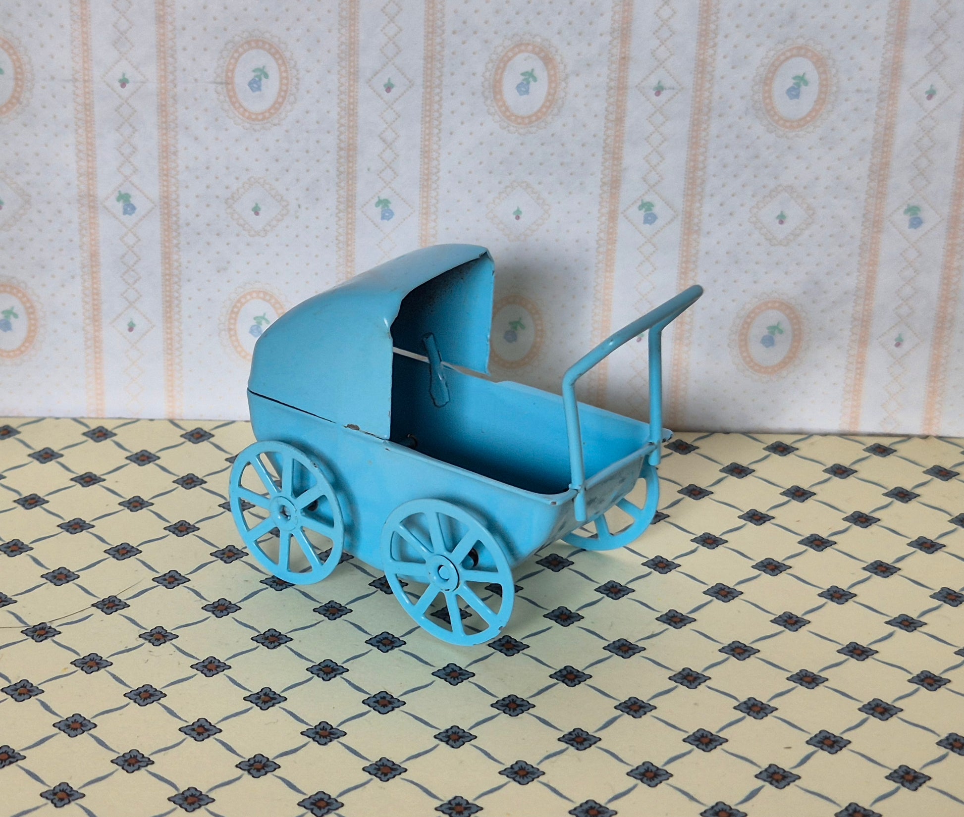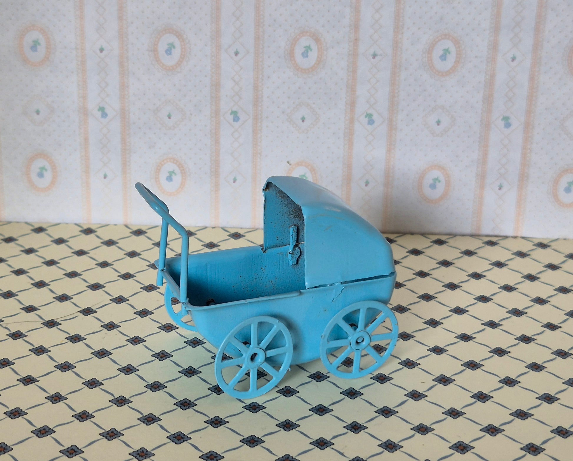 Pæn vintage 1:16 dukkevogn til børneværelset. Udmærket stand med patina og brugsspor. Den er af metal