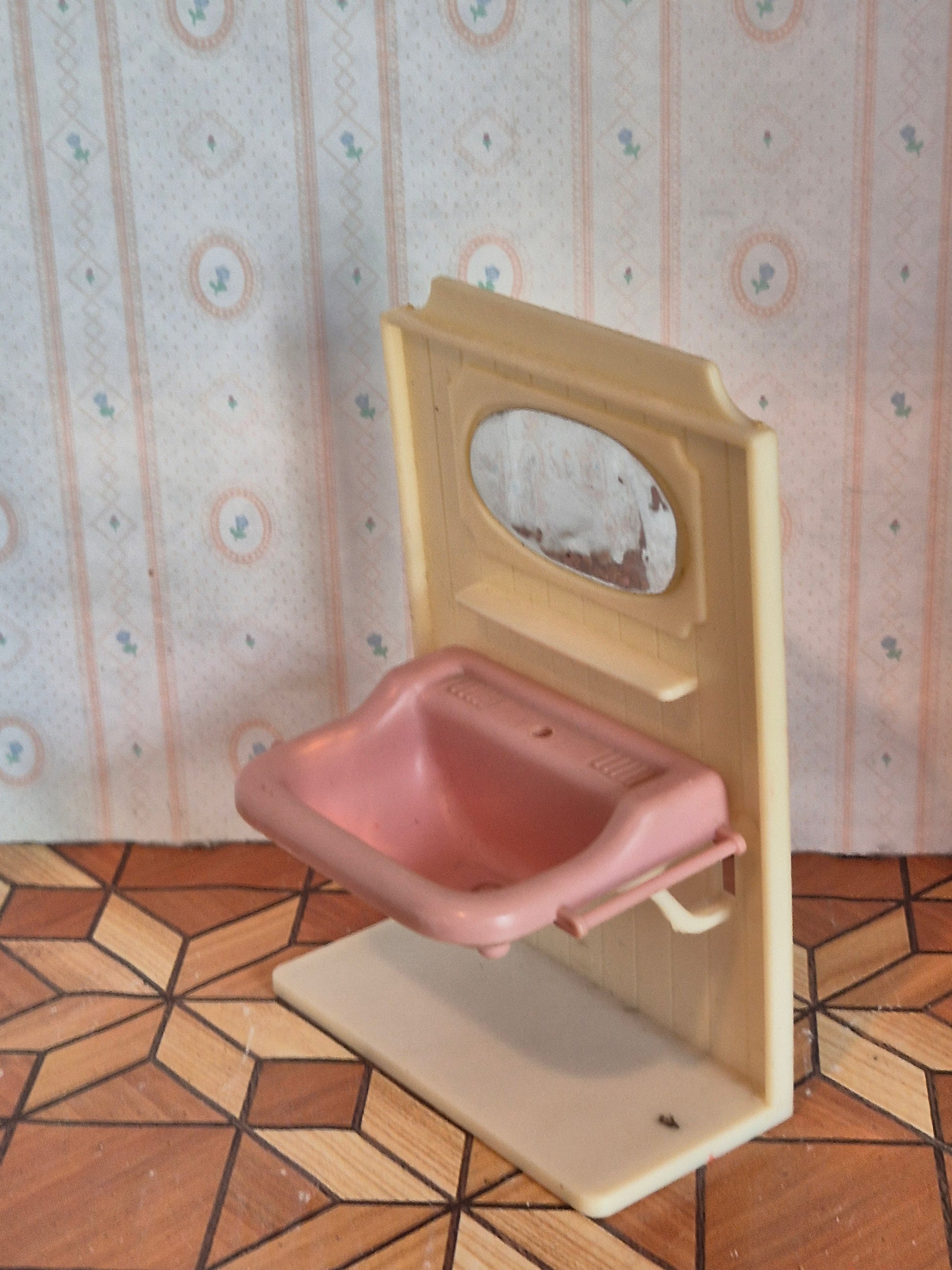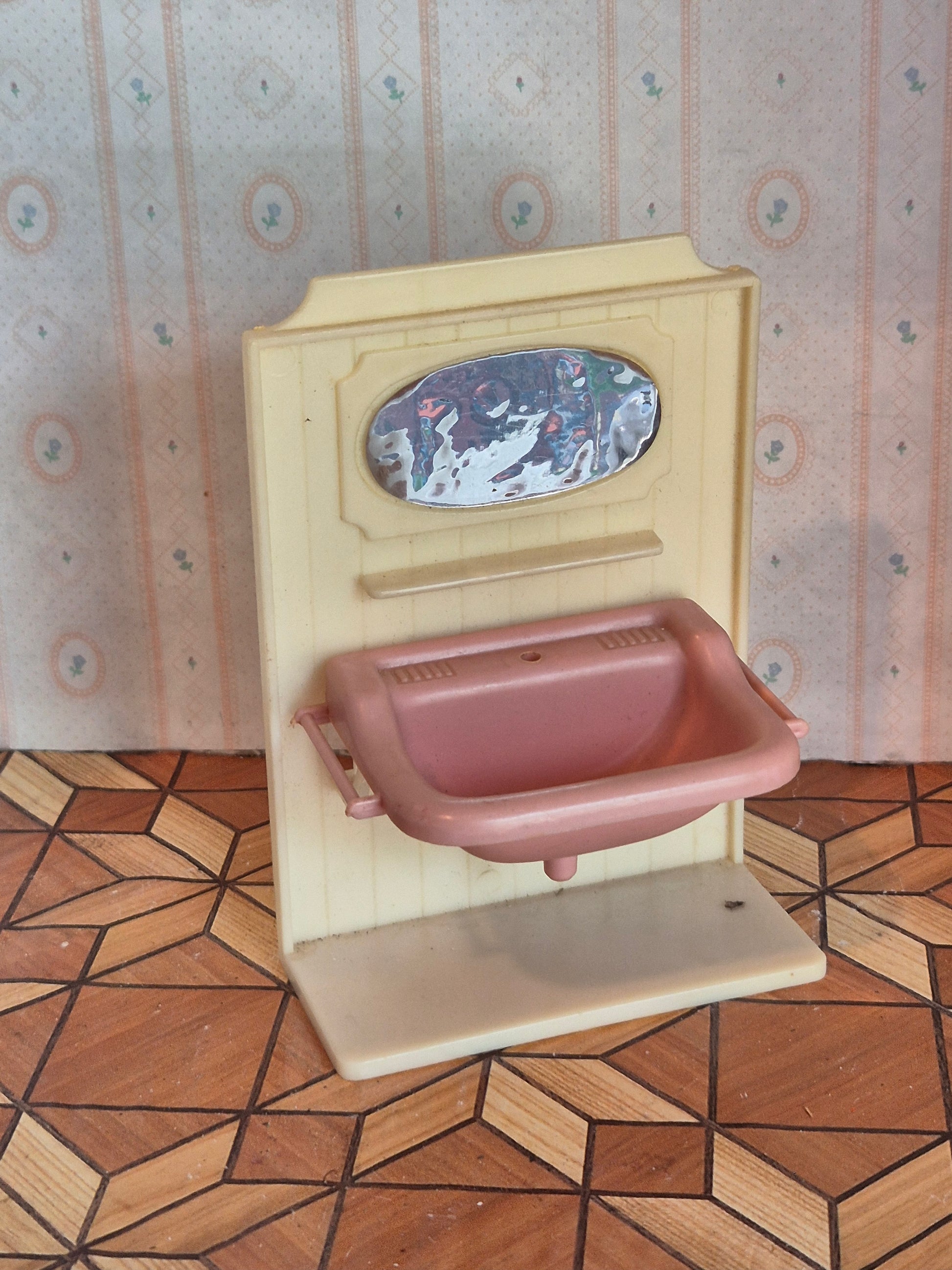 1:16 håndvask til badeværelset af plastik i hvid og pink. Der er patina, brugsspor og slidmærker.