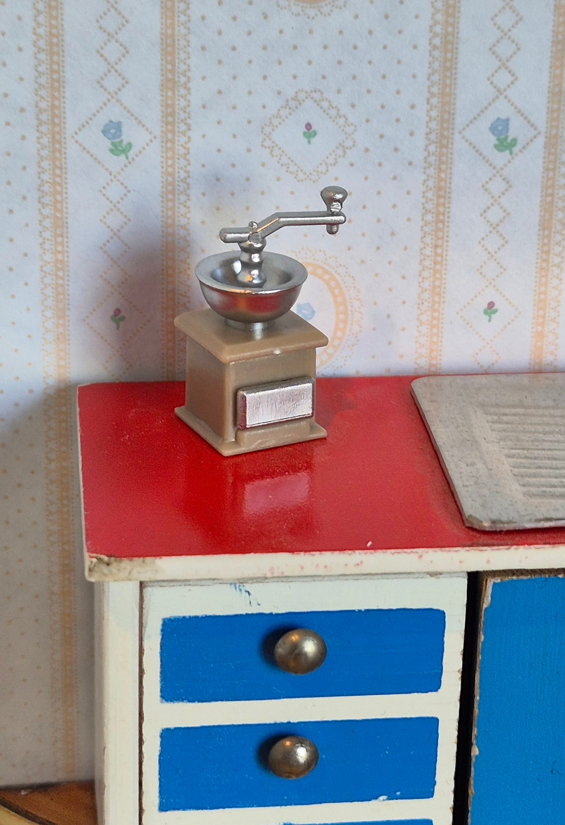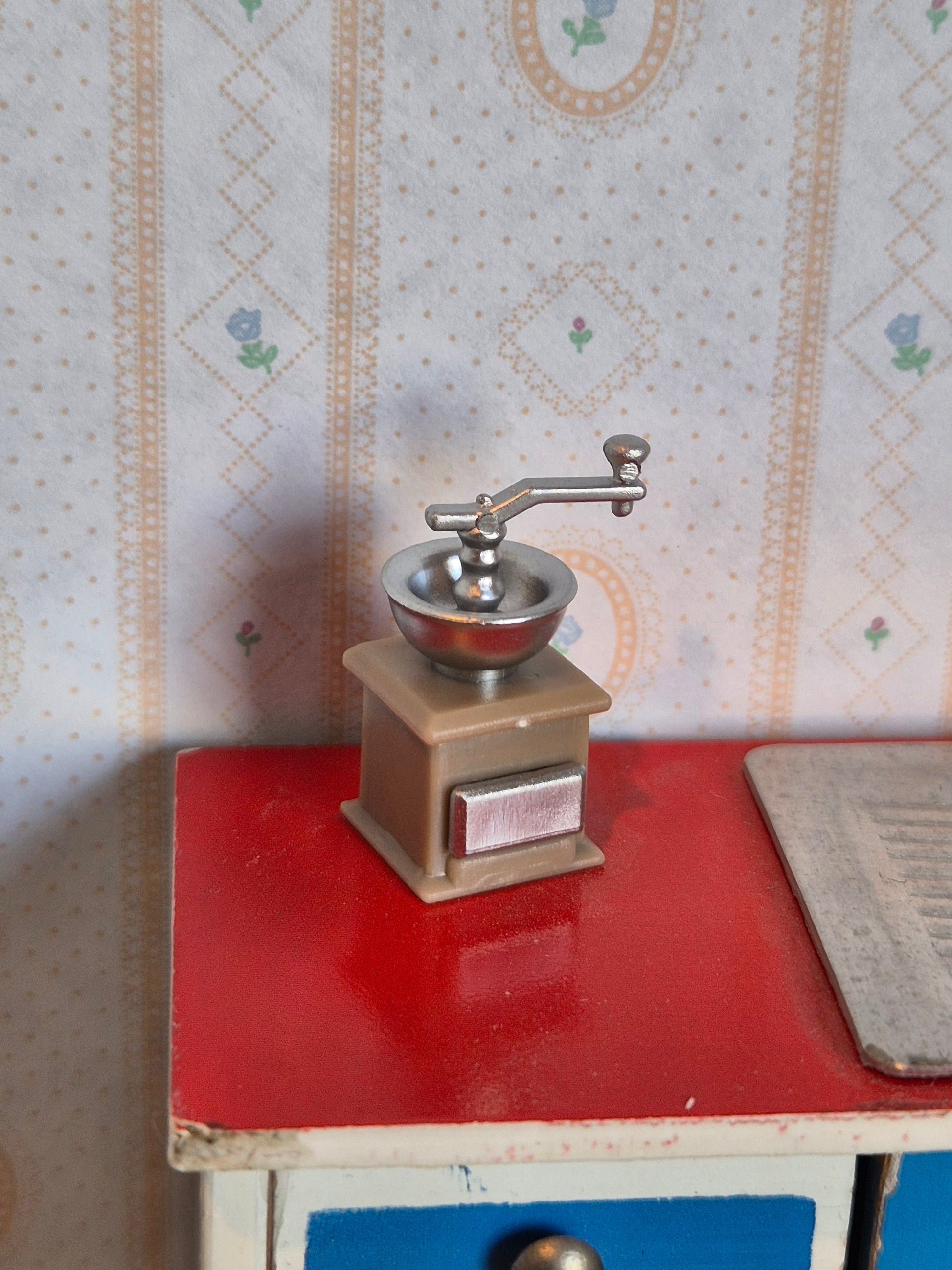 Fin lille kaffekværn i str 1:18/1:16. Passer fint til lundby str. Den er af plast. Skuffen kan åbnes.