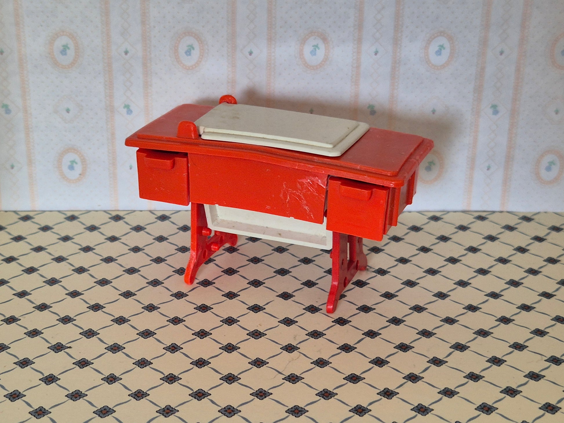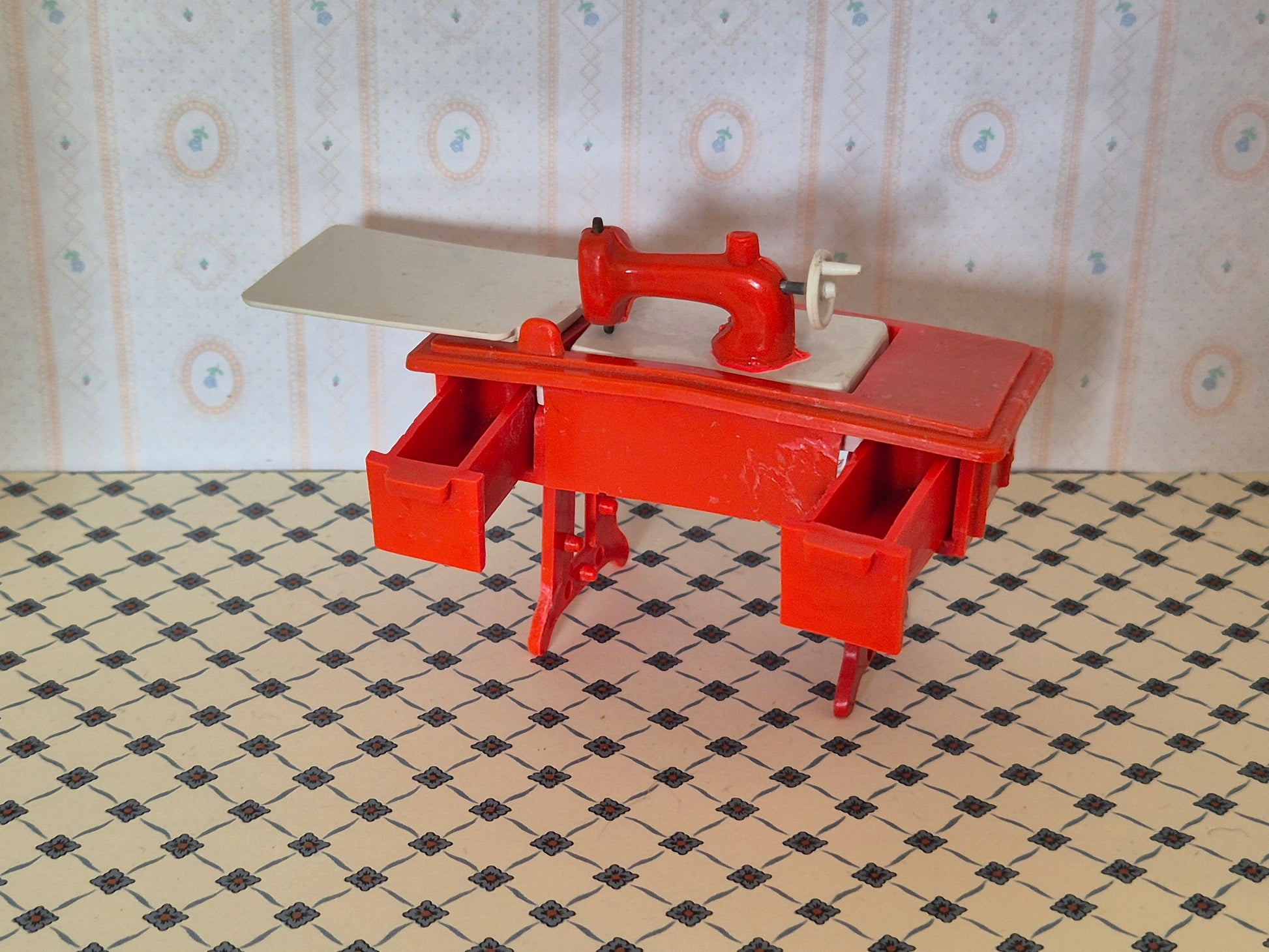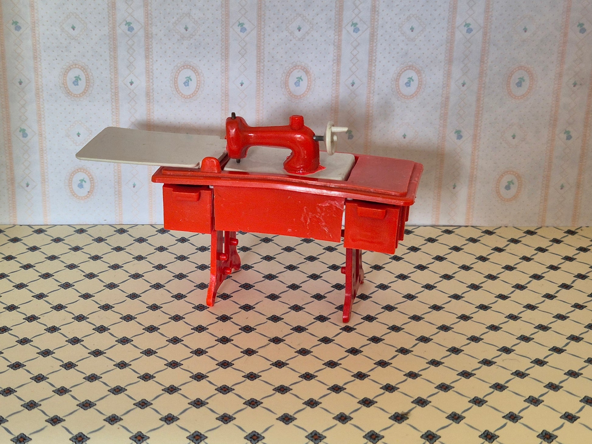 Rød og hvid 1:16 symaskine af mærket Kleeware. Den er lidt bulet med patina og brugsspor, men alle funktioner er intakte.