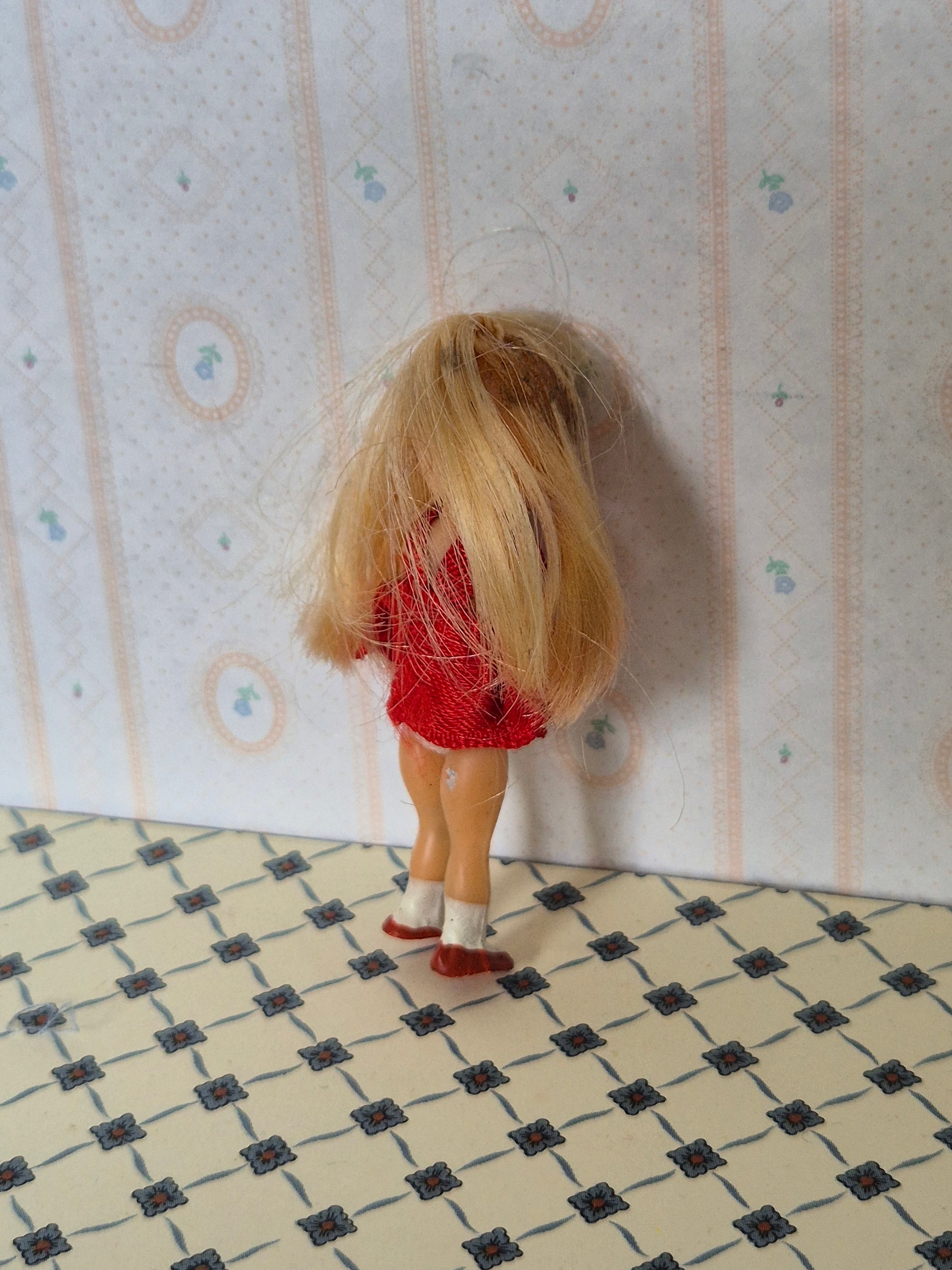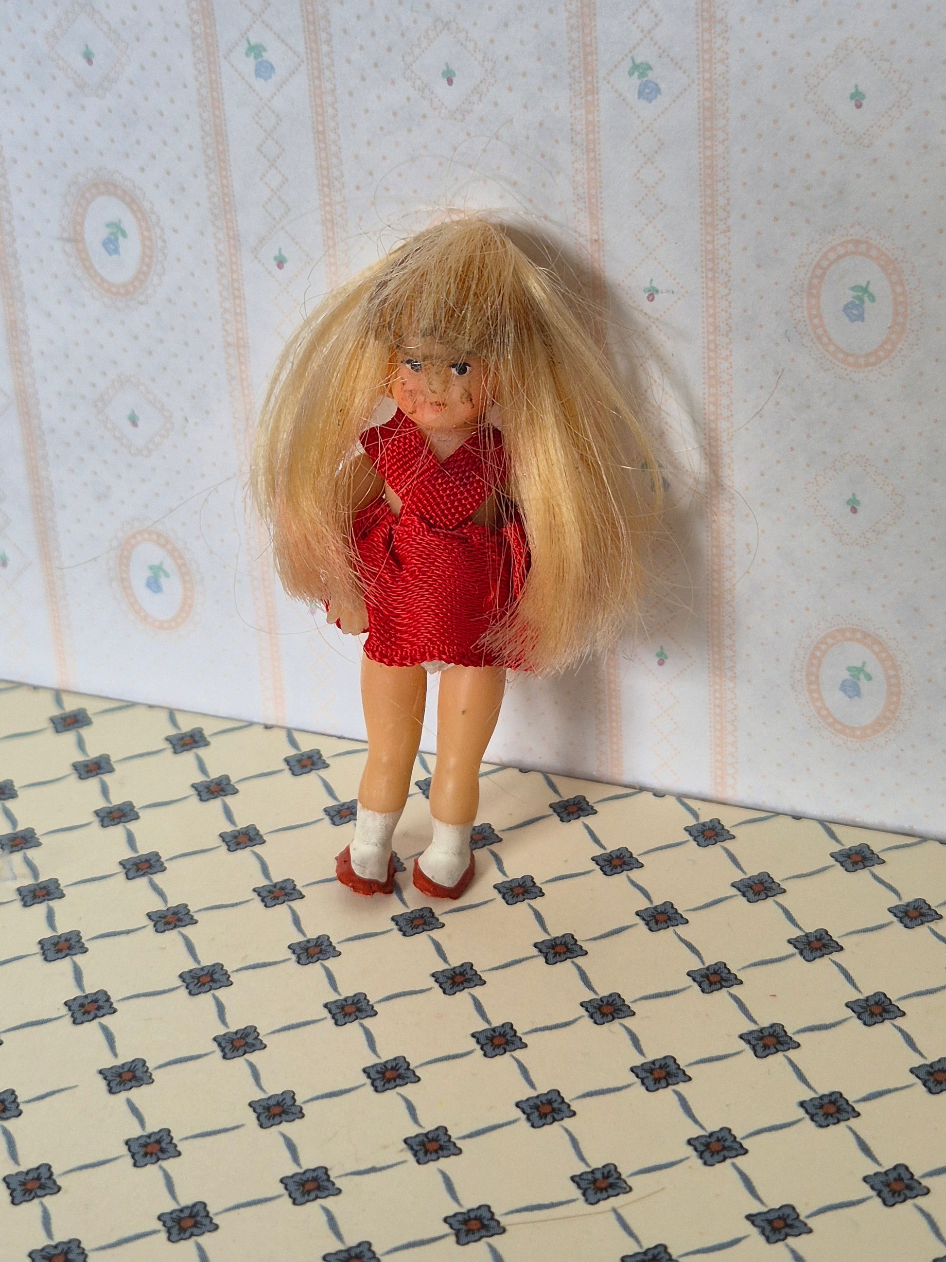 Ari dukke pige, vintage, 1:18 - 1:16 med patina, limrester, slidmærker og lignende.