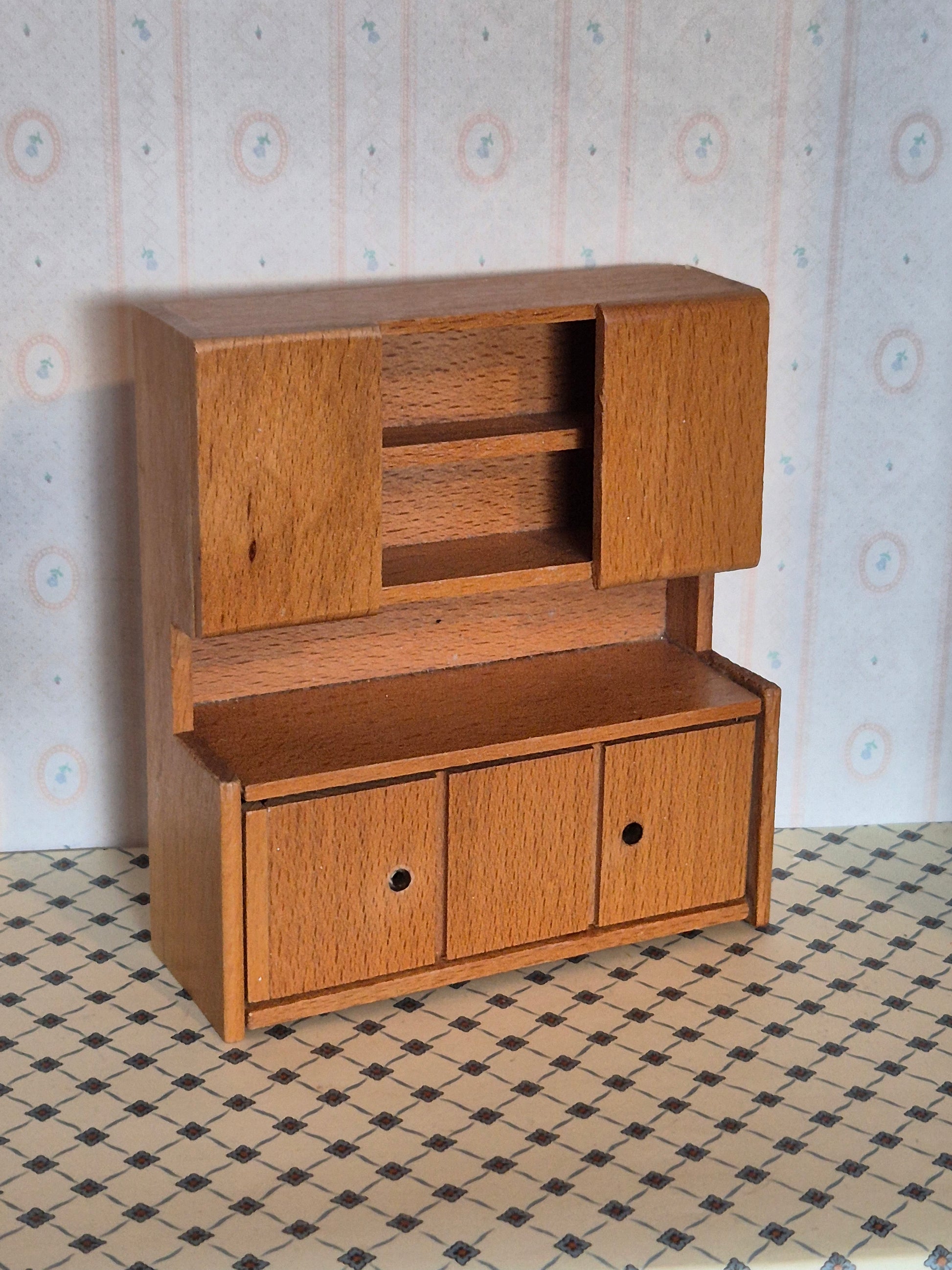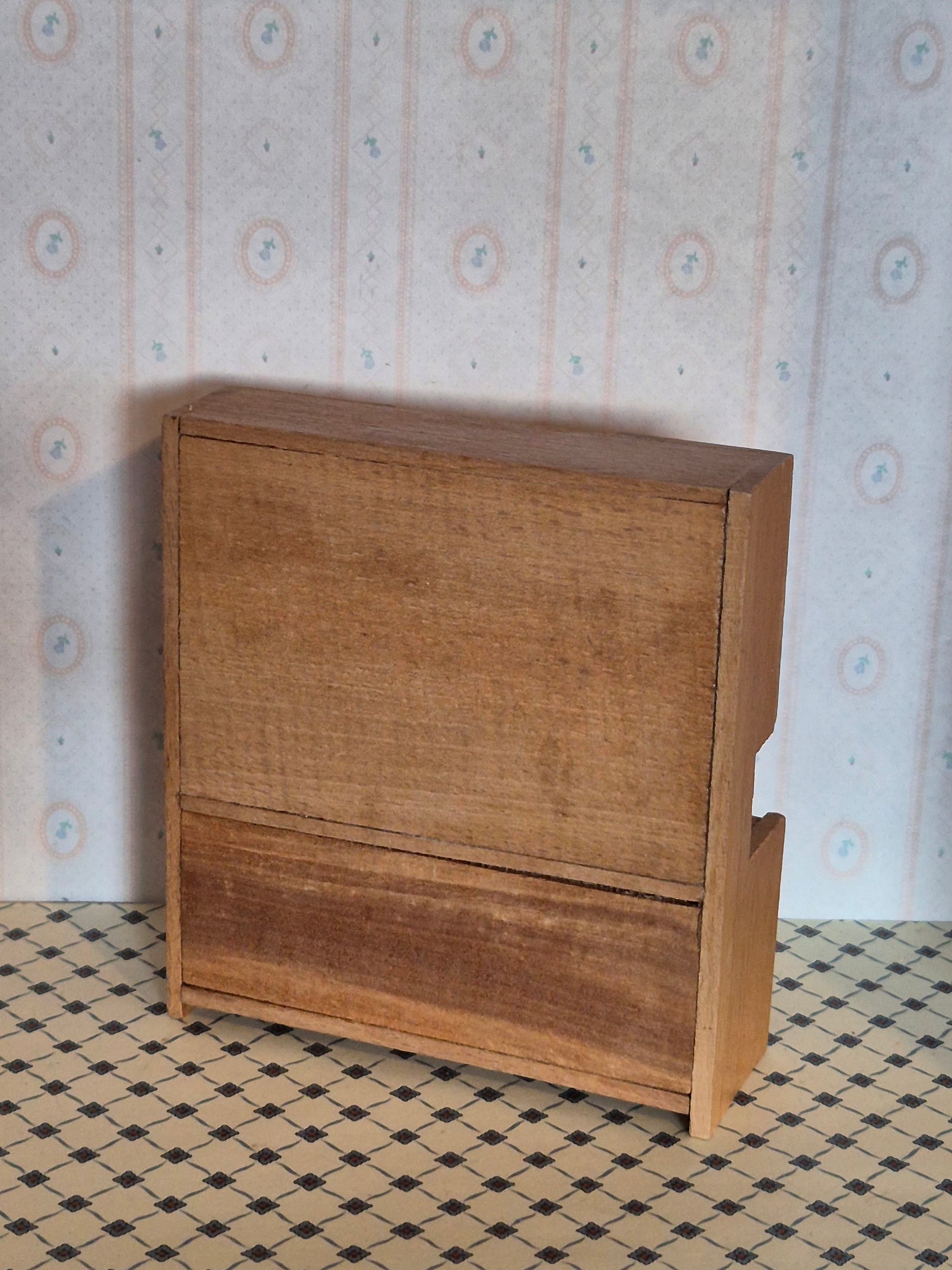 Vintage skab str 1:18 af træ. Der er patina, skrammer og lignende brugsspor.