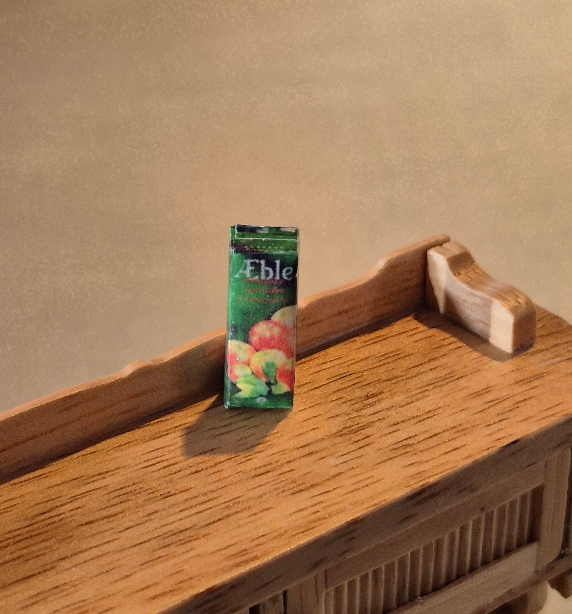 Pæn karton æblejuice til dukkehuset. Hjemmelavet af privat miniature person.