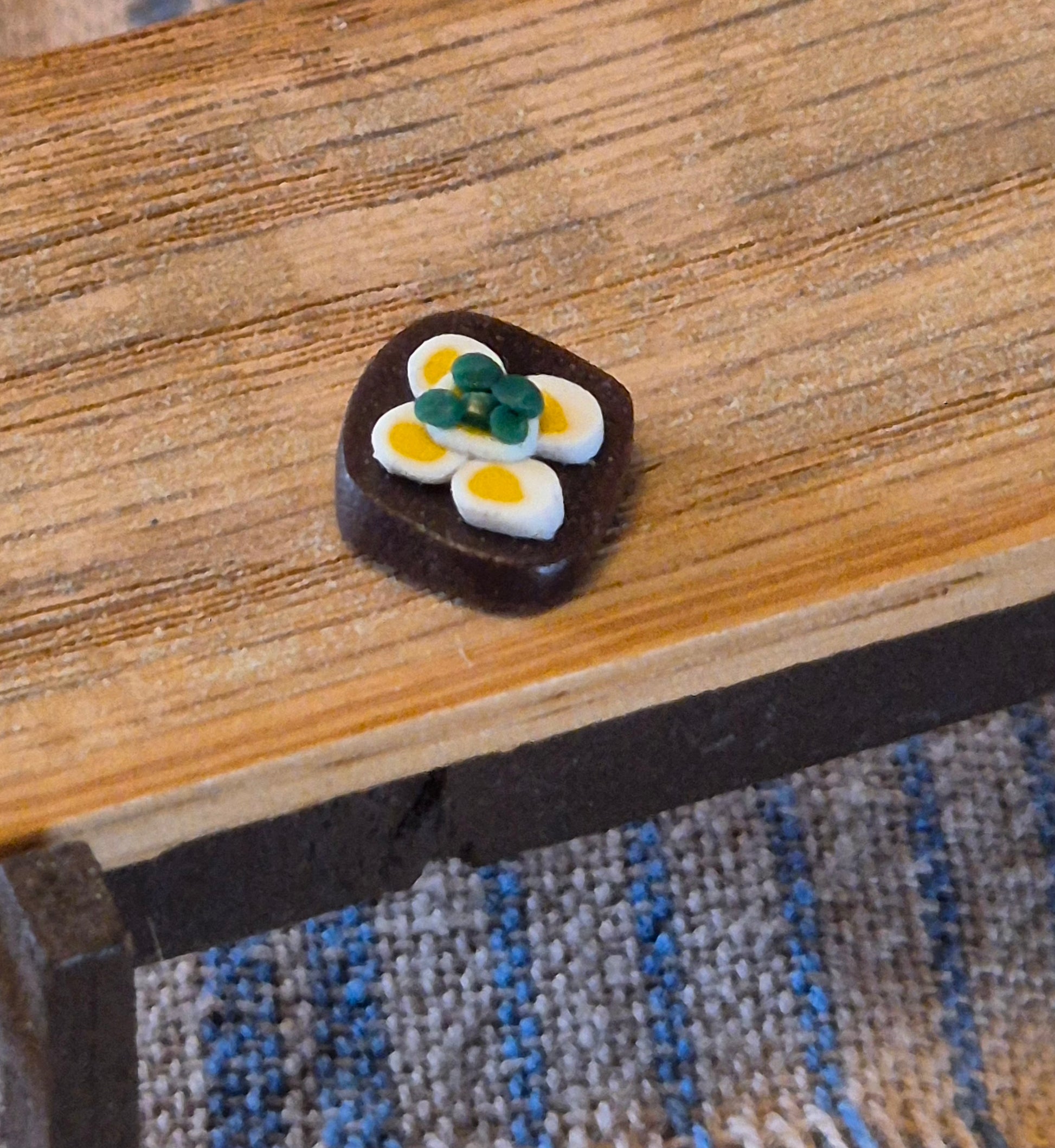 Fin lille rugbrødsmad med skiver af hårdkogt æg. Dansk ret, mørk brød af kornet rug med kødpølse.