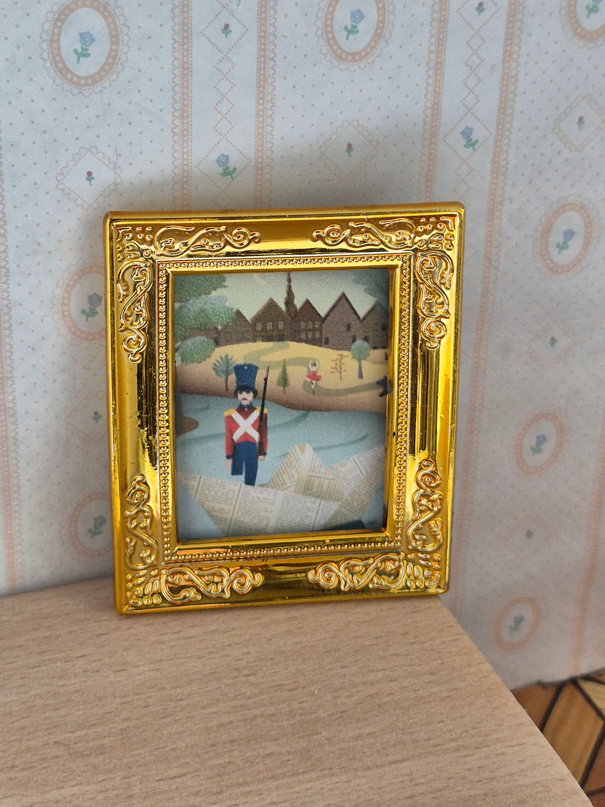 Fint billede med plast ramme og hjemmelavet maleri-print af HC Andersens eventyr Den standhaftige Tinsoldaten.
