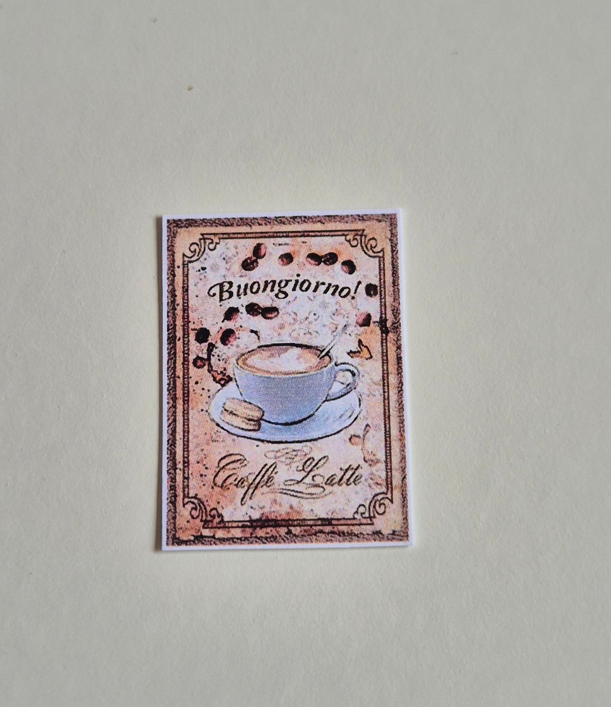 Pænt billede af en kop kaffe. Passer fint som tilbehør til miniature café eller væg-dekoration i dukkehus køkkenet.