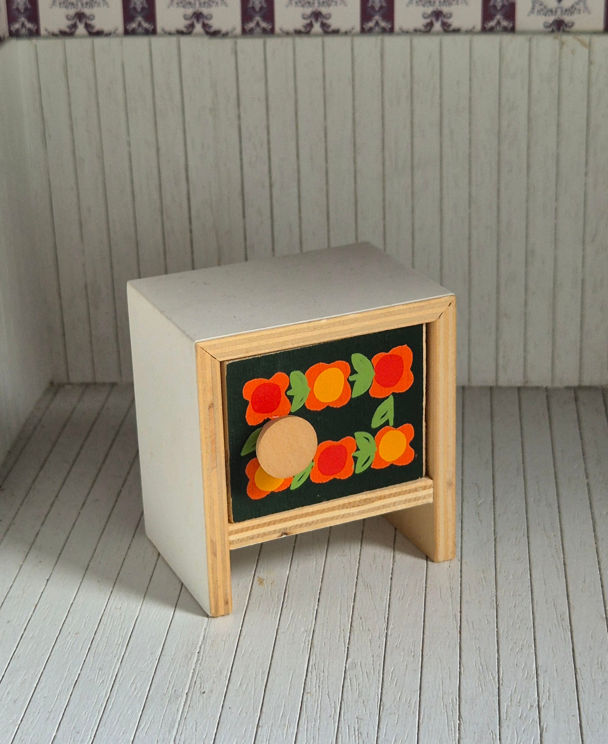 Bodo Hennig natbord-skab med retro print på fronten. Det er af træ i str 1:10.