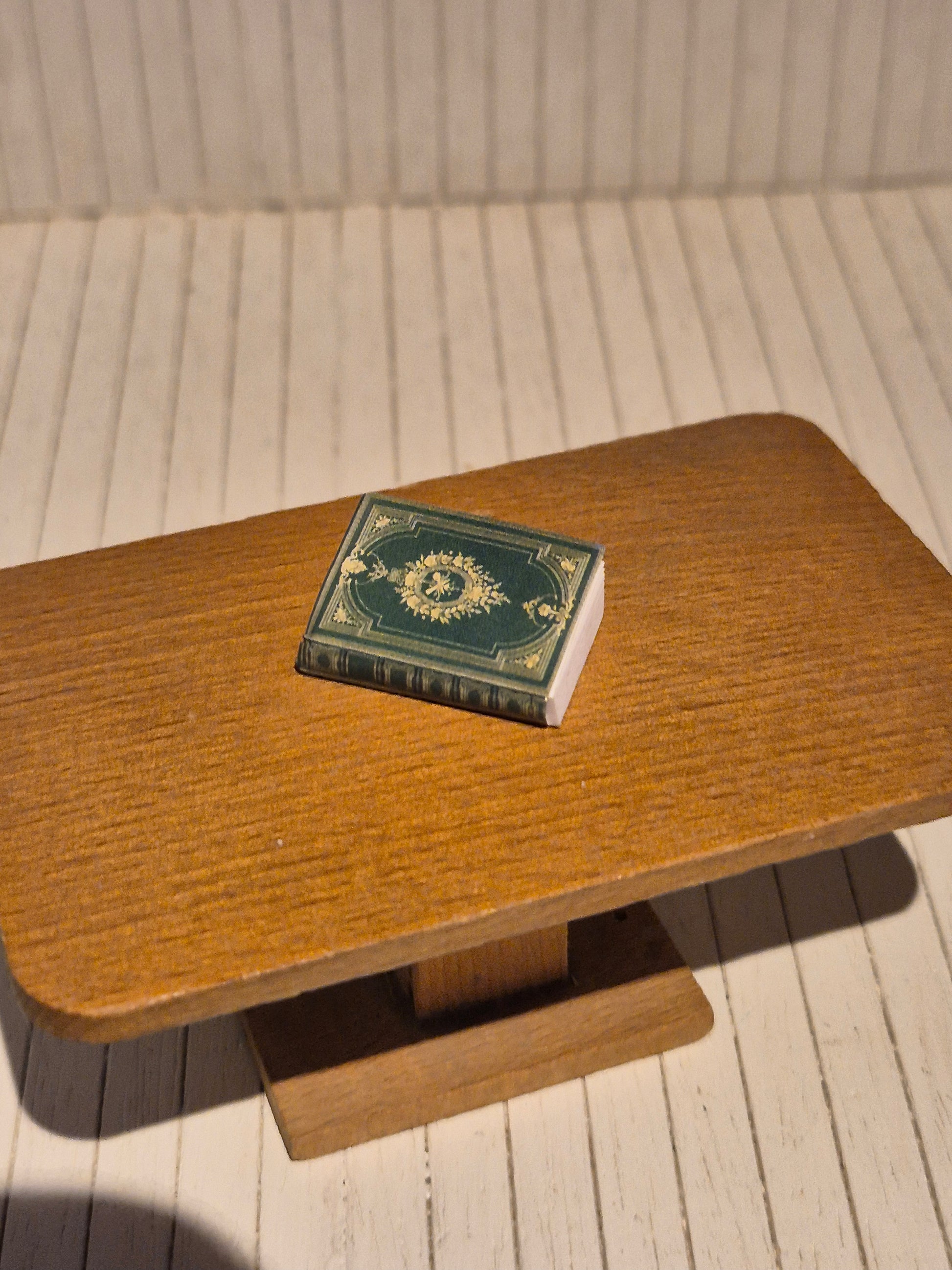 Pæn grøn bog, der har gyldne markeringer på omslaget og hvide blanke sider indeni.