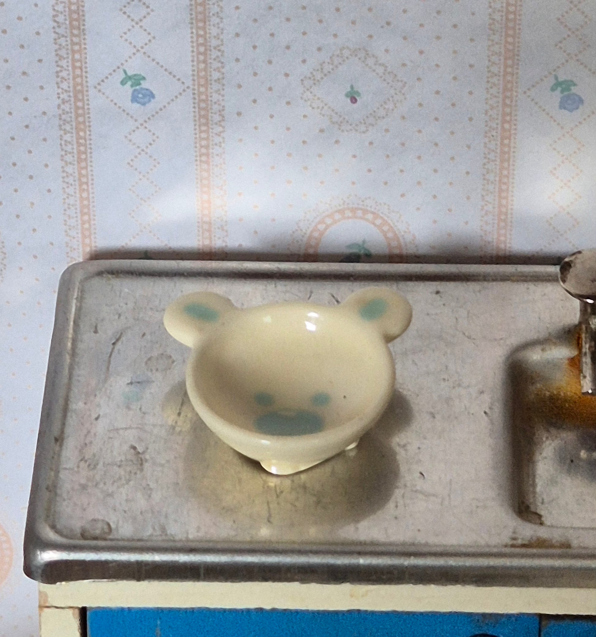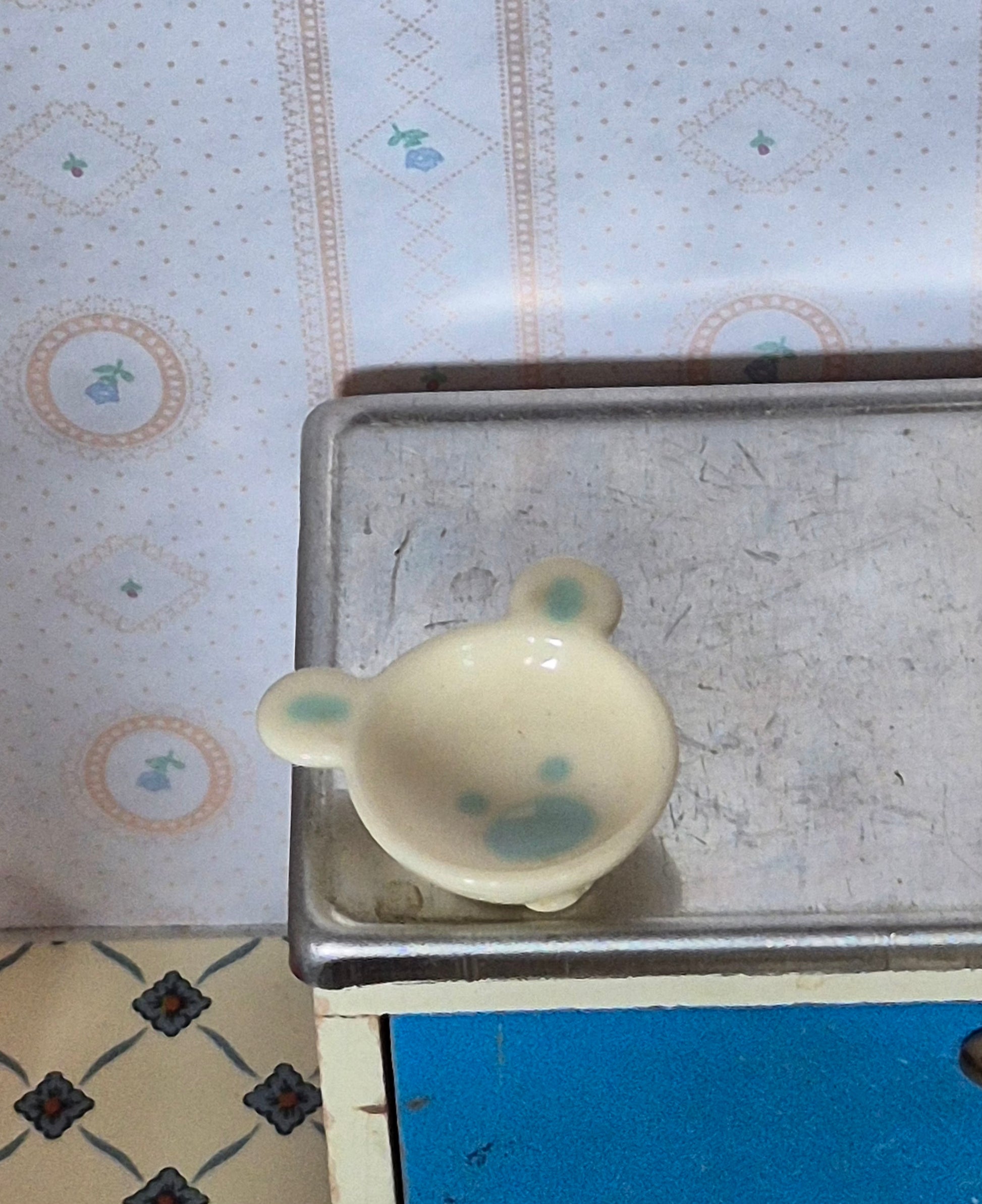 Bamse-børnetallerken med blå detaljer. Den er fin. Passer bedst til 1:12.
