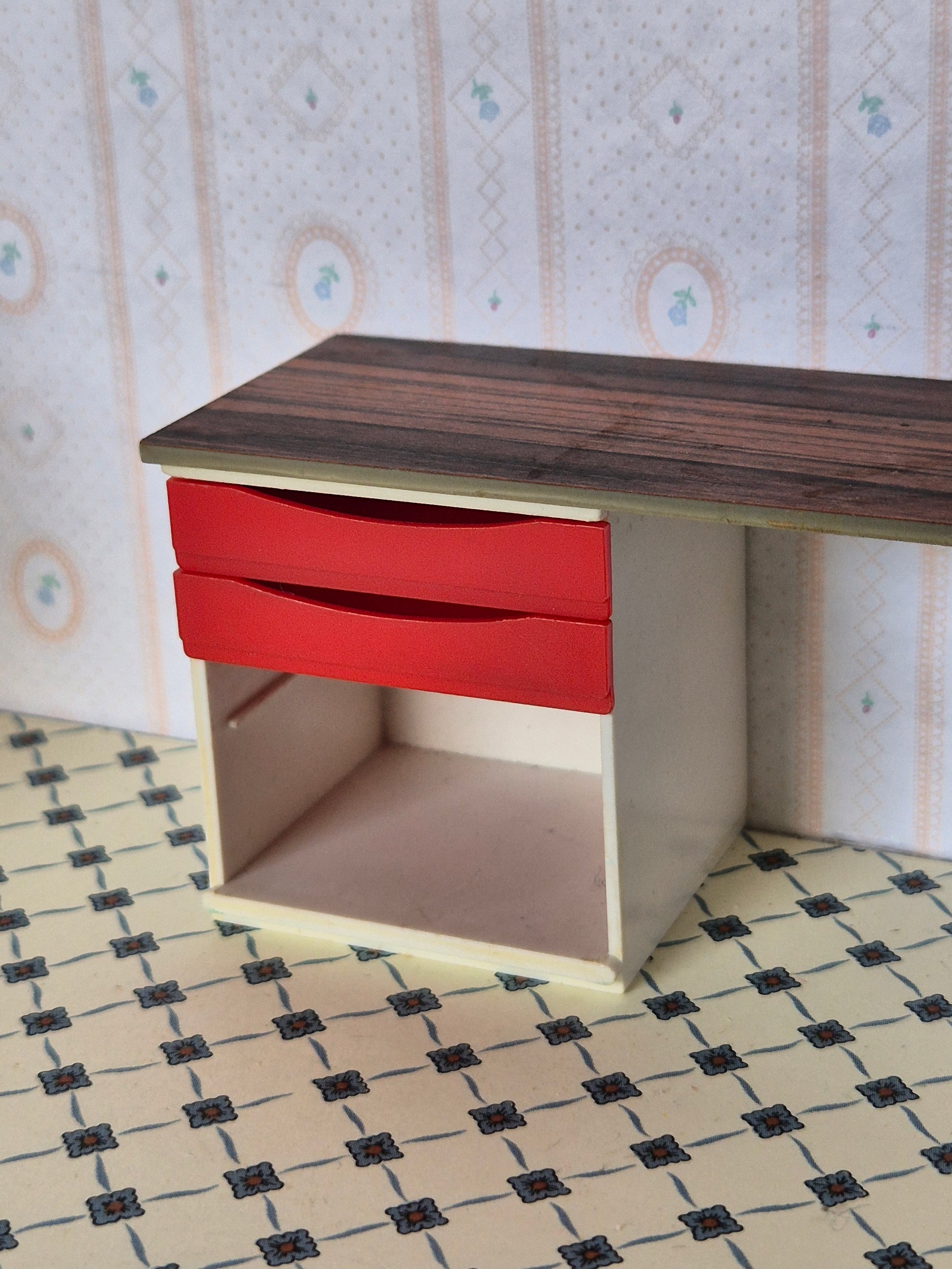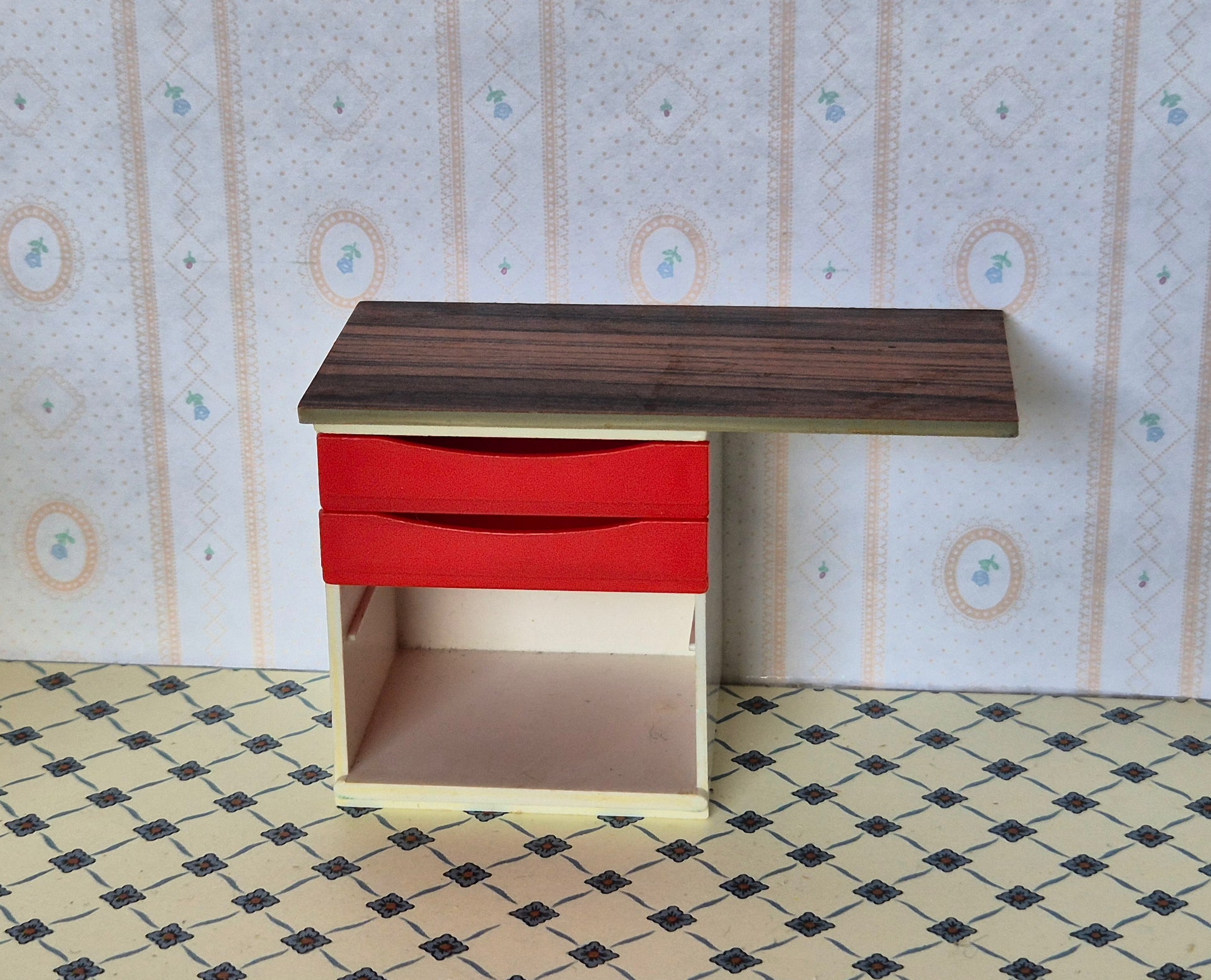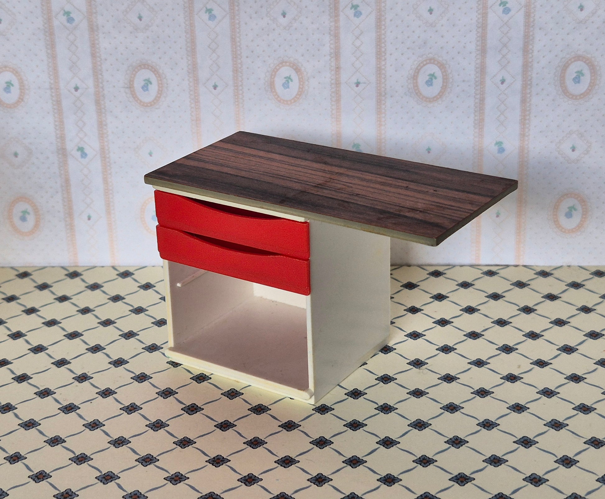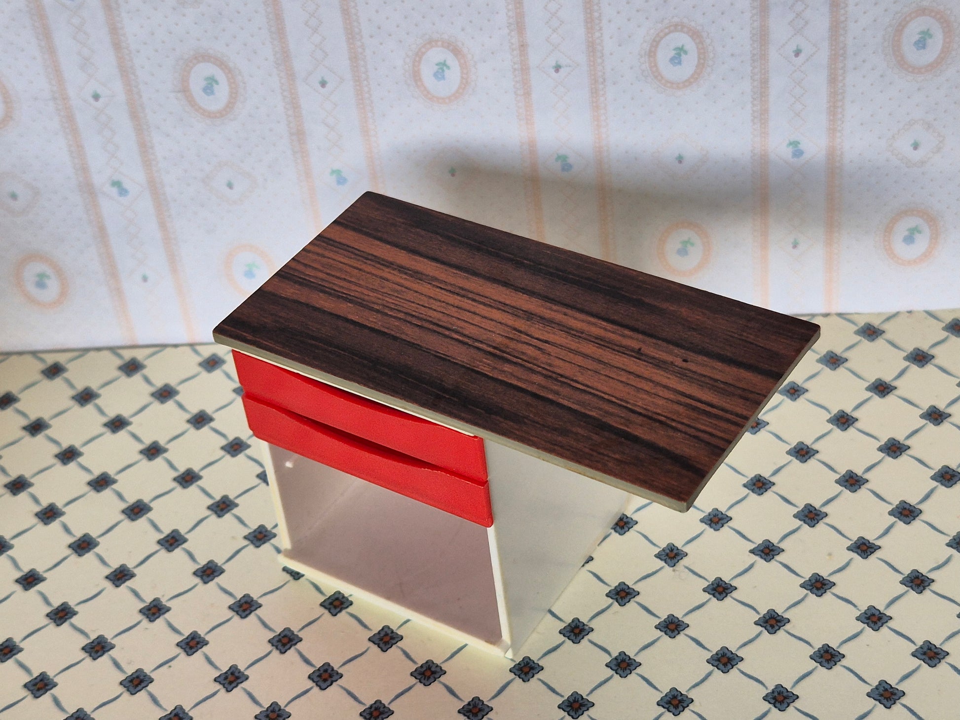 Vintage Brio køkkenbord med skuffer, dog mangler der to skuffer. Det er af plast. Str 1:16.