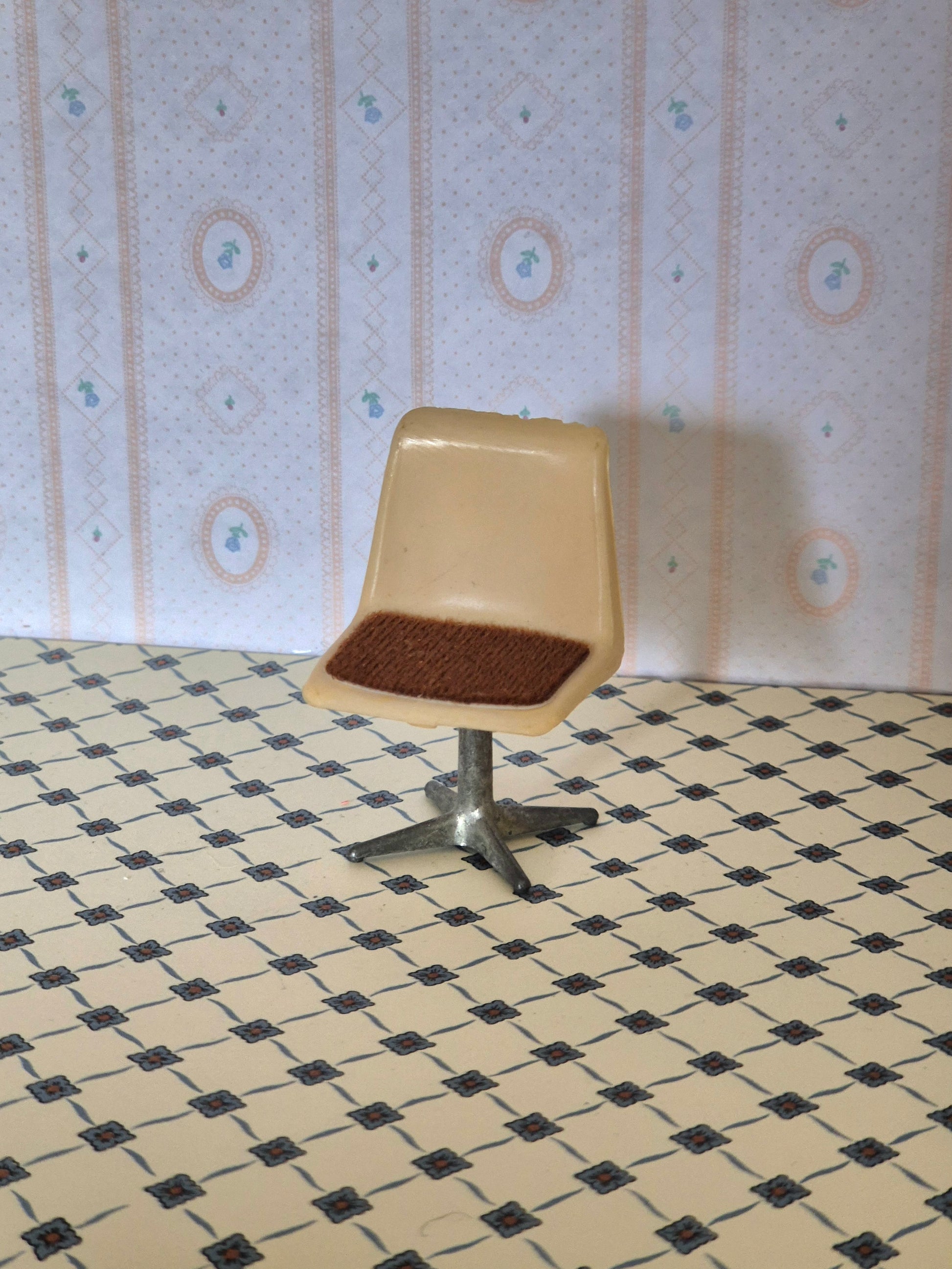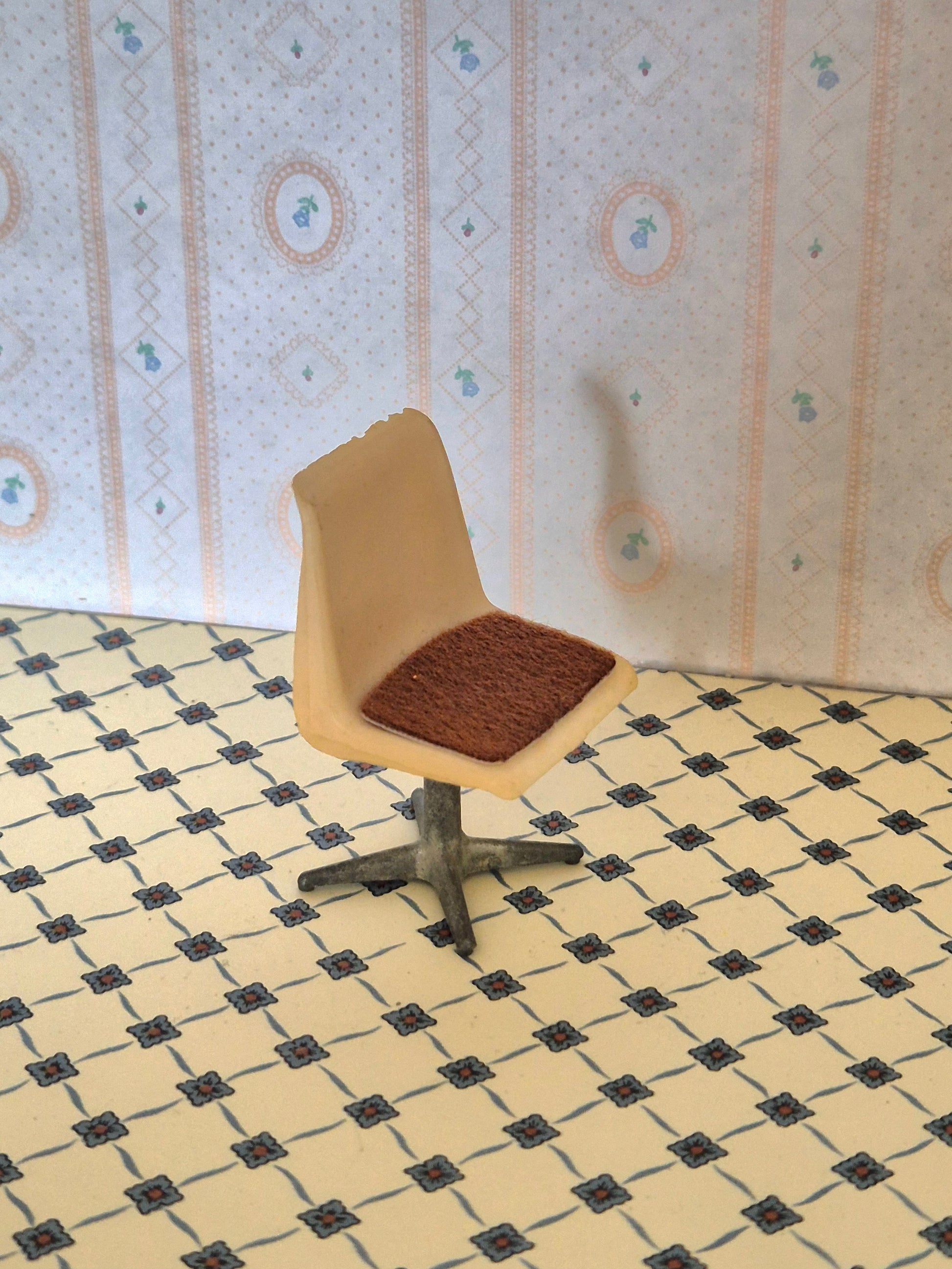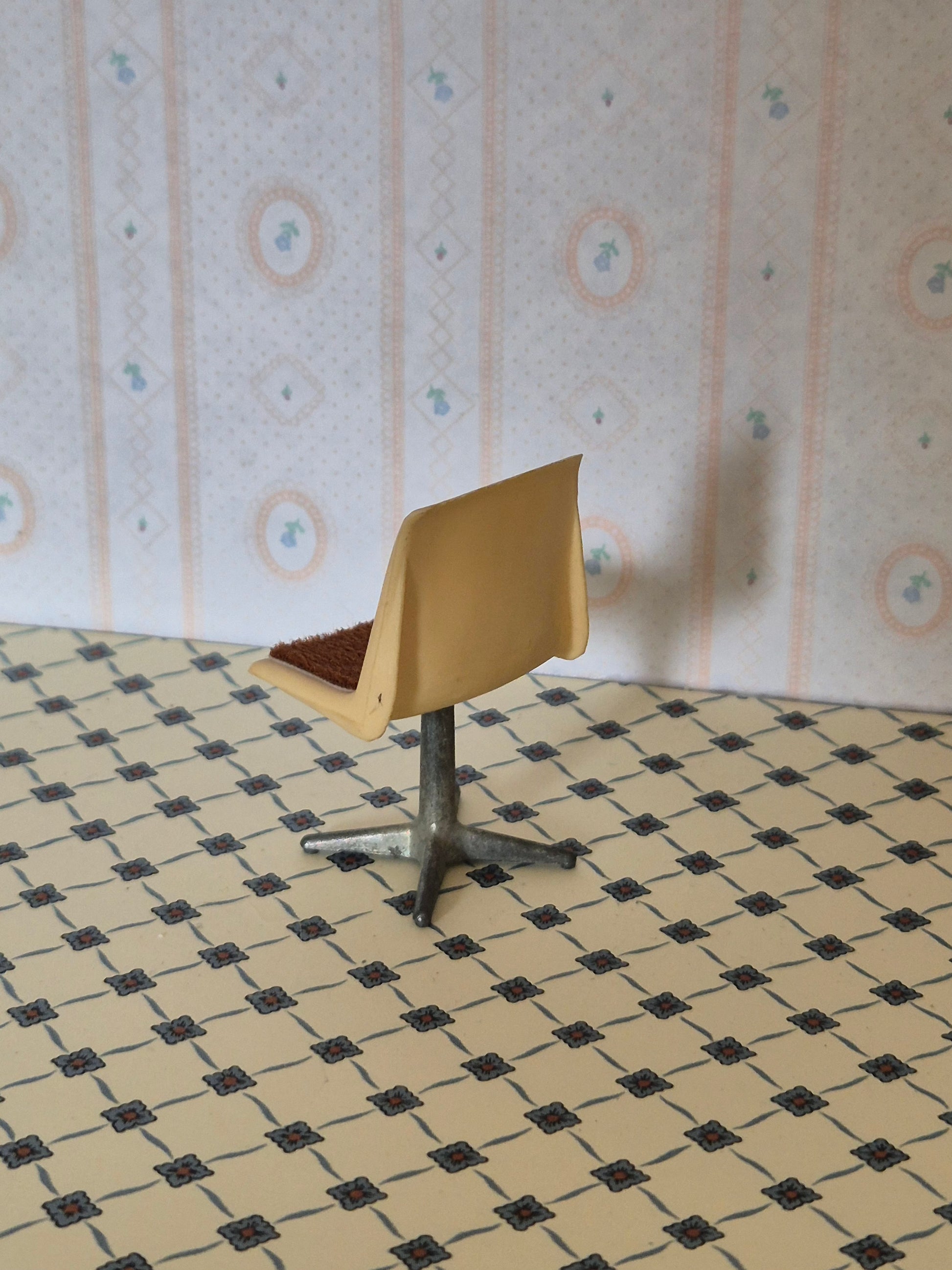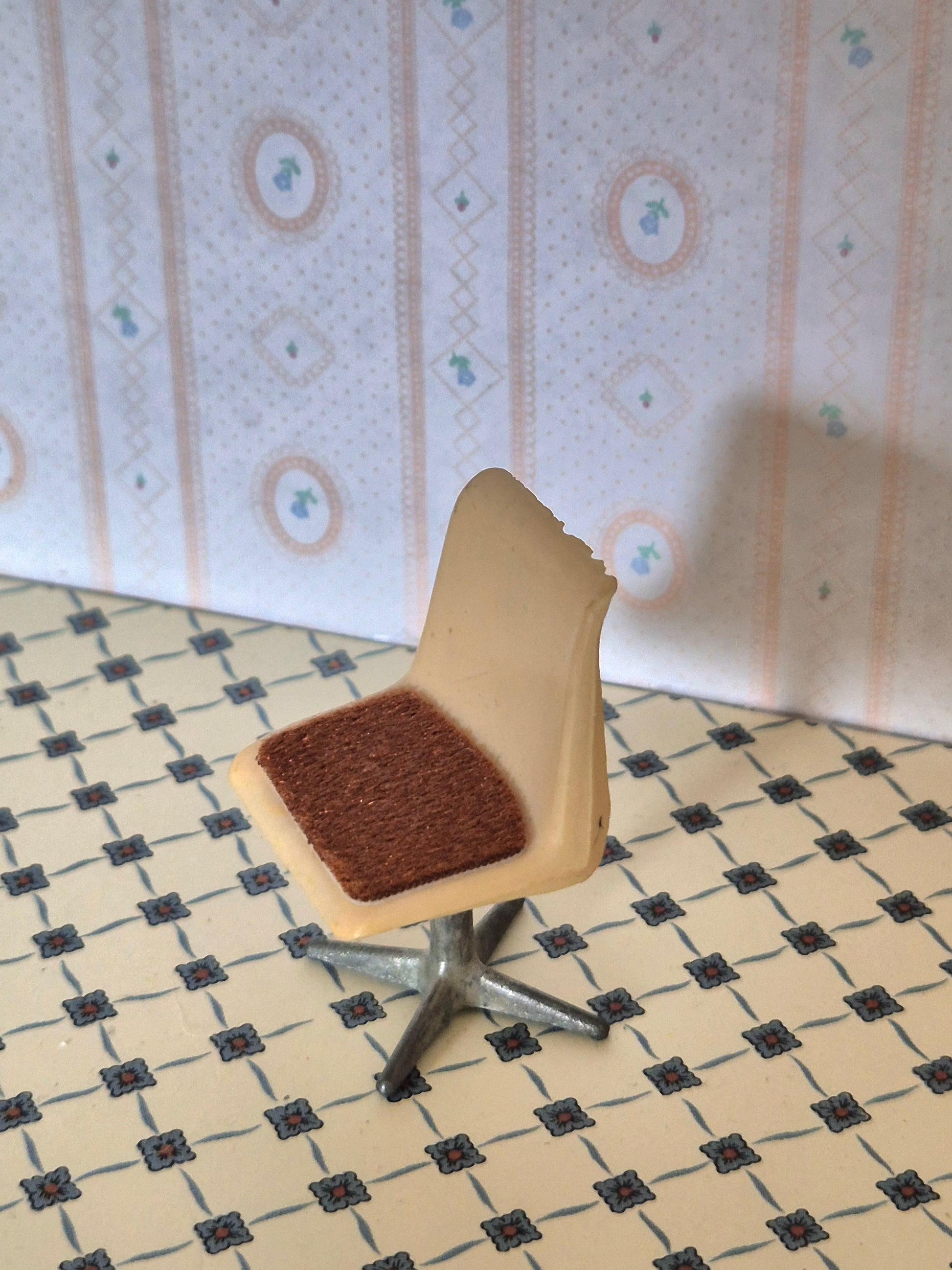 Vintage stol 1:18 af Caroline Home. Den ses sjældent i Danmark. Den er af plast med metal fod. Den har nogle skrammer øverst på ryglænet.