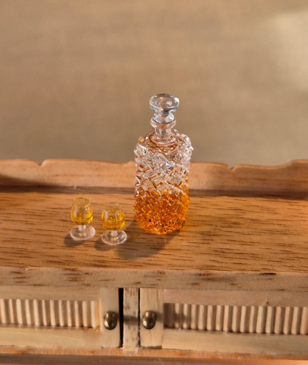 Pæn karaffel med gul spiritus + 2 små fyldte drikkeglas.