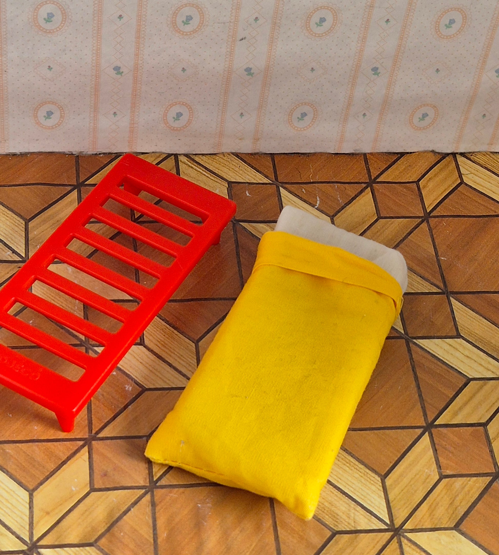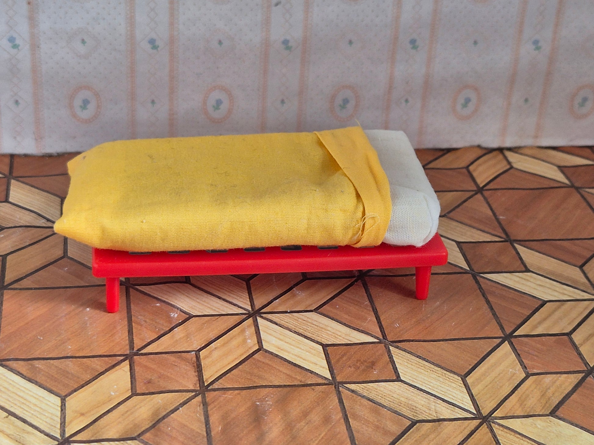 Enkelt seng til børneværelset af Djeco 1:16. Pæn stand, sengetøjet er lidt bøjet.