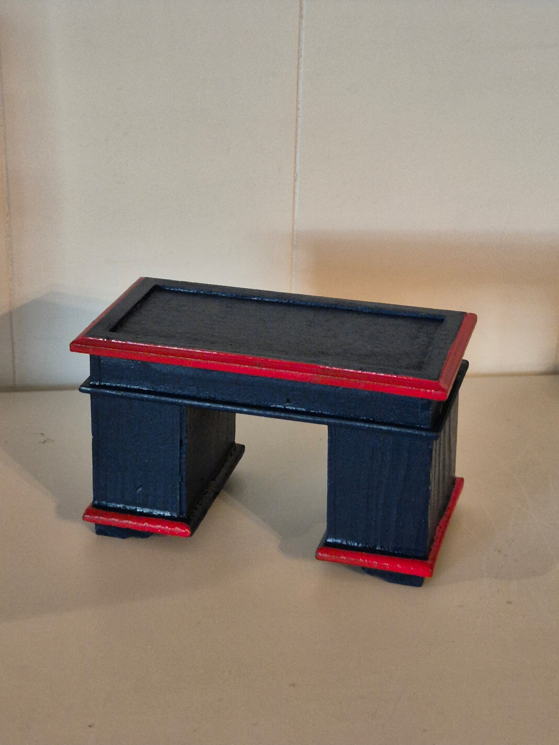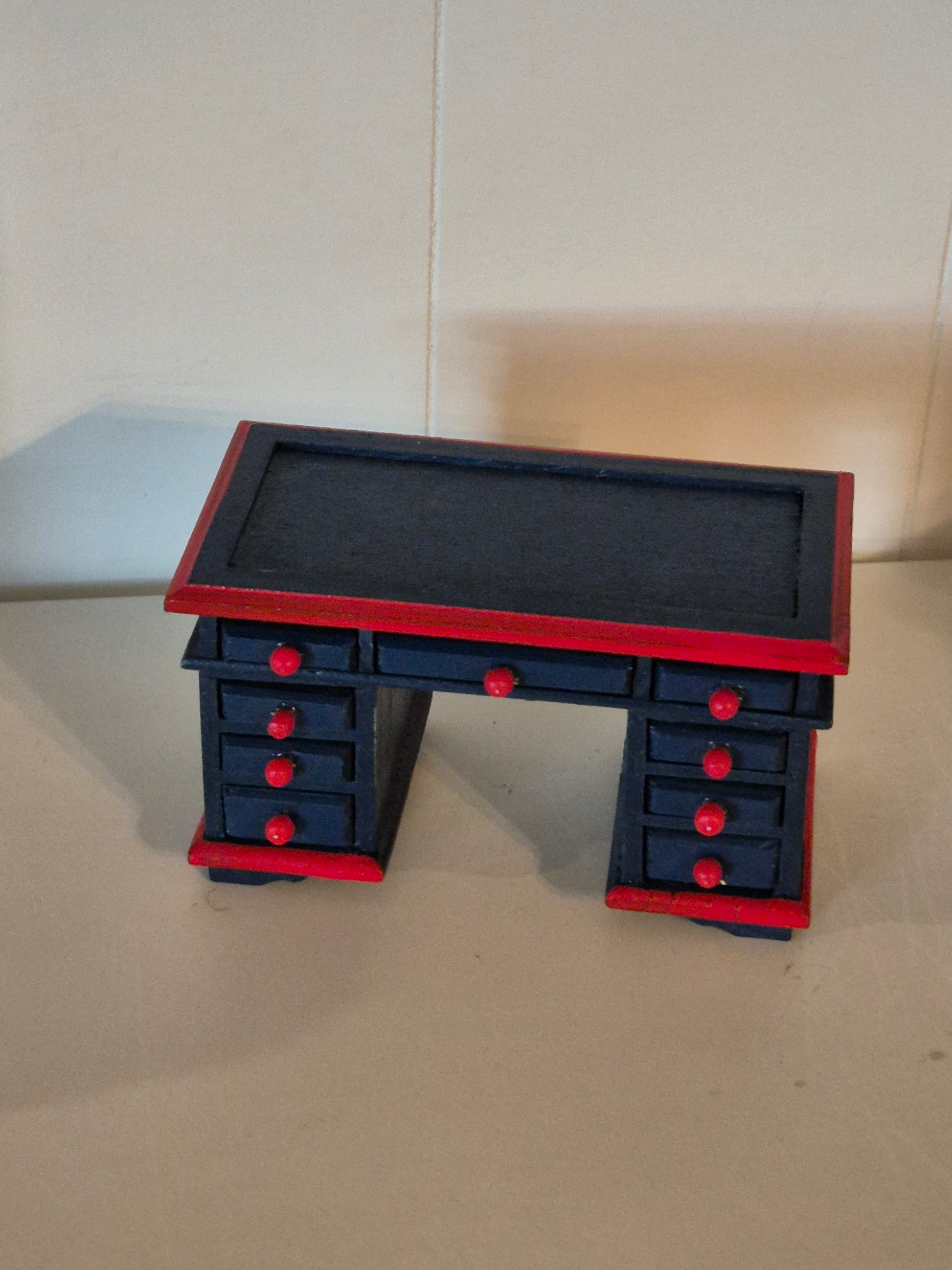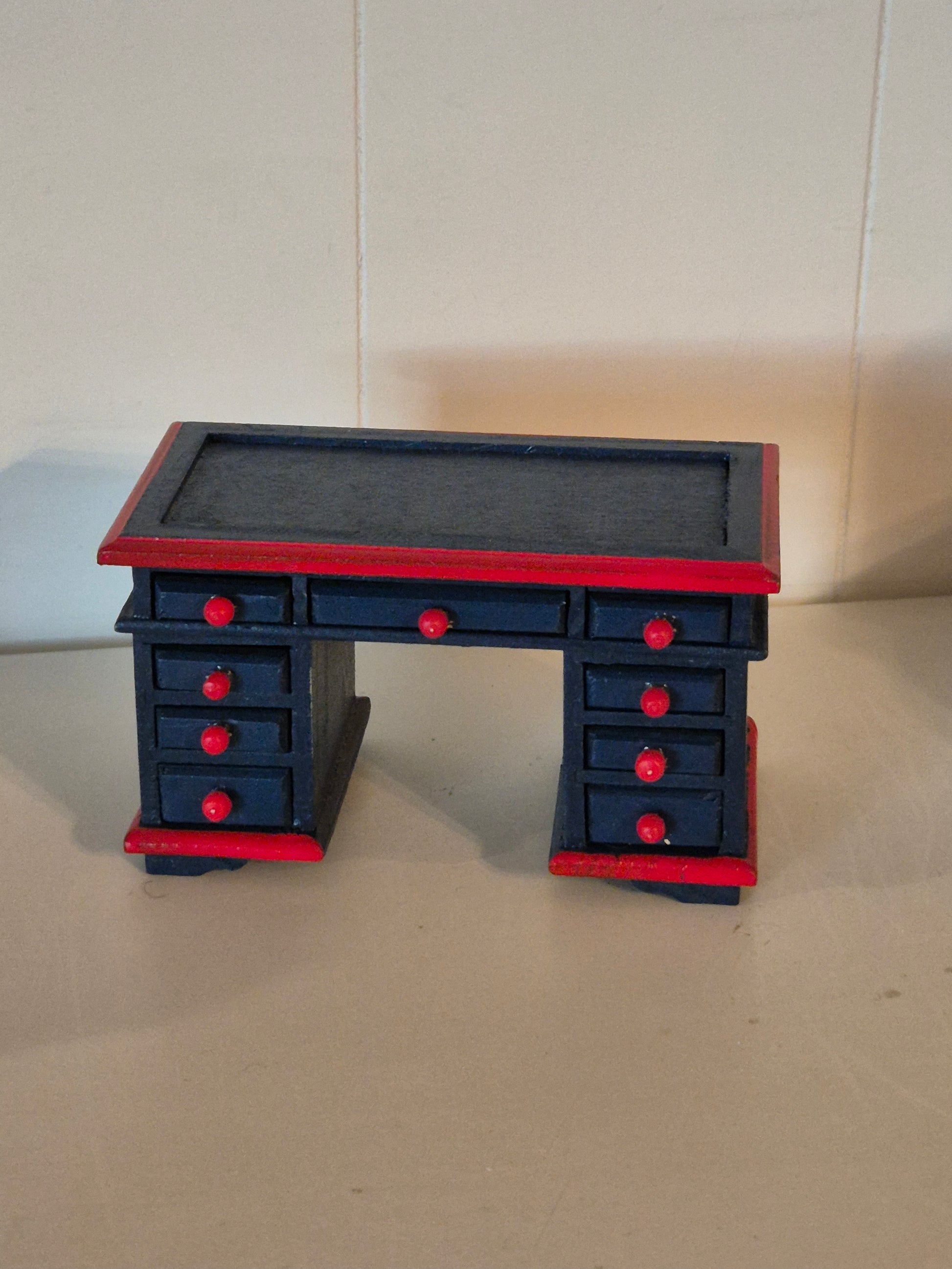 1:12 Dukkehusmøbel af mærket Dora Kuhn i den karakteristiske mørkeblå nuance med de røde detaljer og håndtag.