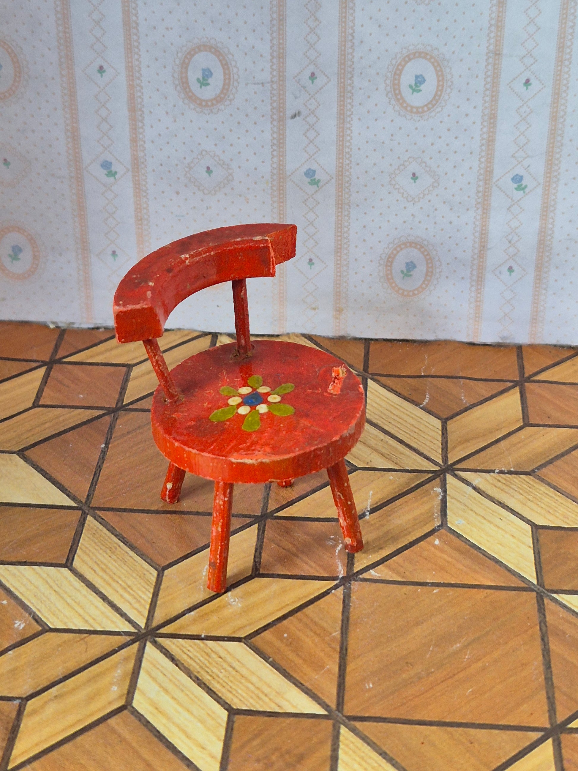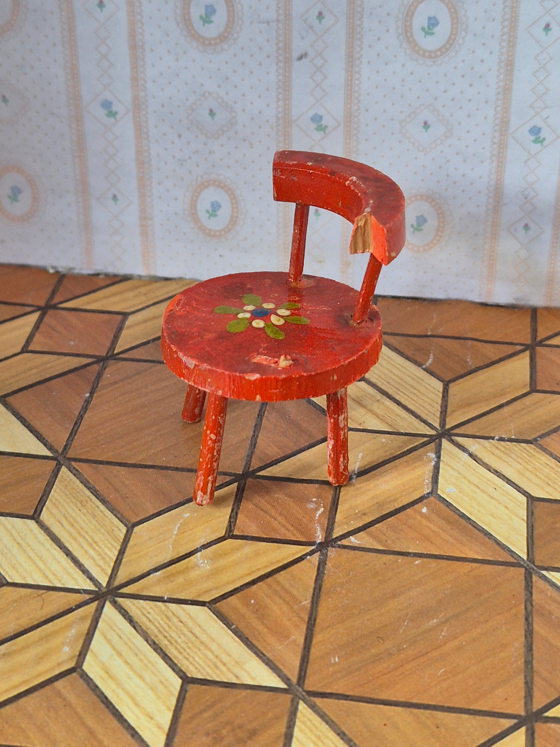 Vintage 1:16 stol i rød med blomstermotiv af det tyske mærke Dora Kuhn. Der er en del patina