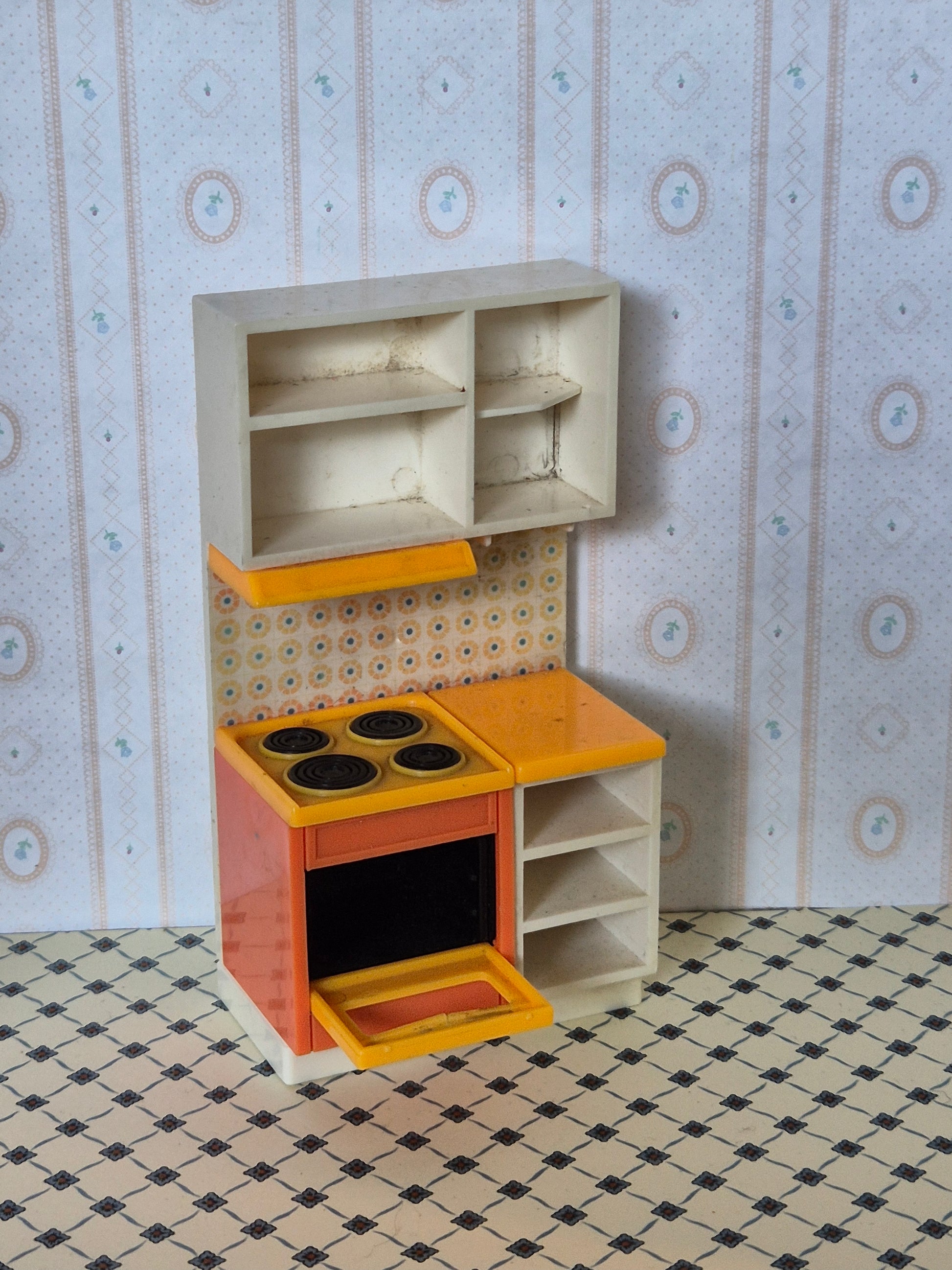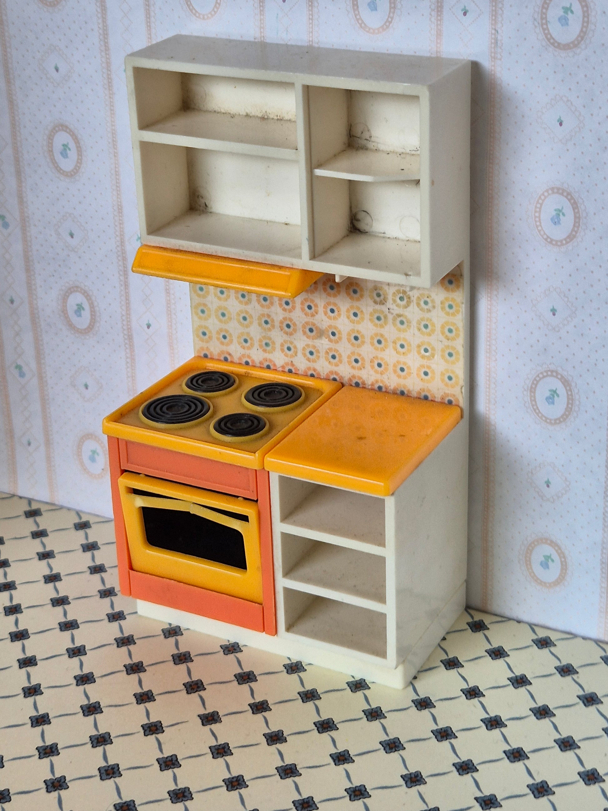 Vintage / retro komfur af plast 1:16. Det er brugt med mangler og skrammer. Der er en del patina.
