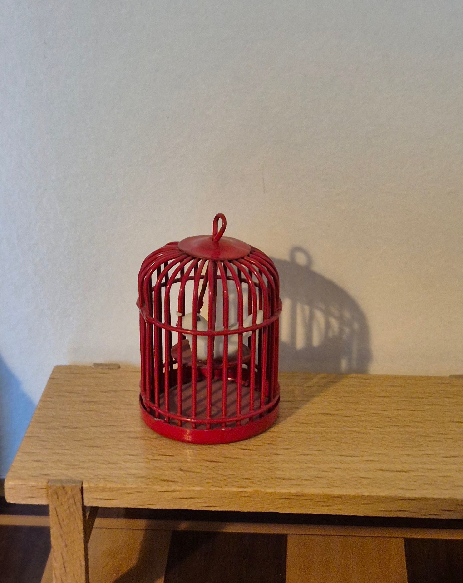 Udmærket pænt fuglebur af rødt metal. Der er patina og skrammer
