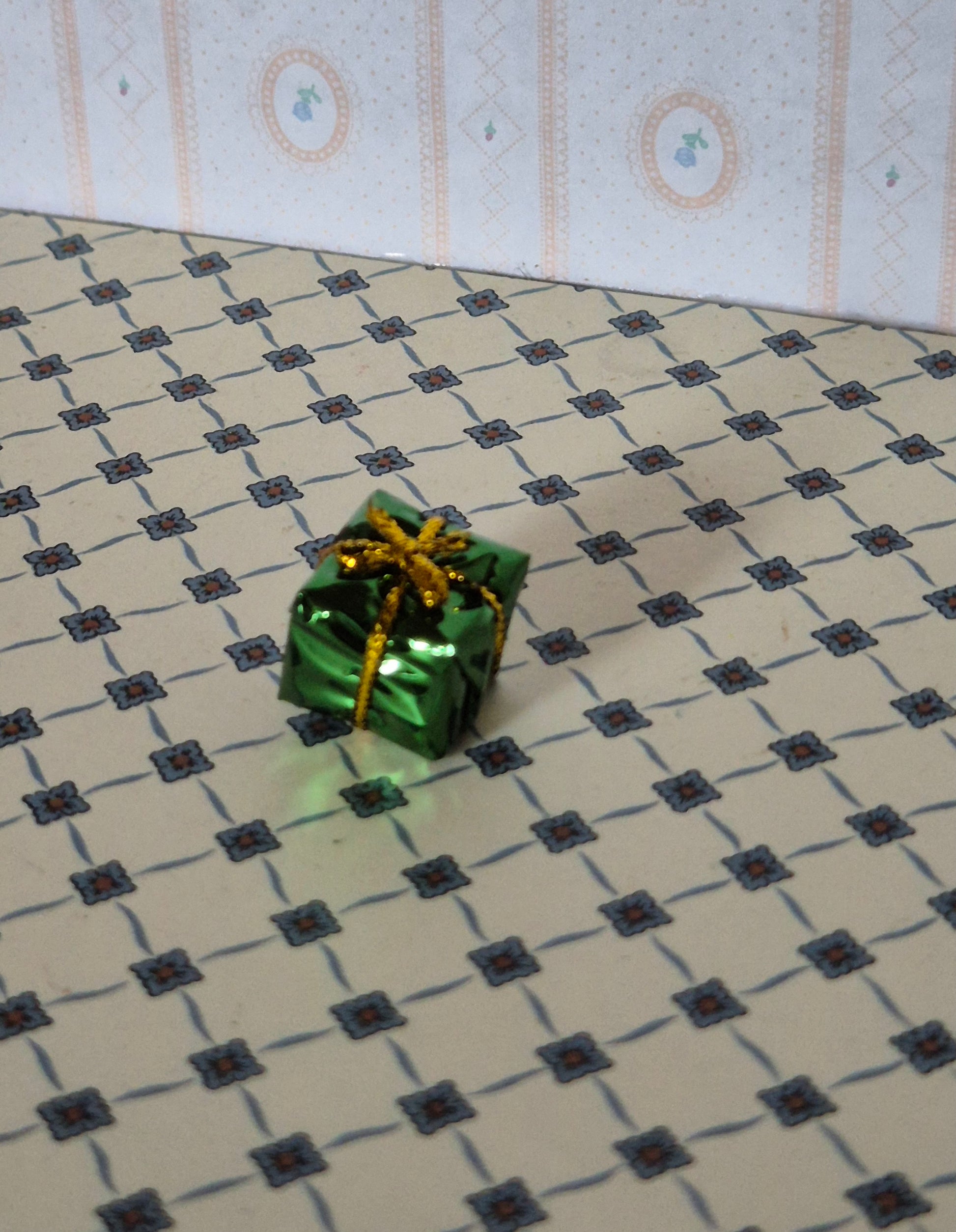 Pæn og fin gave i grønt metallisk papir med guld-snor.