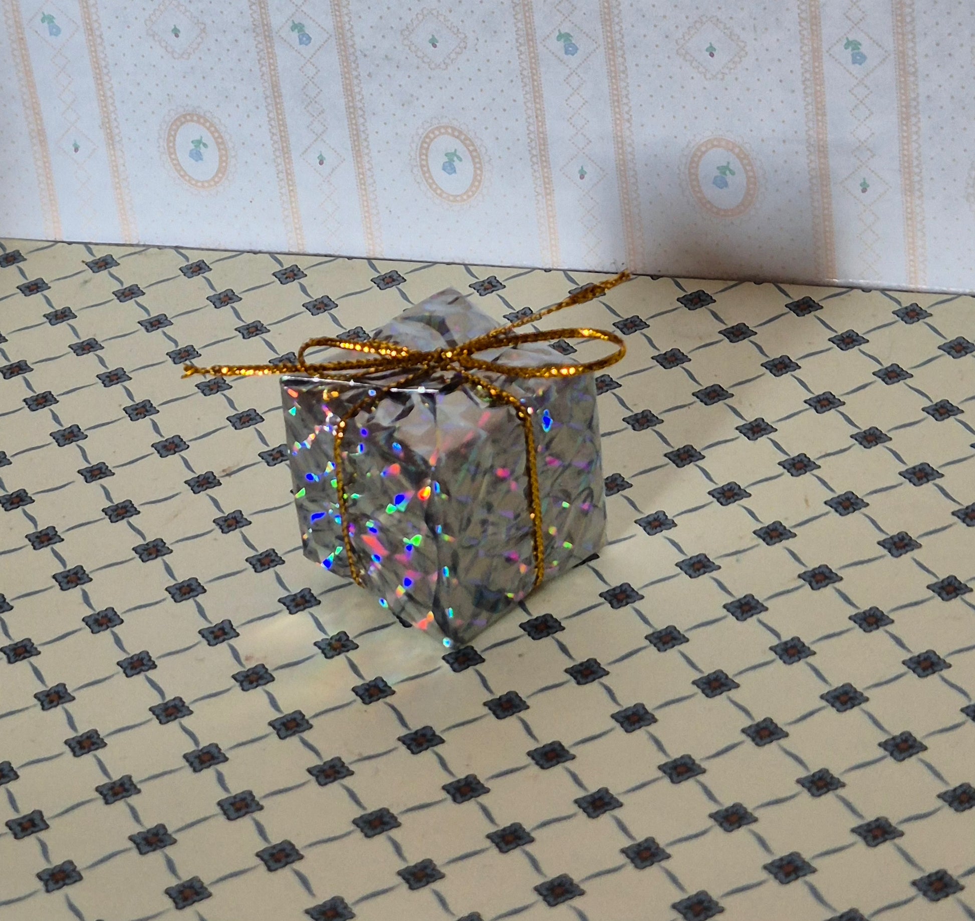 Pæn gave i skinnende papir med guld-snor.