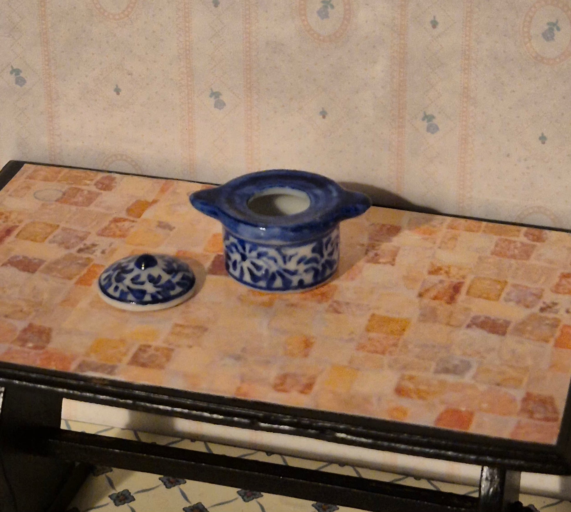 Pæn blå gryde med mønster. God stand. Pæn. Den er ca 2,4 cm høj.
