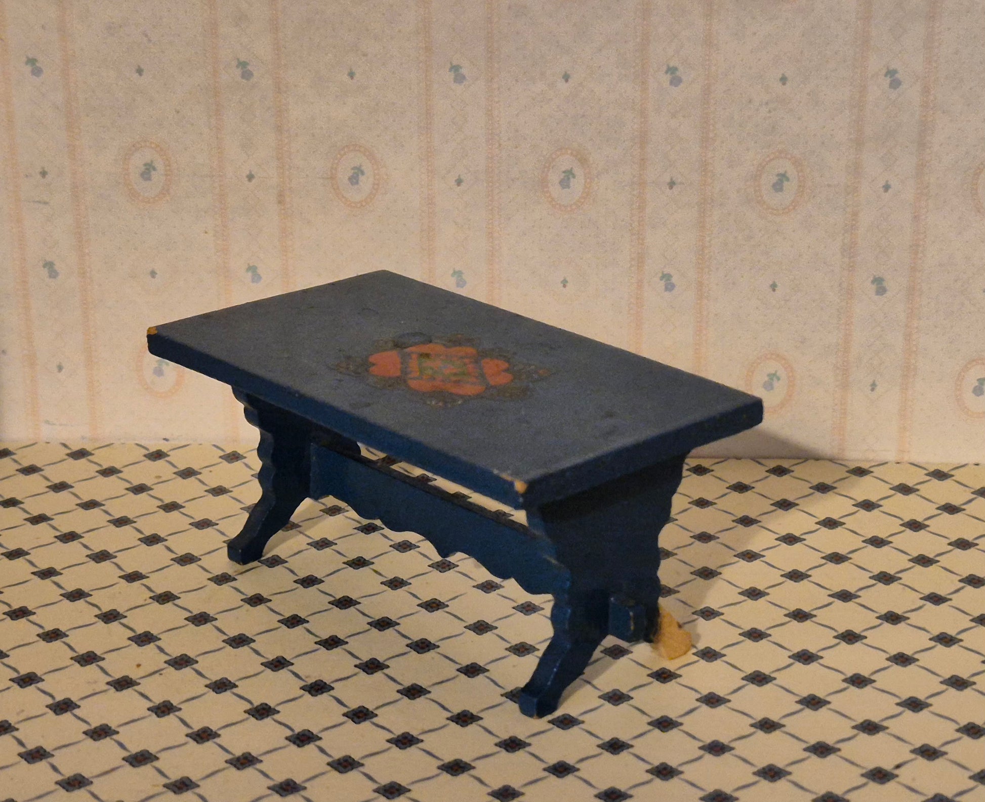 Udmærket bord i mørkeblå almue stil af træ. Den ene fod har en skade. Derudover Udmærket stand.