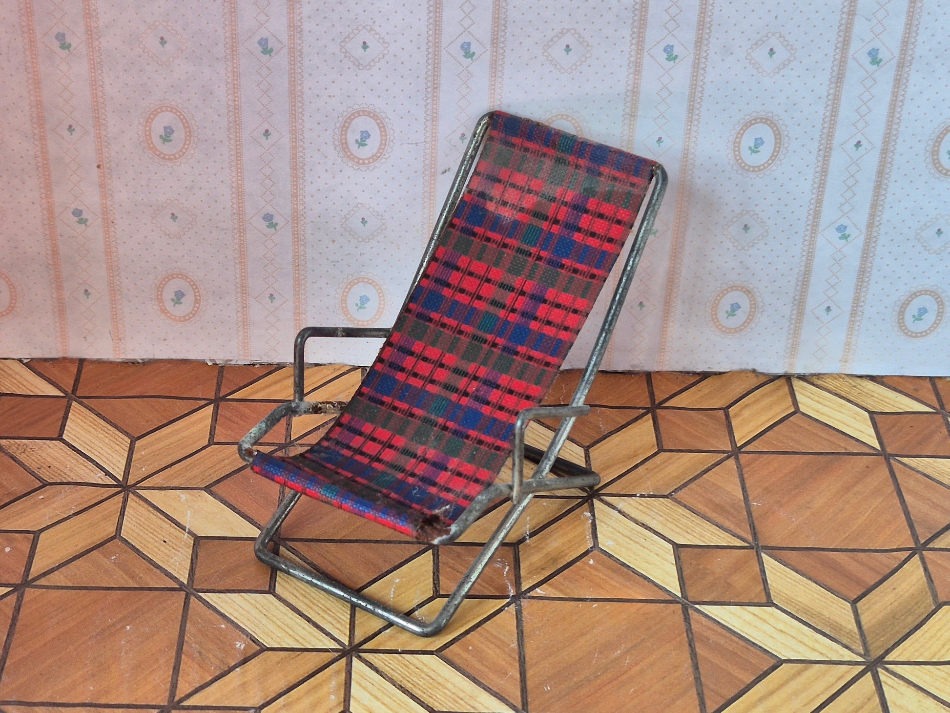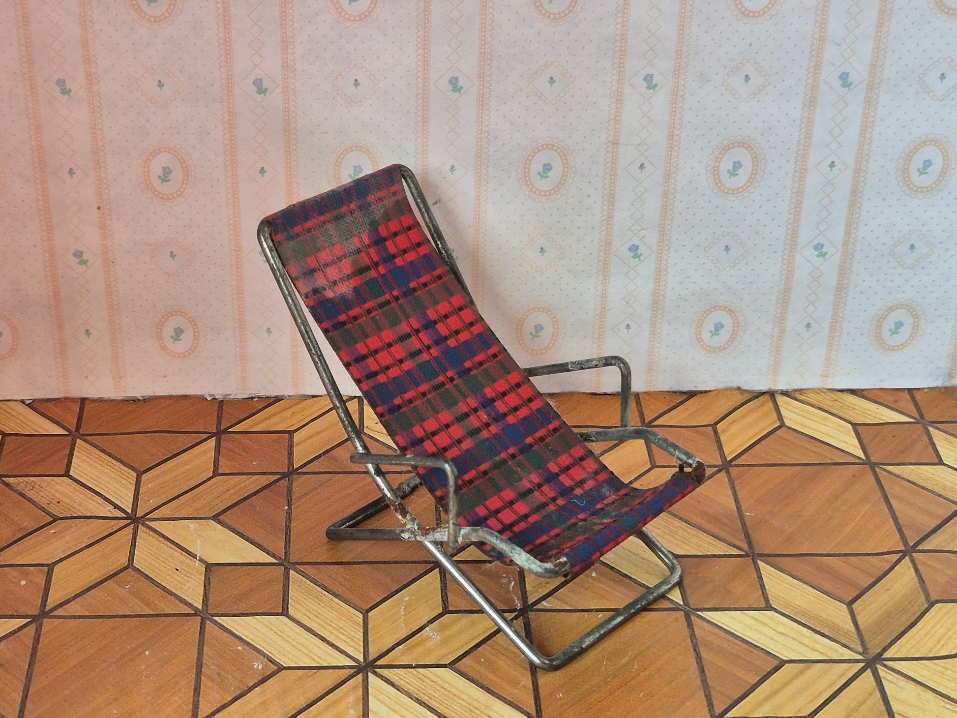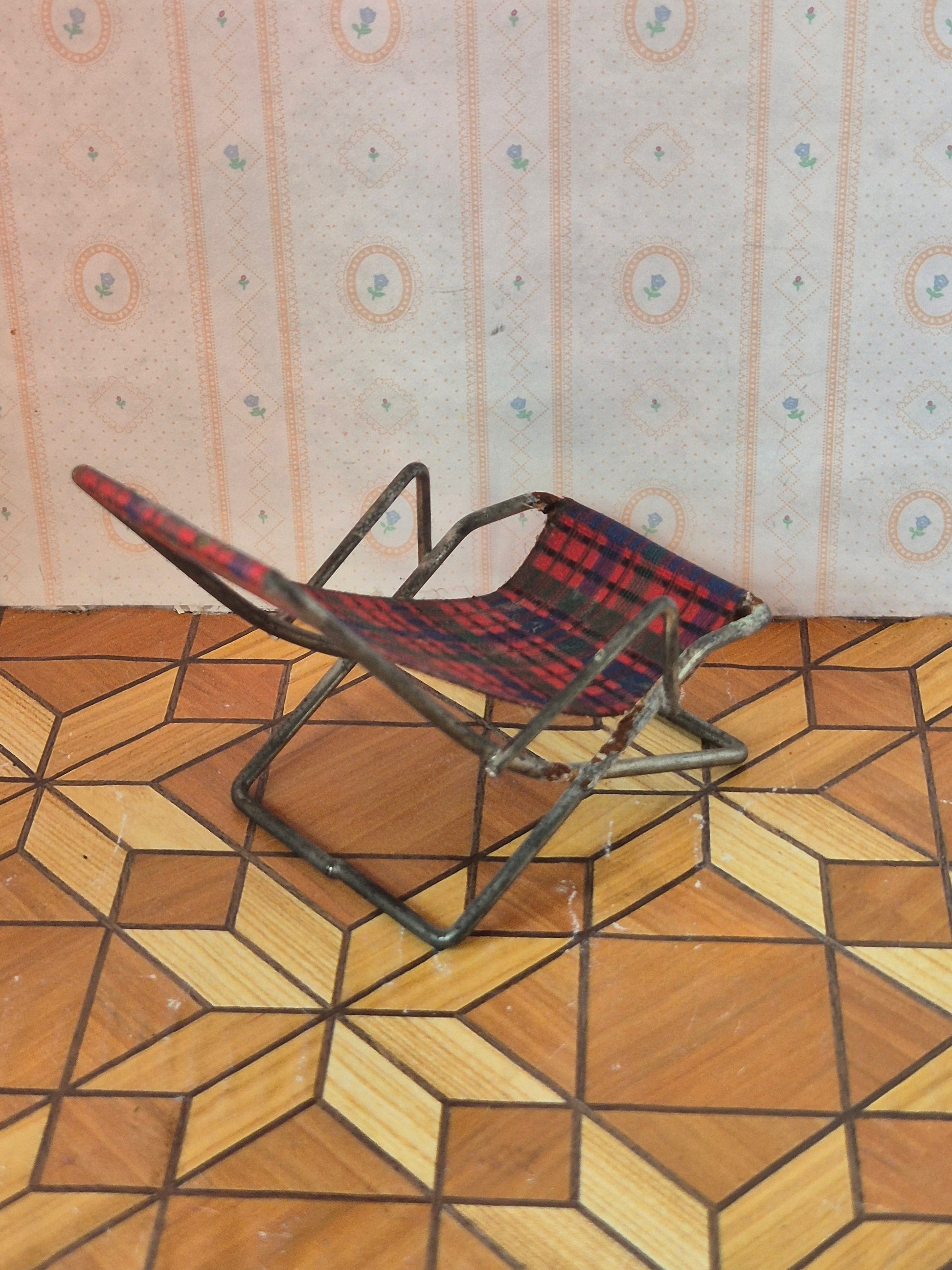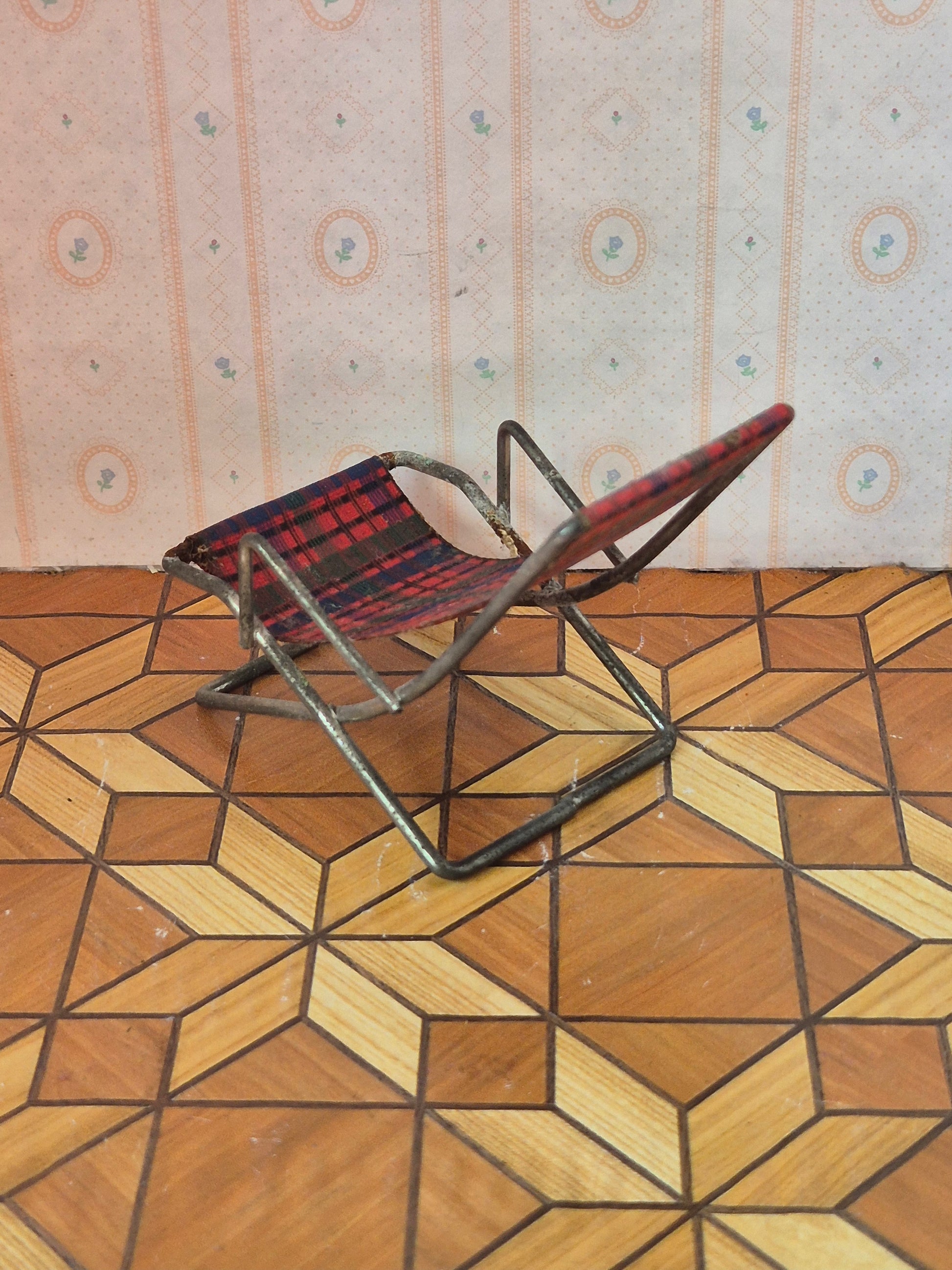 Original vintage liggestol til haven af metal og stof str 1:16, ternet sæde, af mærket Hanse af Skandinavien.