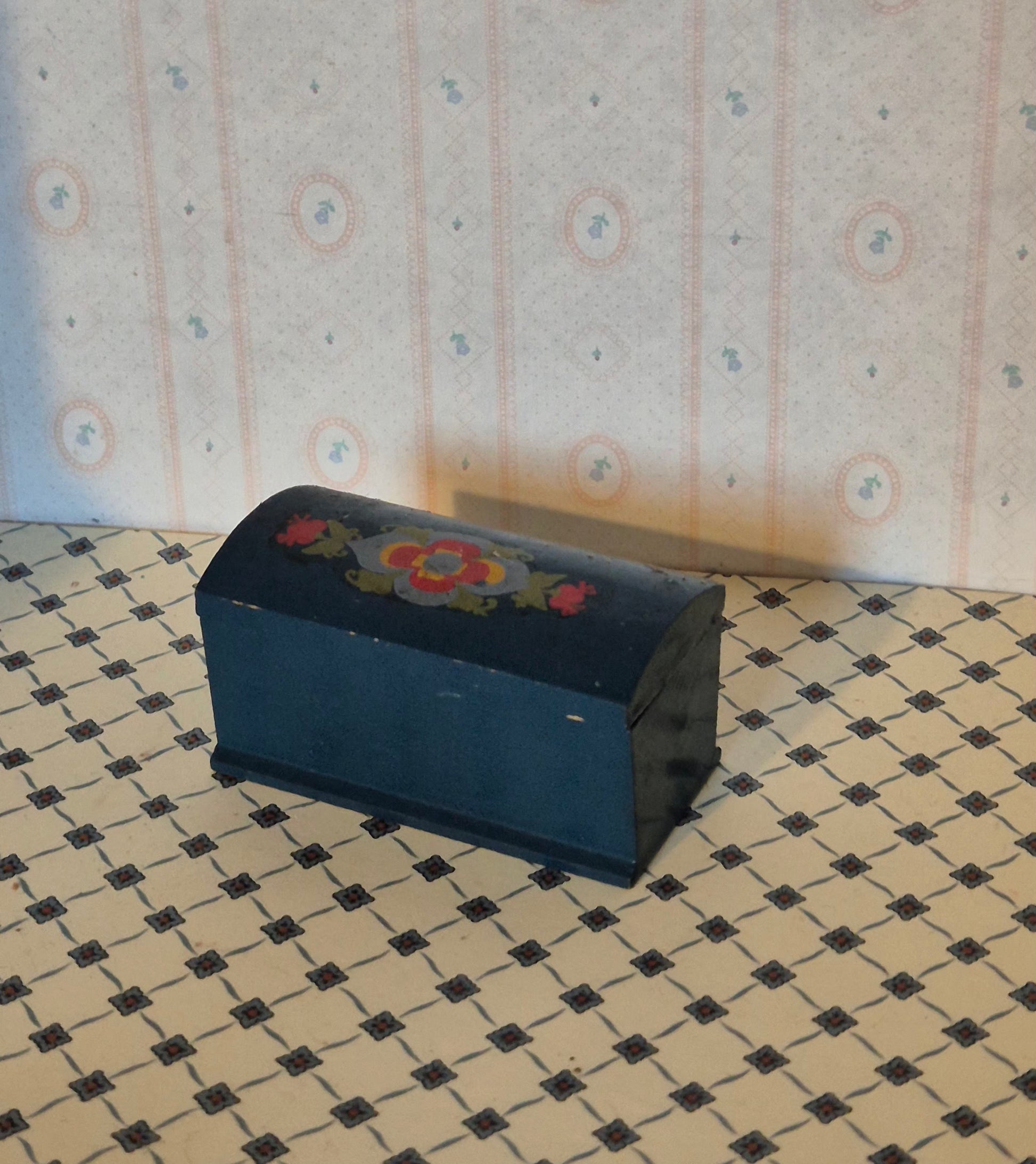 Pæn almue mørkeblå kiste med blomstermotiv til dukkehuset str 1:16 af mærket Hanse af Skandinavien.